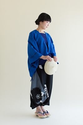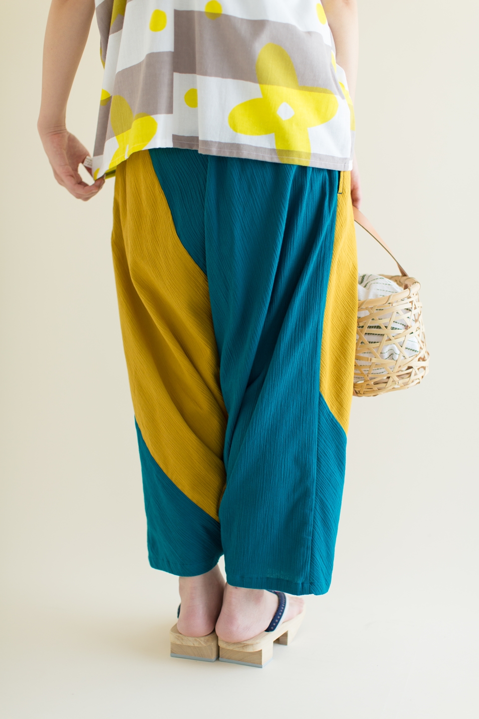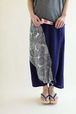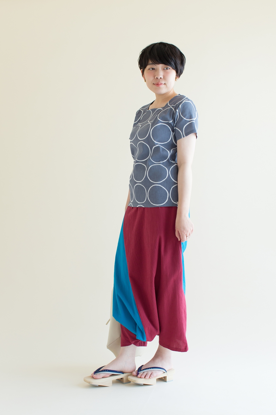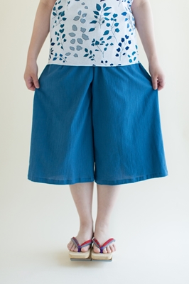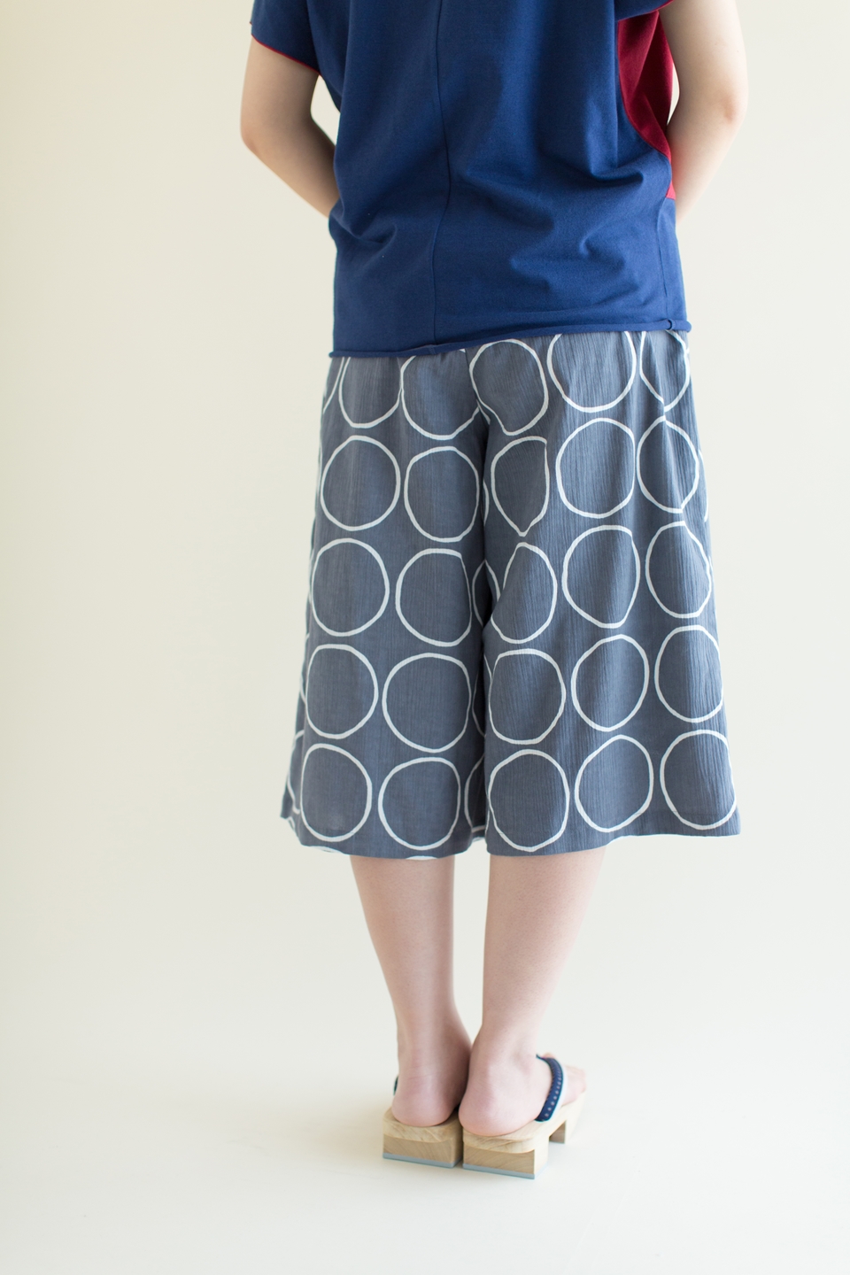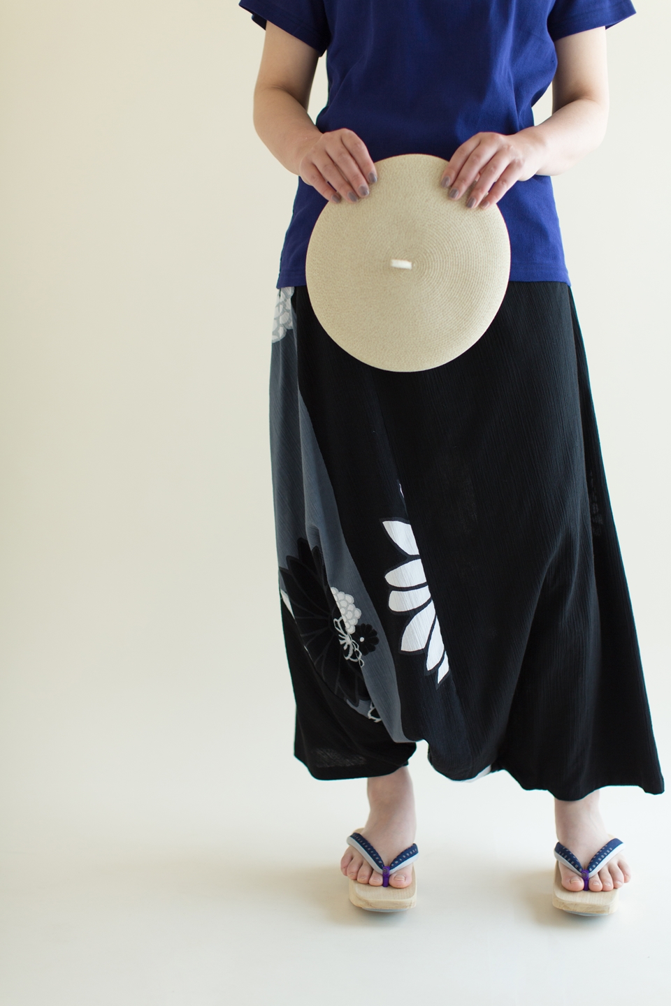 名前の通り広い形のもんぺ。ふくらはぎまでの丈から”はぎ丈”と名づけました。