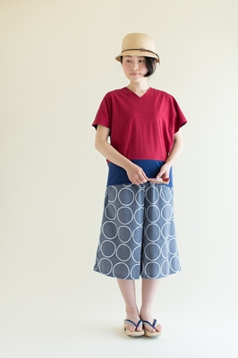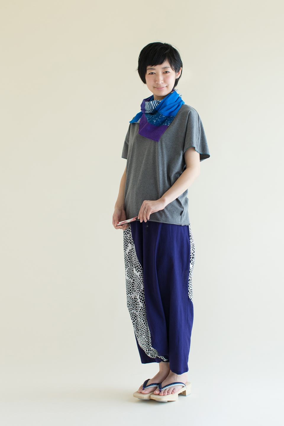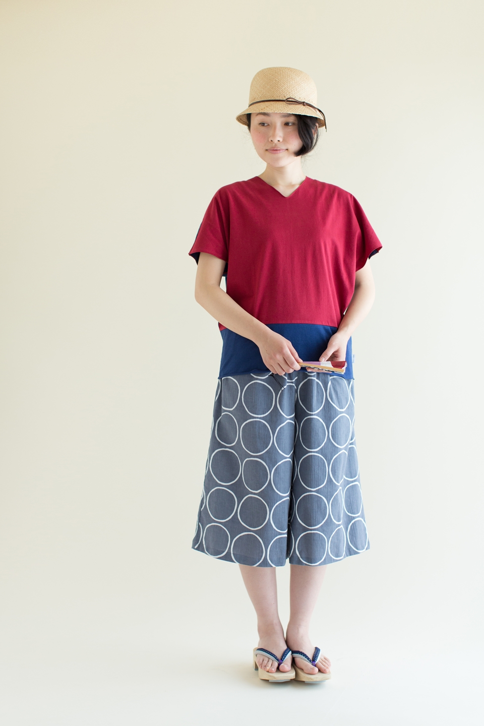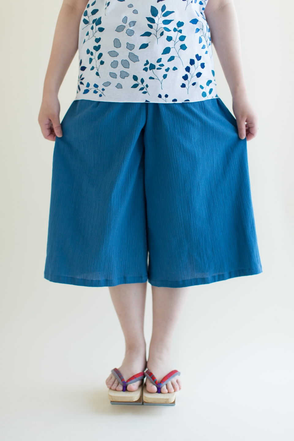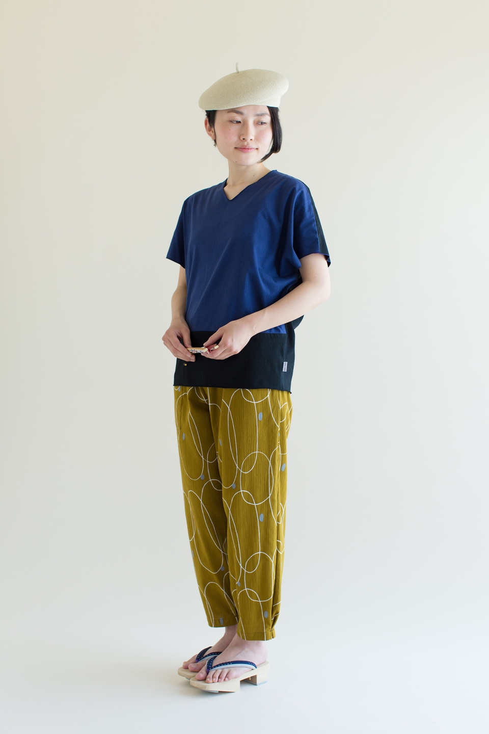 名前の通り広い形のもんぺ。ふくらはぎまでの丈から”はぎ丈”と名づけました。