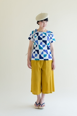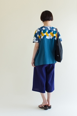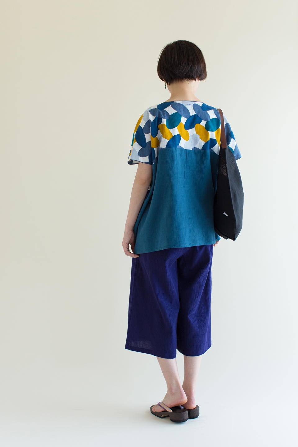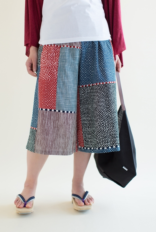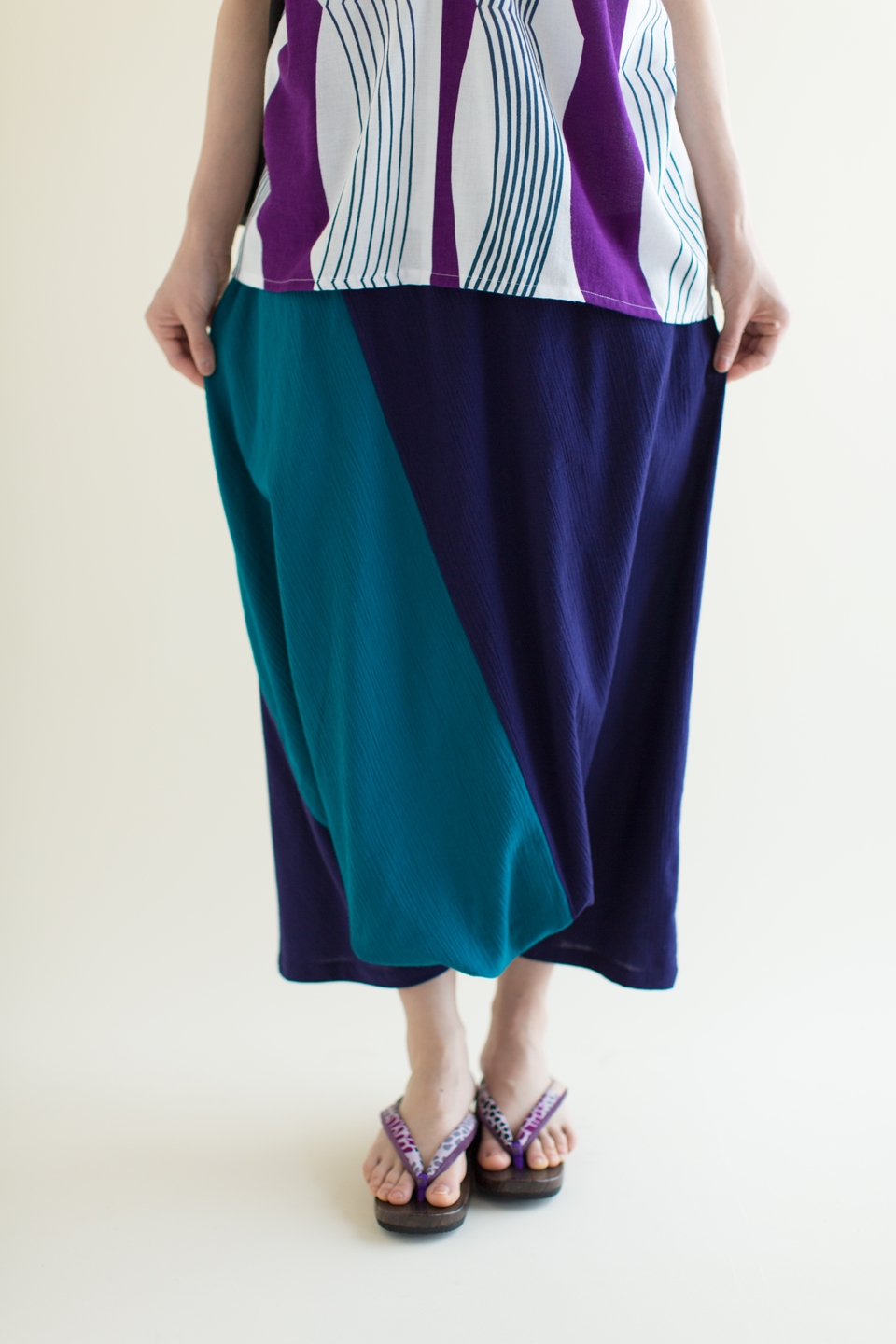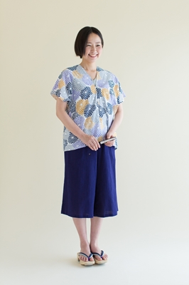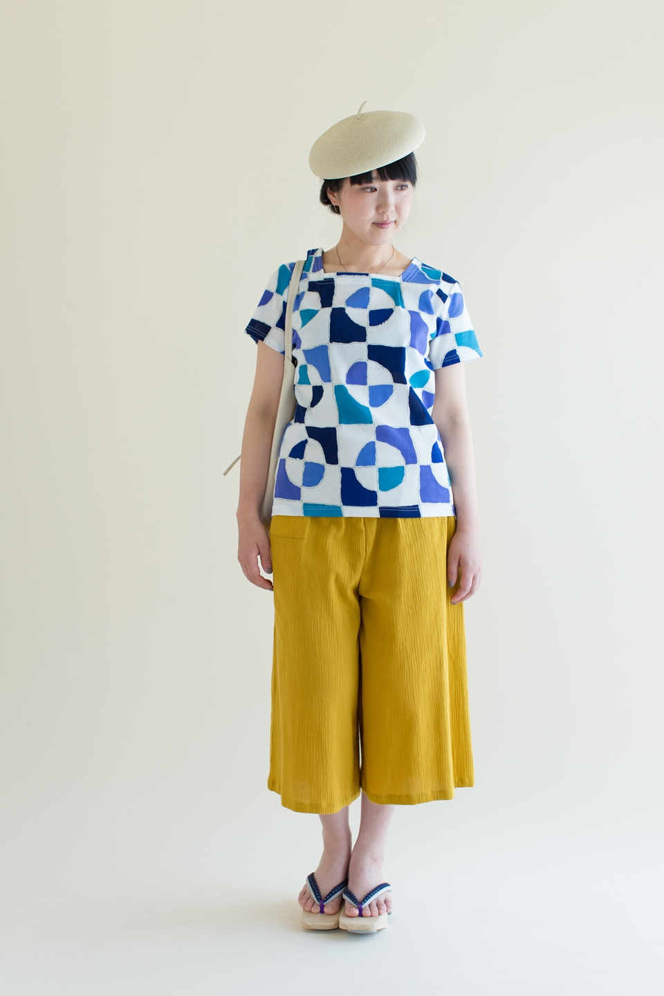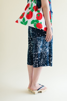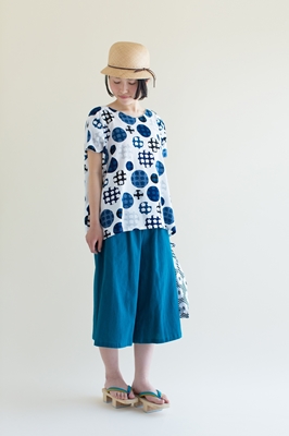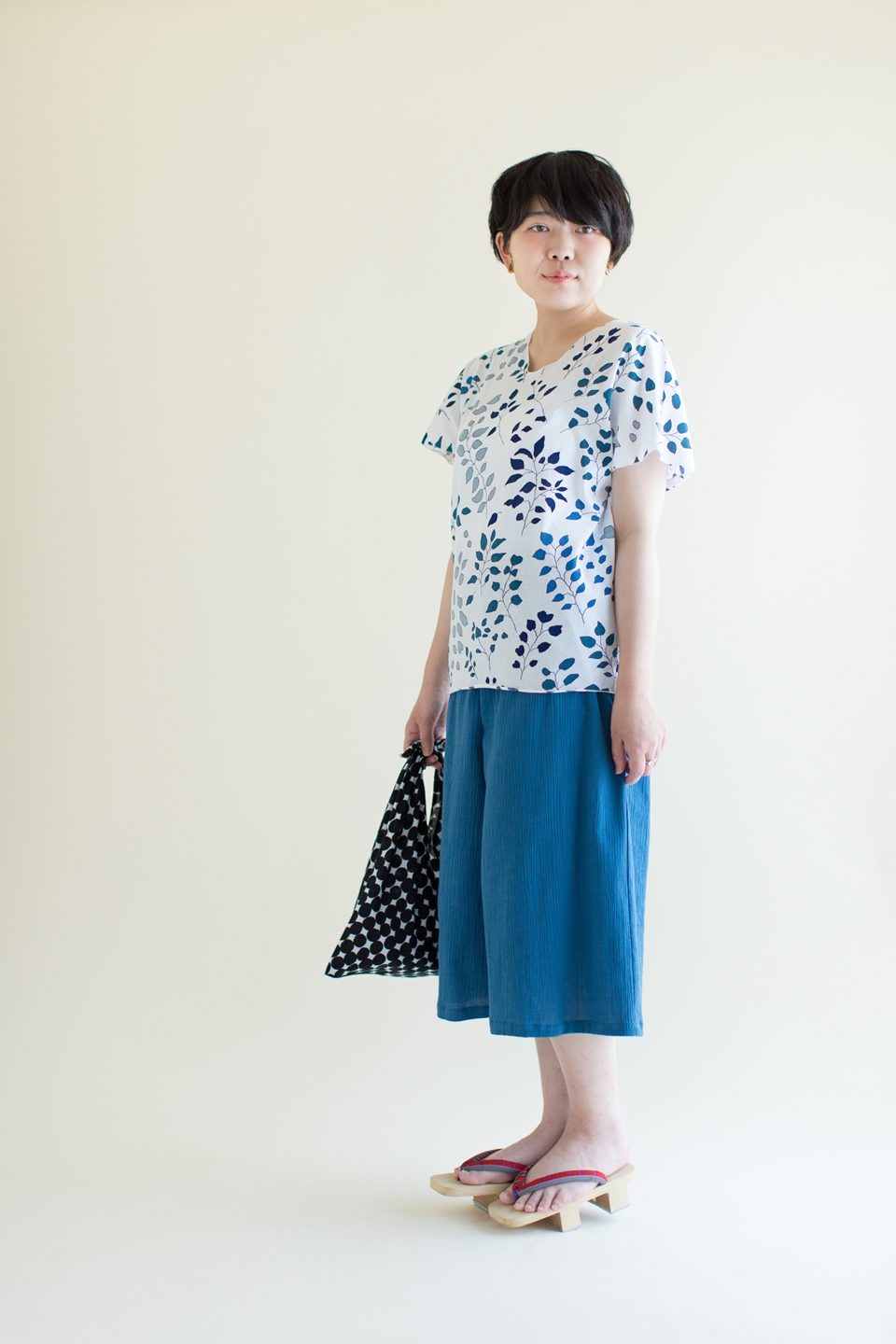 名前の通り広い形のもんぺ。ふくらはぎまでの丈から”はぎ丈”と名づけました。
