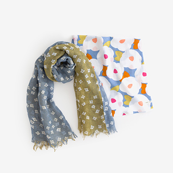 スヌードにもなる綿麻素材の春らしい2WAYストールと、定番の伊勢木綿のくびまき。