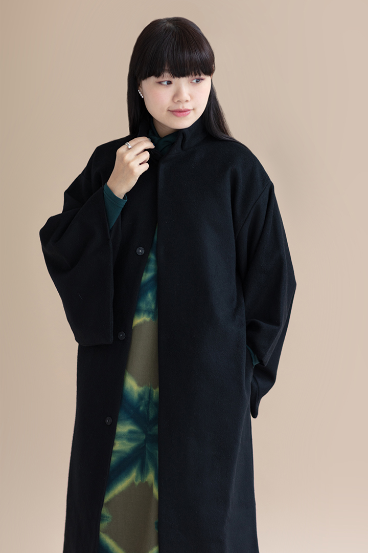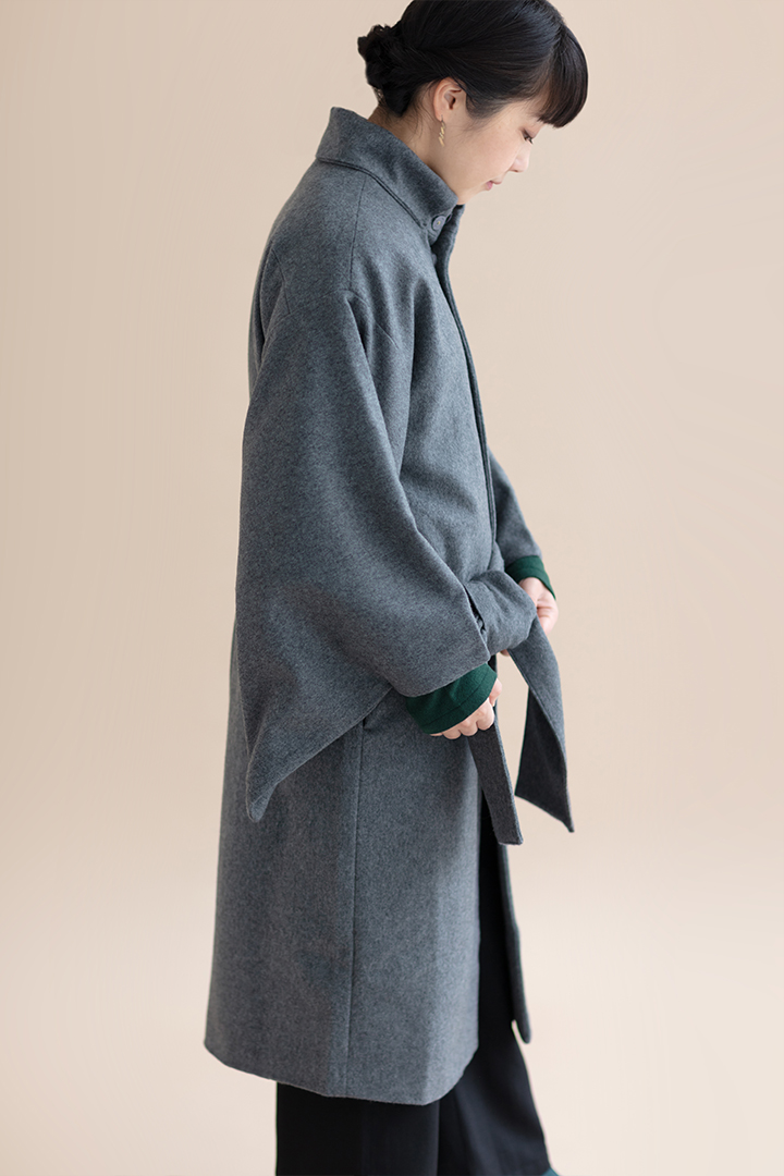 細身のシルエットが上品な角袖コート。