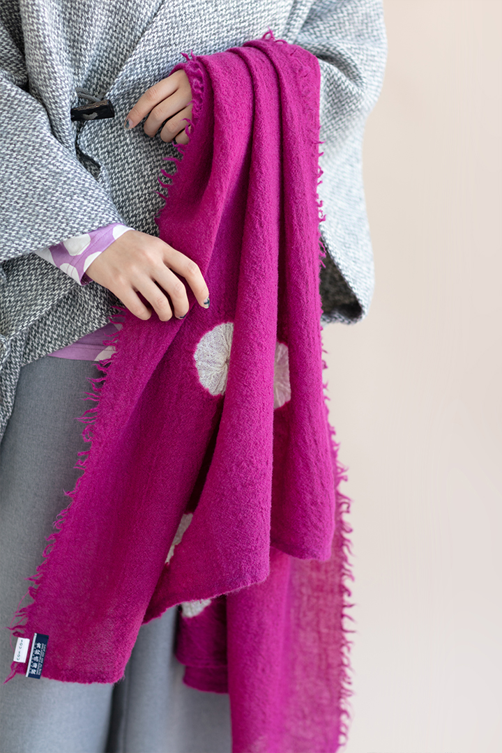 尾州・一ノ宮で織られたウール地に有松鳴海絞りの一つ、1957年創業の浅井絞りを施しました。