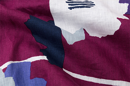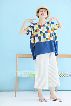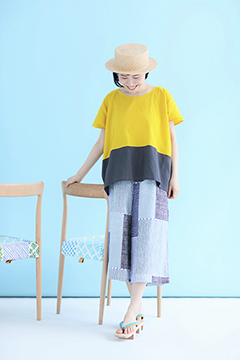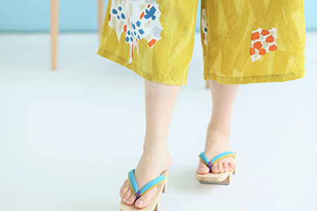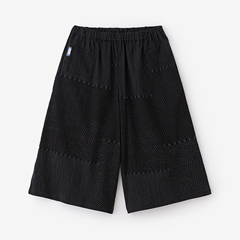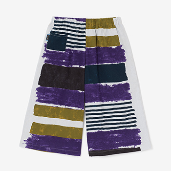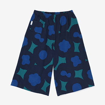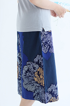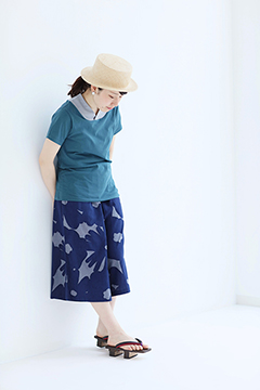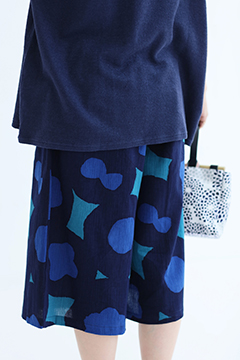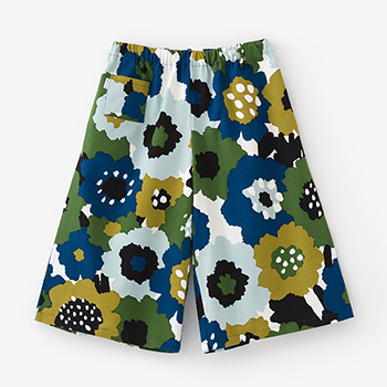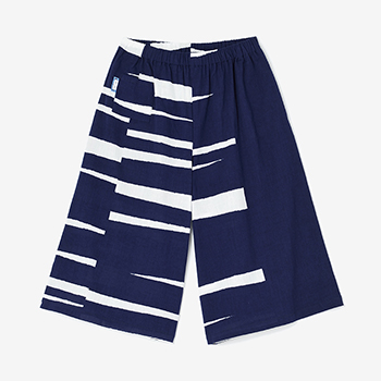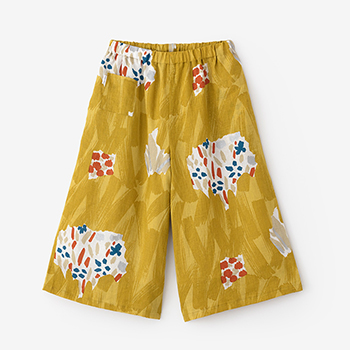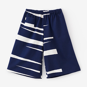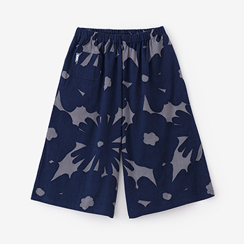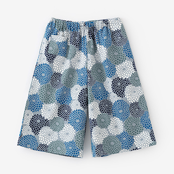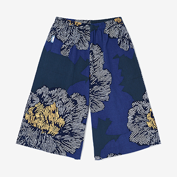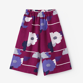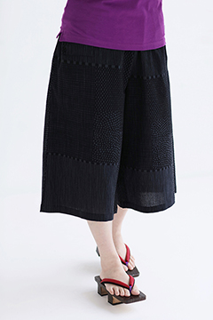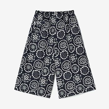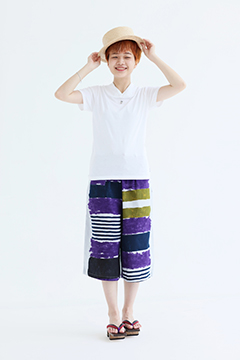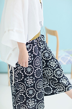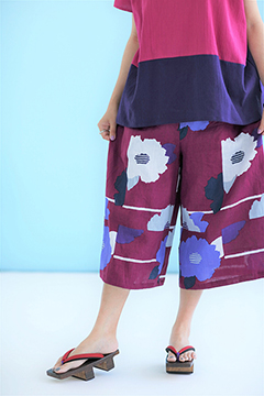 ふくらはぎまでの丈のパンツ。京型友禅でテキスタイルを染色しました。