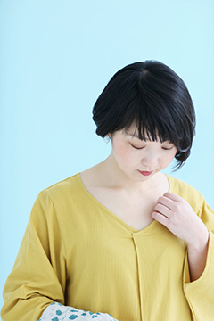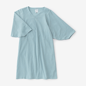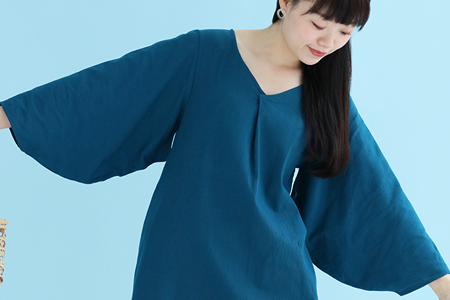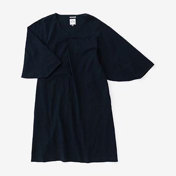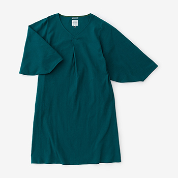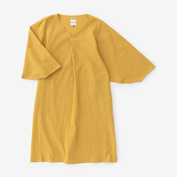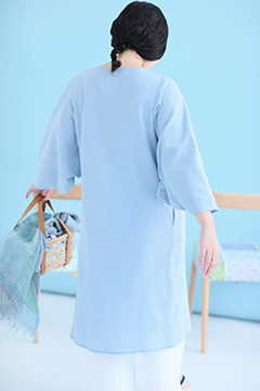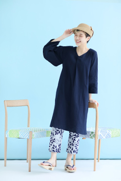 薙刀袖と襟ぐり部分の襞が特徴のワンピース。麻混の高島縮エンボス素材を使用。