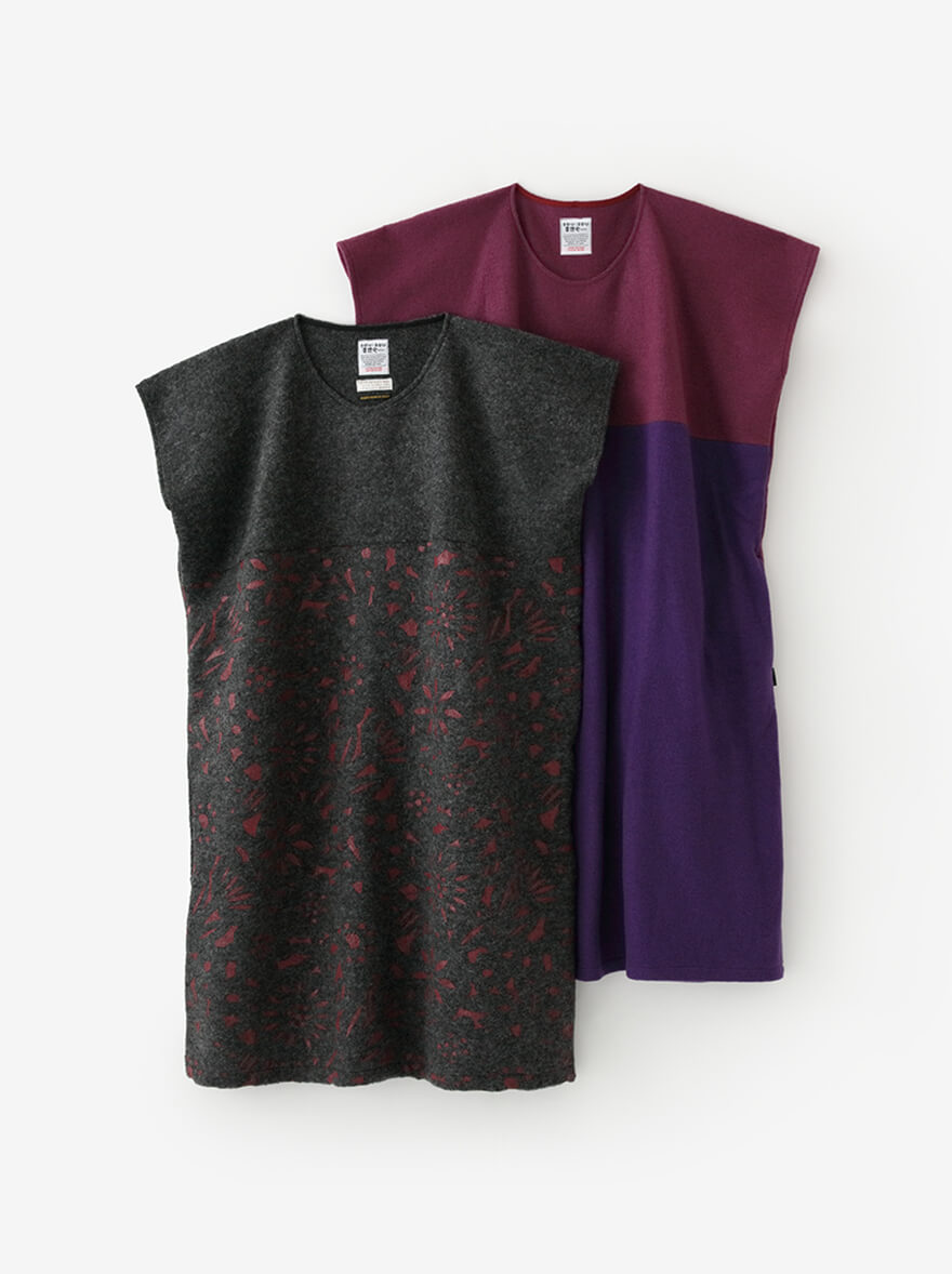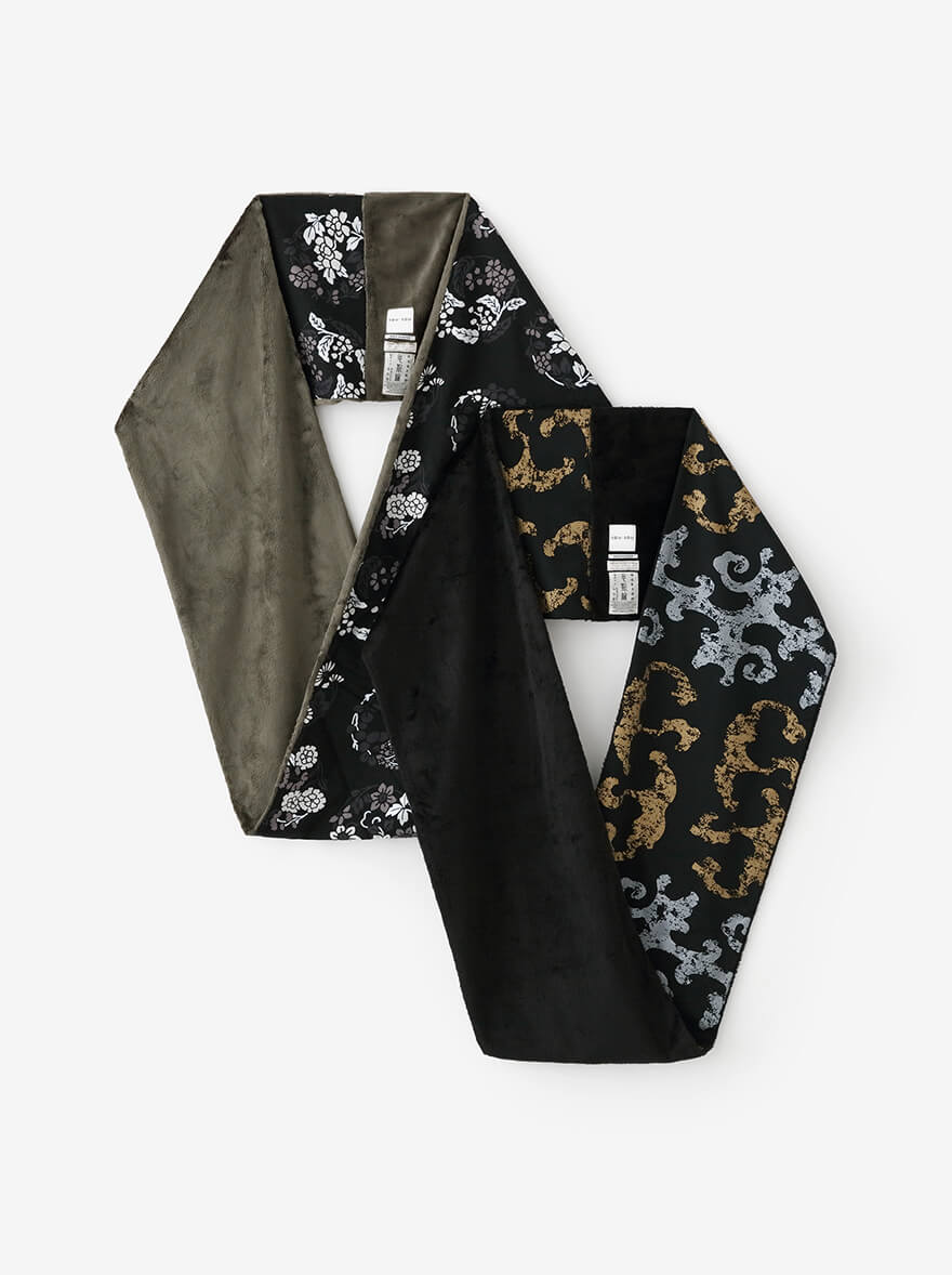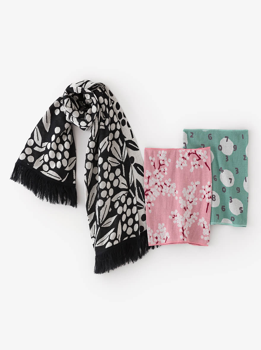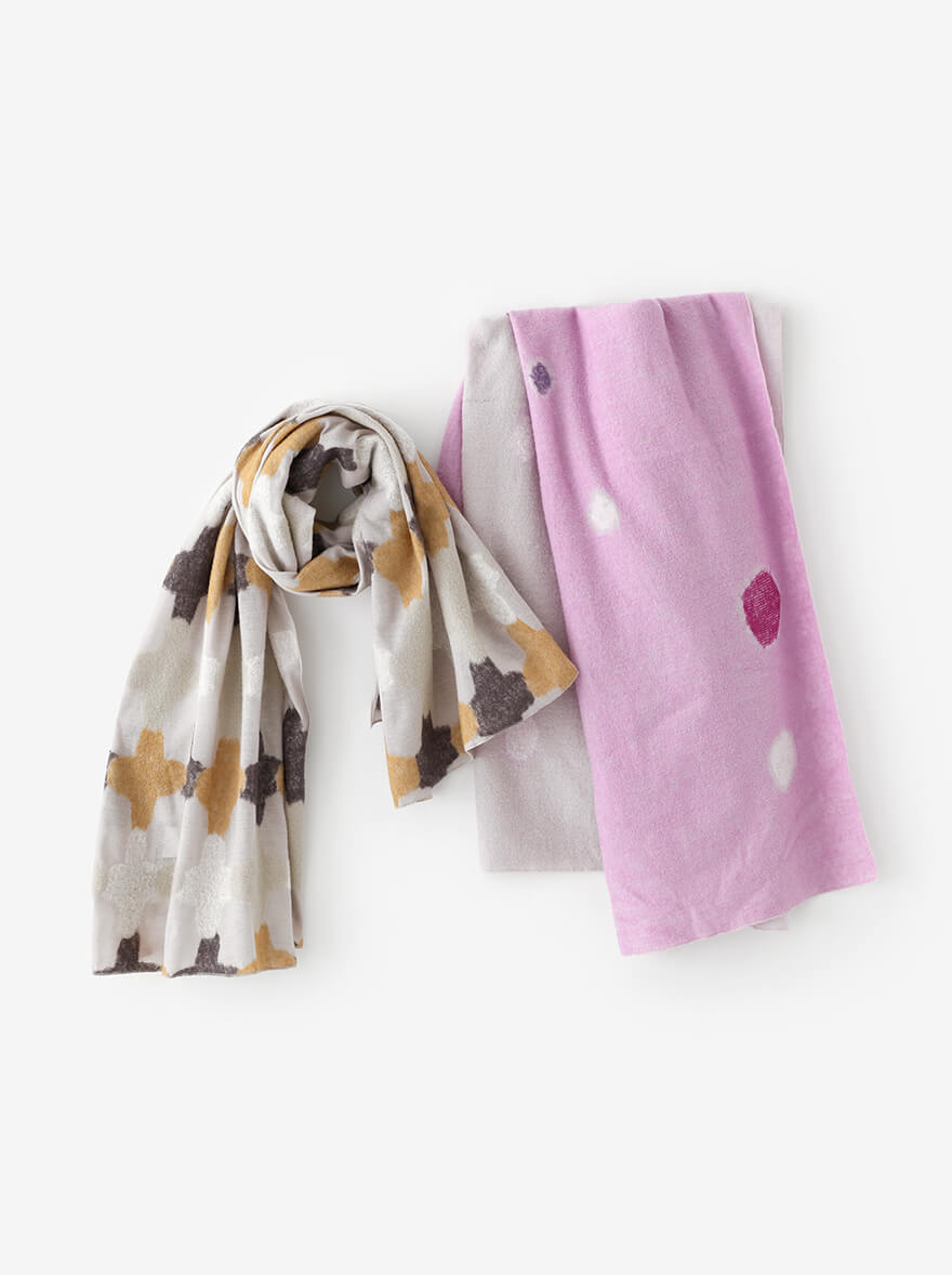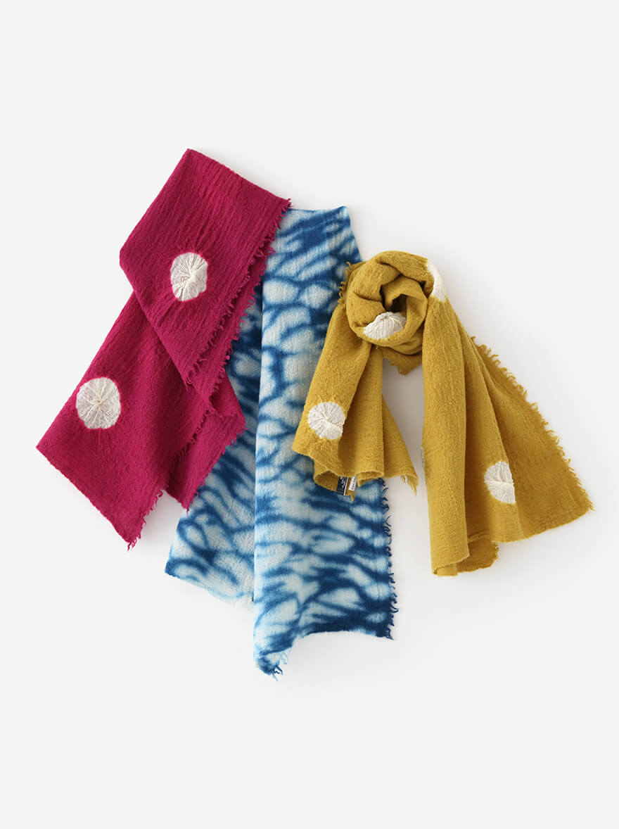 「冬のよそおい」は多種多様なウール素材を用いて製作しています。そこに施されるテキスタイルデザインの表現や技法もさまざま。羅紗の長方形衣×顔料京型友禅、紡毛糸や梳毛糸で編まれた羽織の“裏勝り”、ポップな絞りが印象的なストール。心も体もあたたまる冬のテキスタイルを、ぜひお楽しみくださいませ。