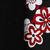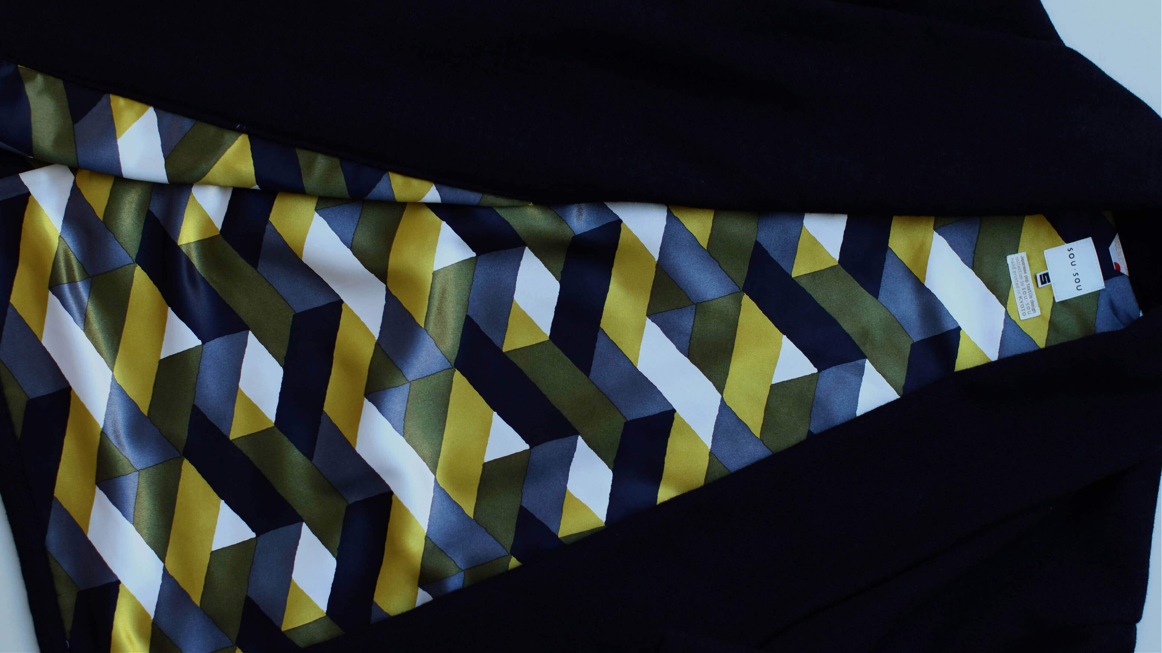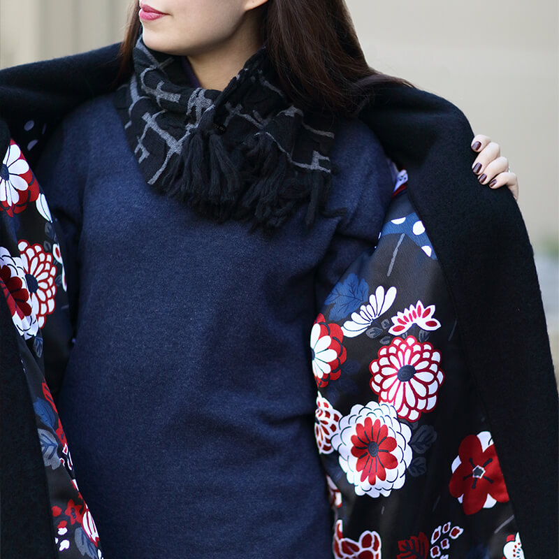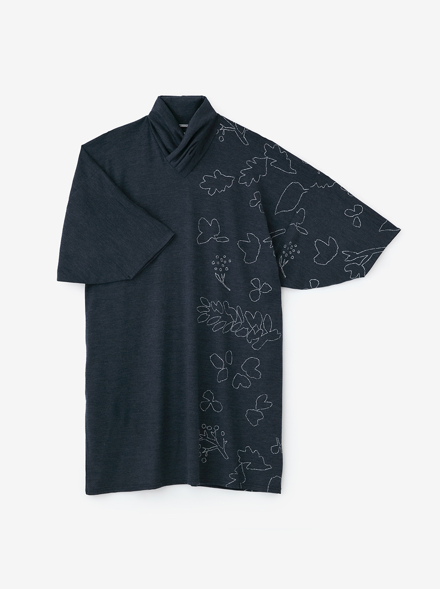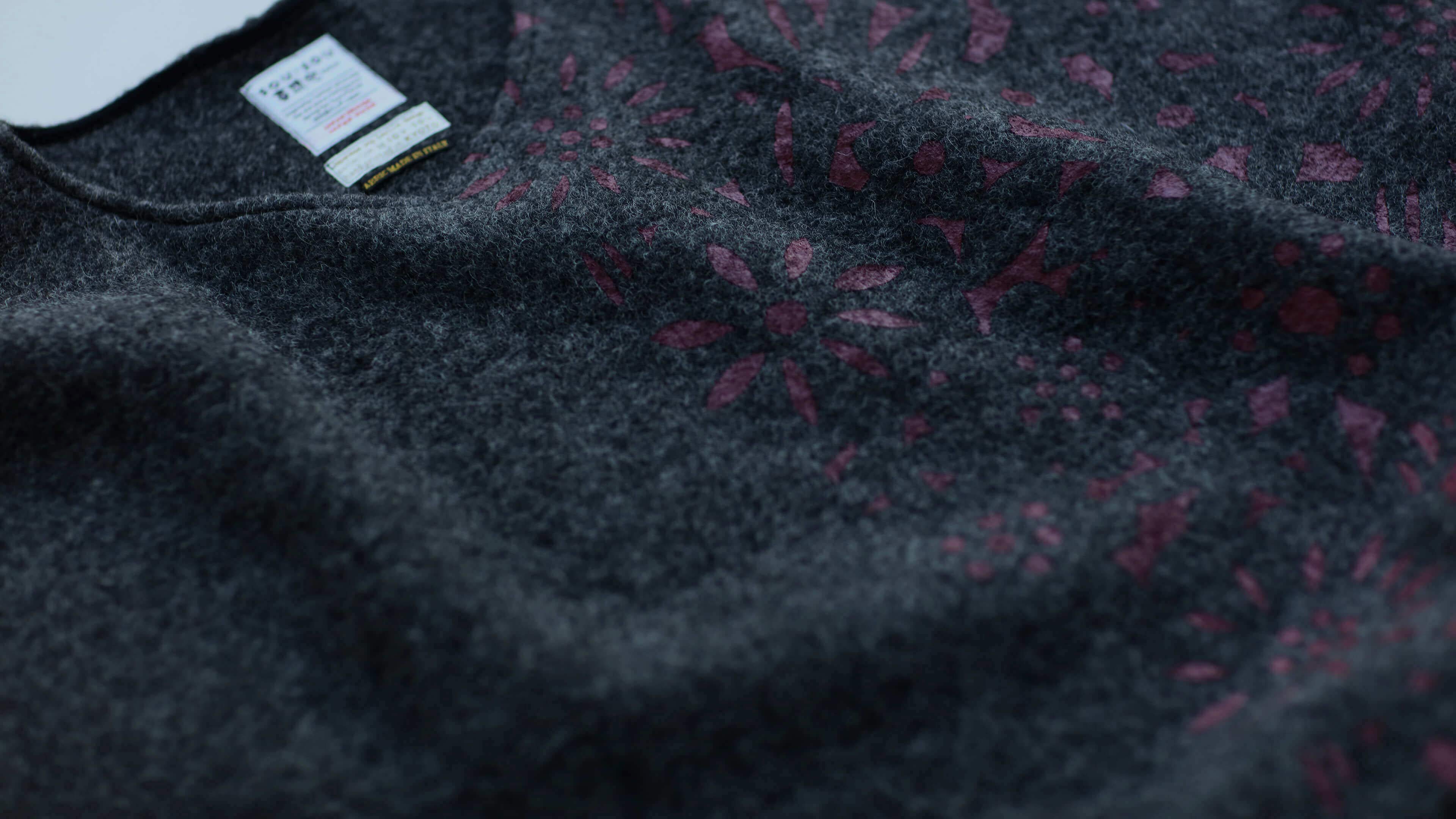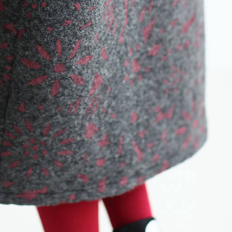 羅紗素材の衣類には顔料系染料で京型友禅を施して柄出ししています。色の濃い生地にも発色よく鮮明に染色できるのが特徴です。また、光沢のある染料の質感が素朴な風合いのウール素材に乗ることで、独特の雰囲気を生み出します。