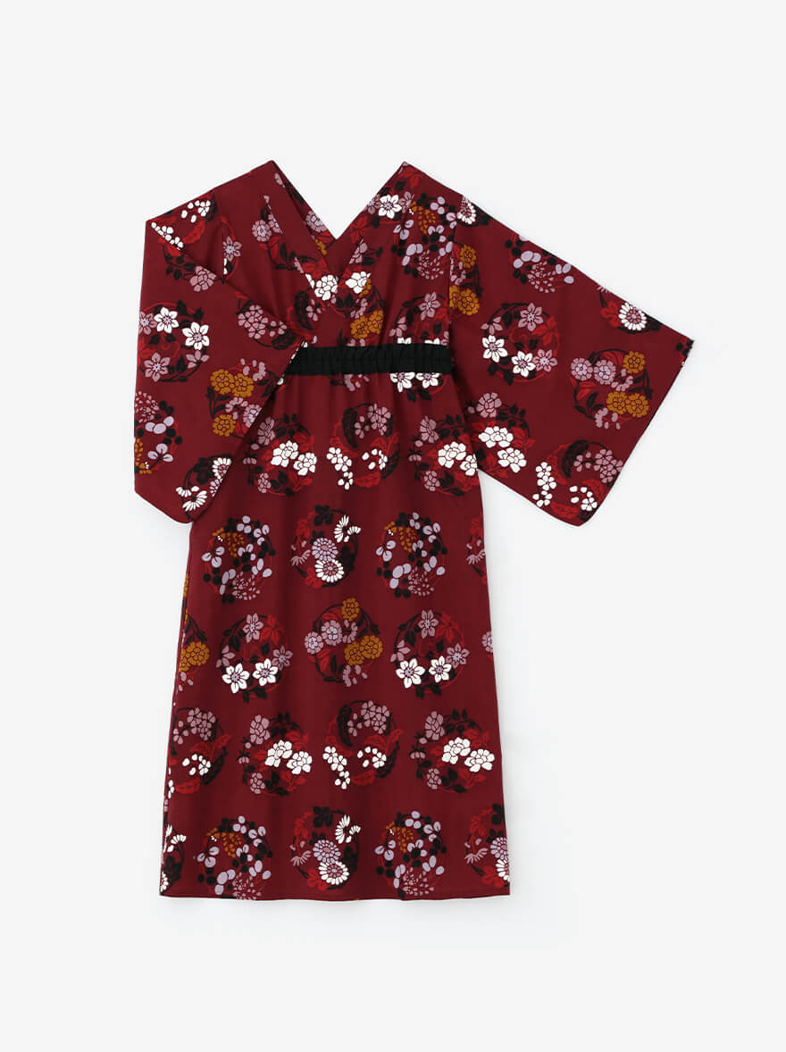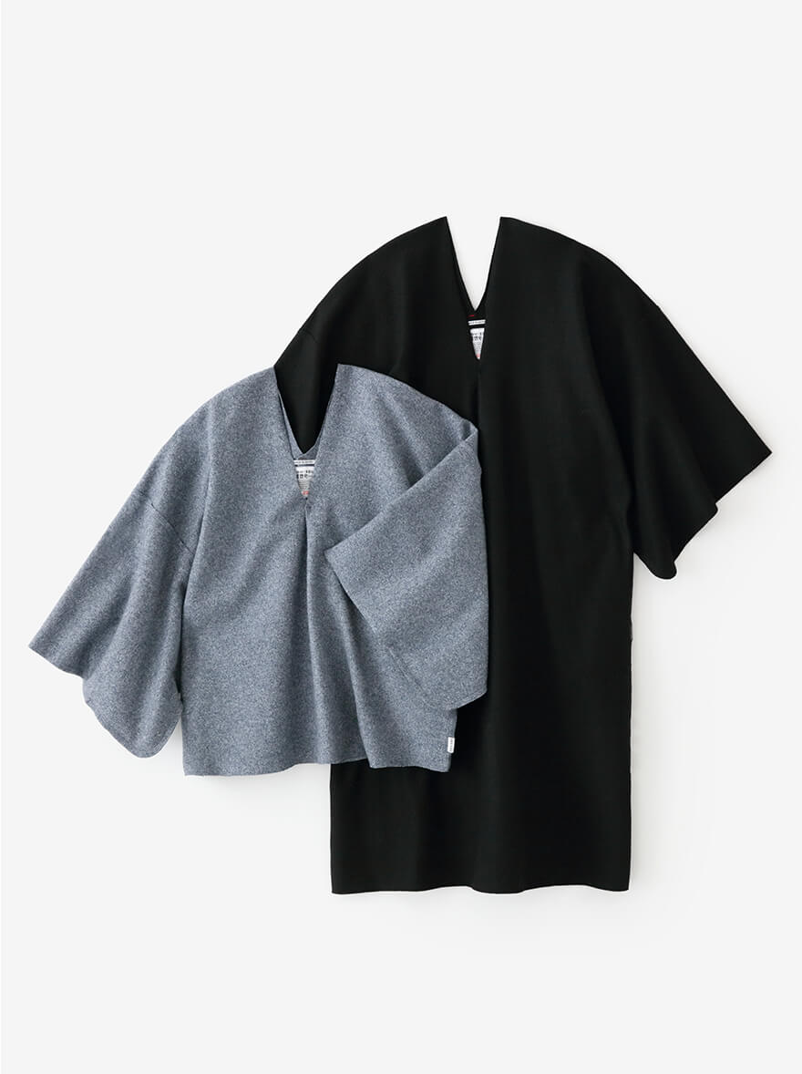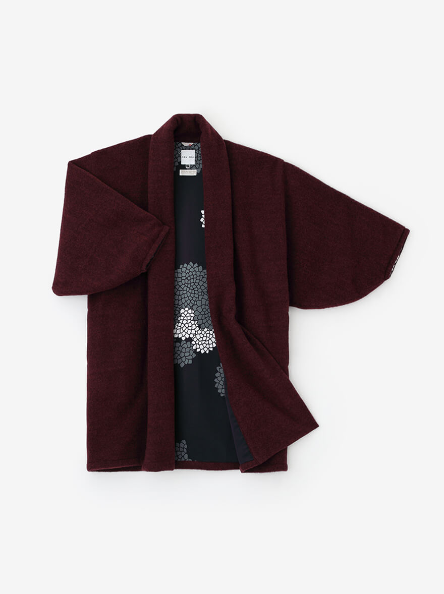 薙刀袖が可愛らしい印象の羽織『薙刀被風』『御御衣』は、無地の表地に対して、ポップな裏地を施した“裏勝り”仕様。帯電防止を備えた光沢感のあるポリエステル生地に京型友禅で柄をプリントしています。