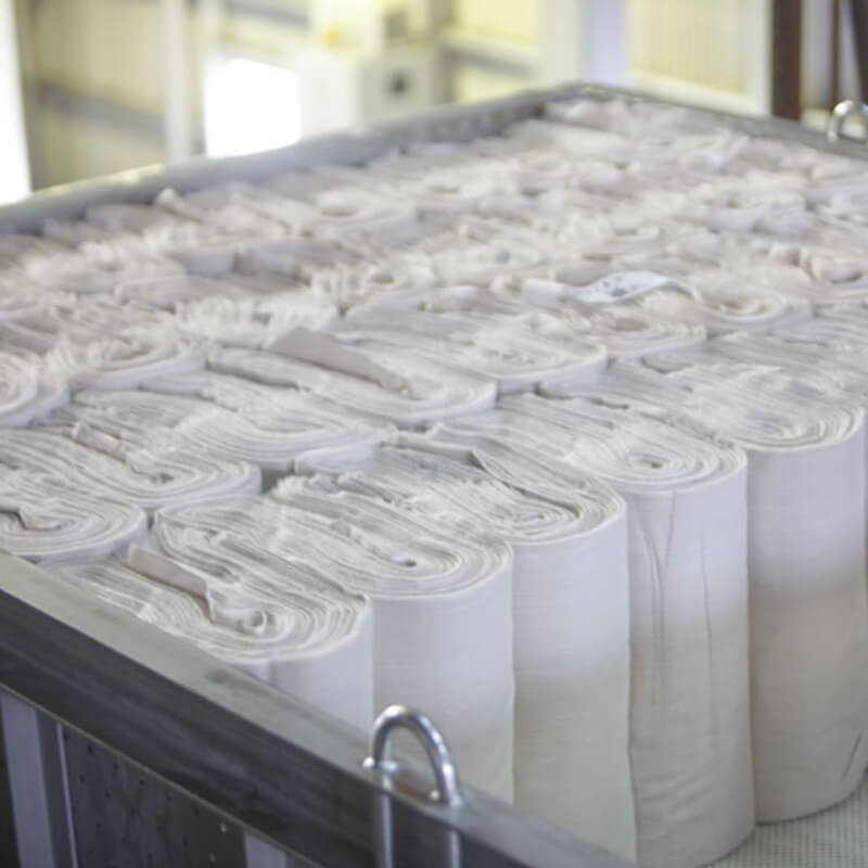 晒とは、織りあがった生地に含まれている不純物を落とす工程のこと。緩やかな水流の釜の中で2~3日かけゆっくりと炊き上げる和晒加工は、生地に余計なストレスがかからず、柔らかで吸水性良く仕上がります。