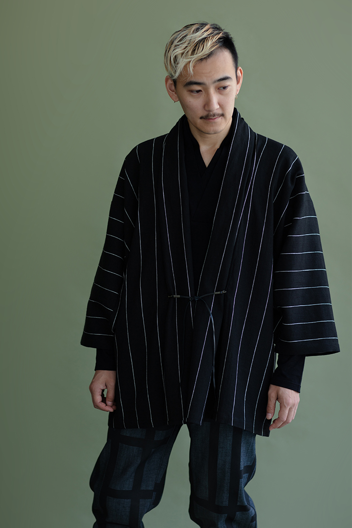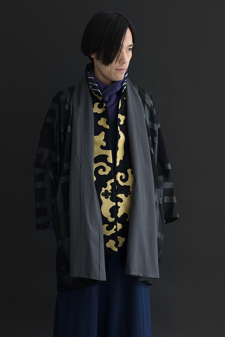 一枚の生地を折りたたんだ袖が特徴の、アイヌの民族衣装がモチーフの羽織もの。