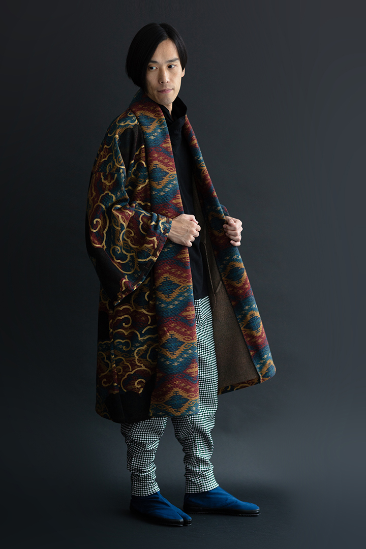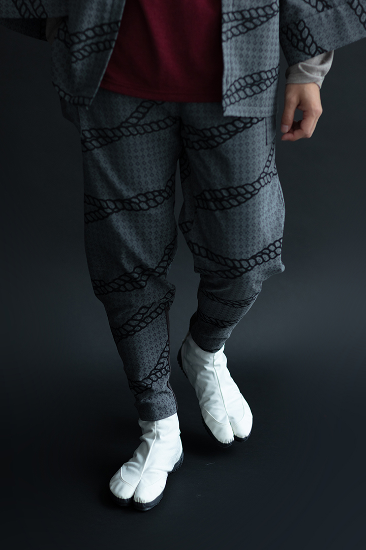 細身のシルエットのズボン。ひざ下部分を紐で絞った袴に似たデザイン。