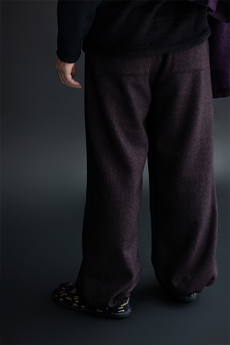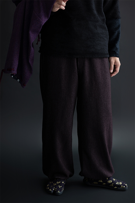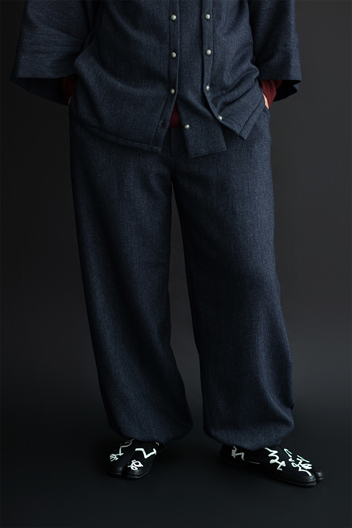 公家装束に用いられた袖括をイメージしたデザインを裾に施したズボン。