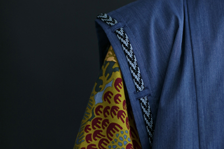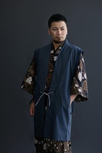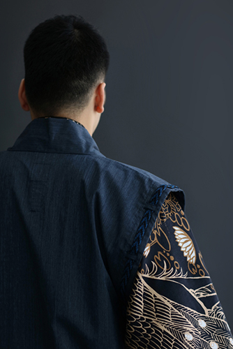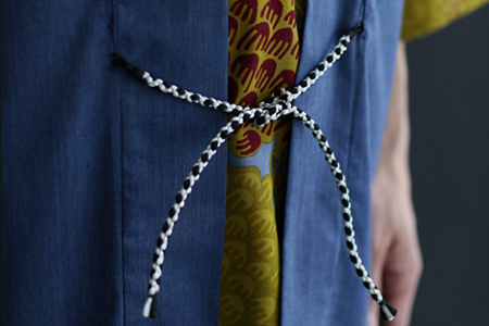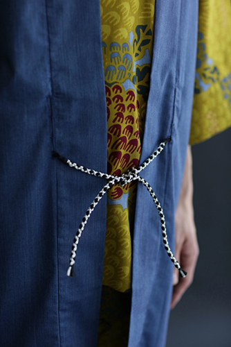 肩部分に、公家装束に用いられた袖括(そでくくり)を取り入れた羽織。組紐は昇苑くみひも謹製。