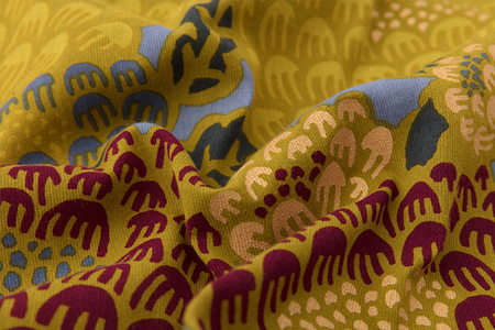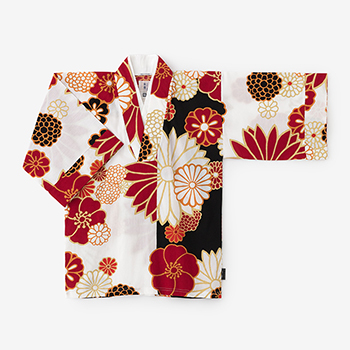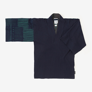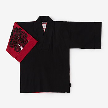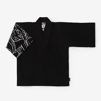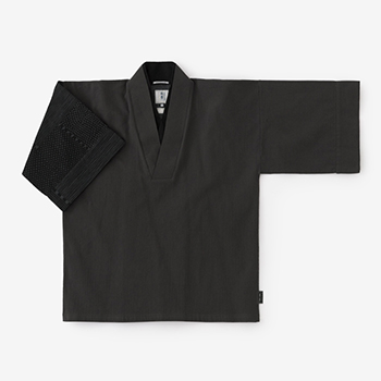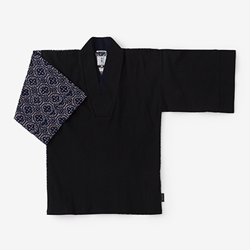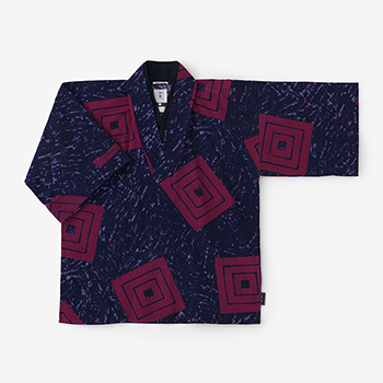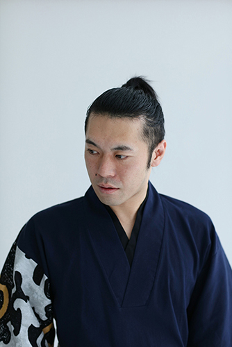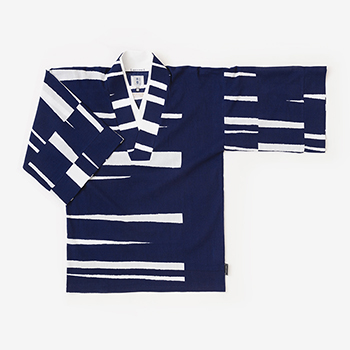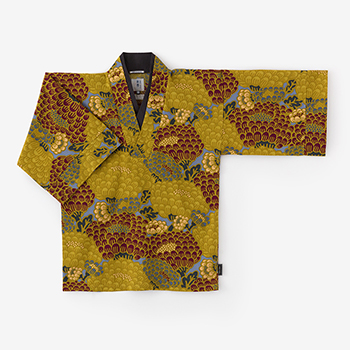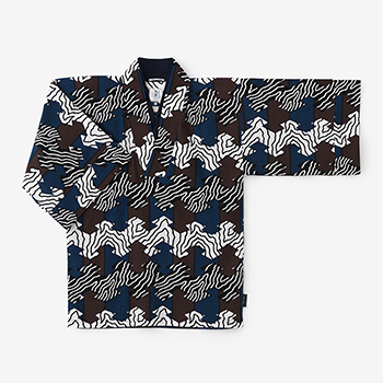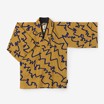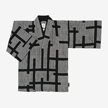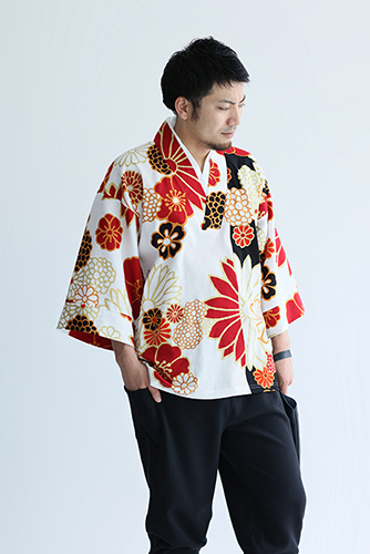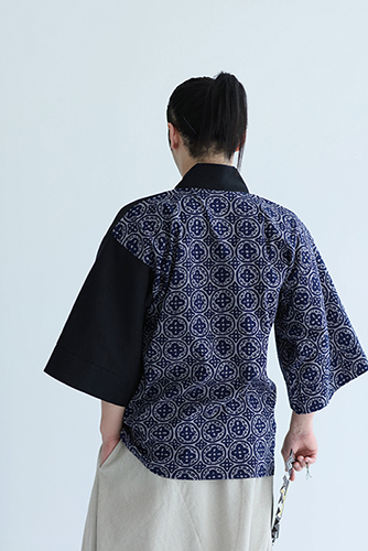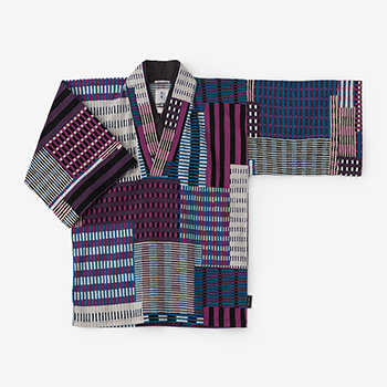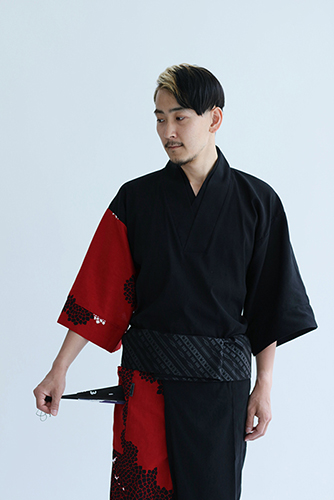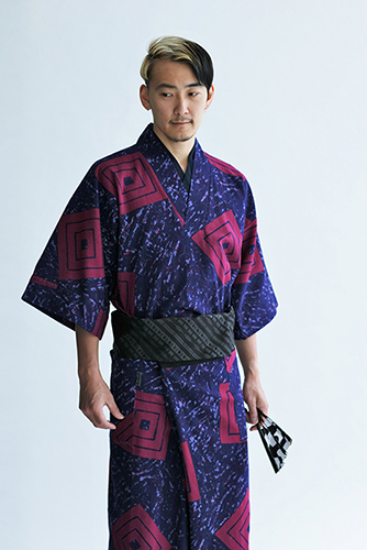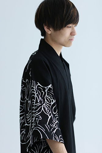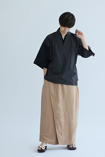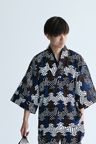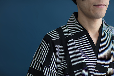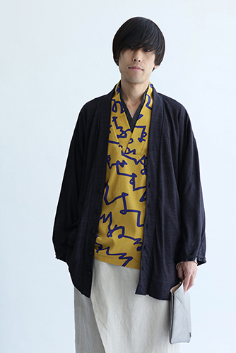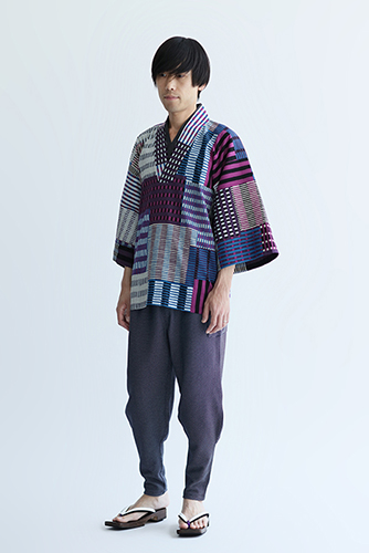重ね衿が特徴のSOU・SOU流二部式和装。爽快な着心地の高島縮に京型友禅で染色。