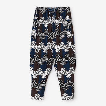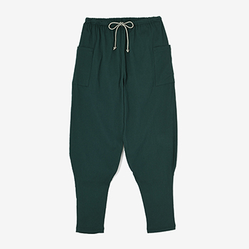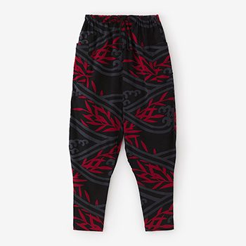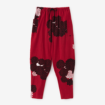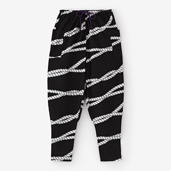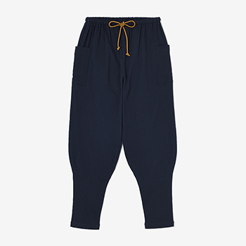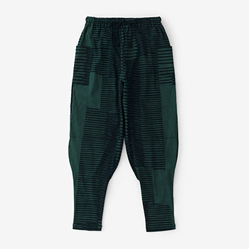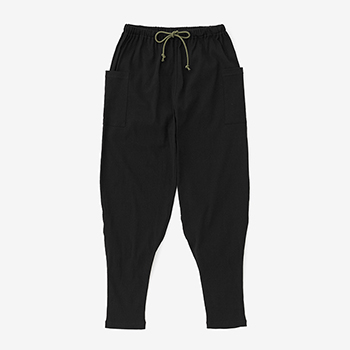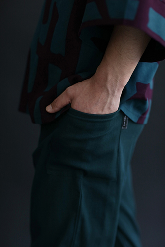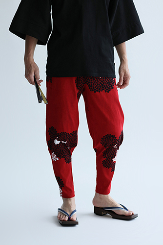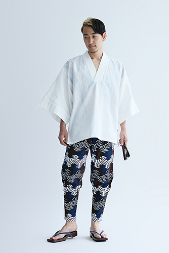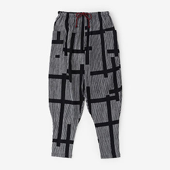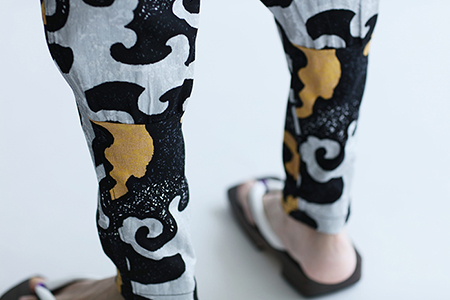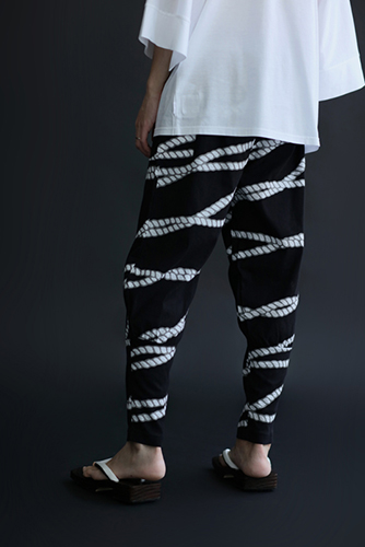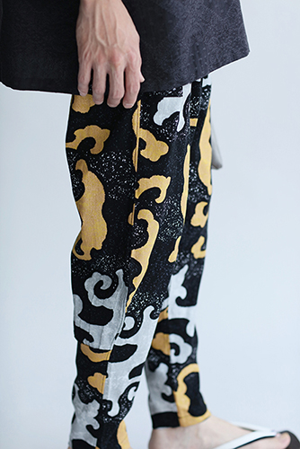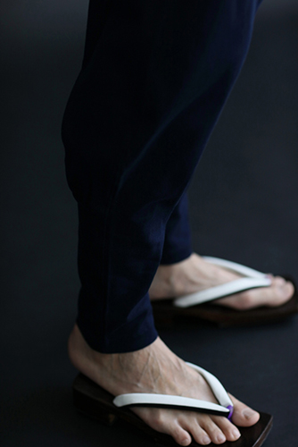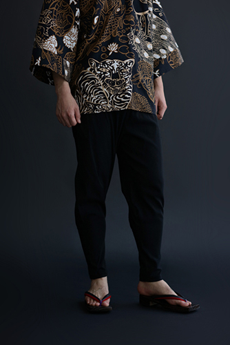 「裁付(ひざ下部分を紐で絞った袴)」に似たシルエットのズボン。爽快な着心地の高島縮を使用。