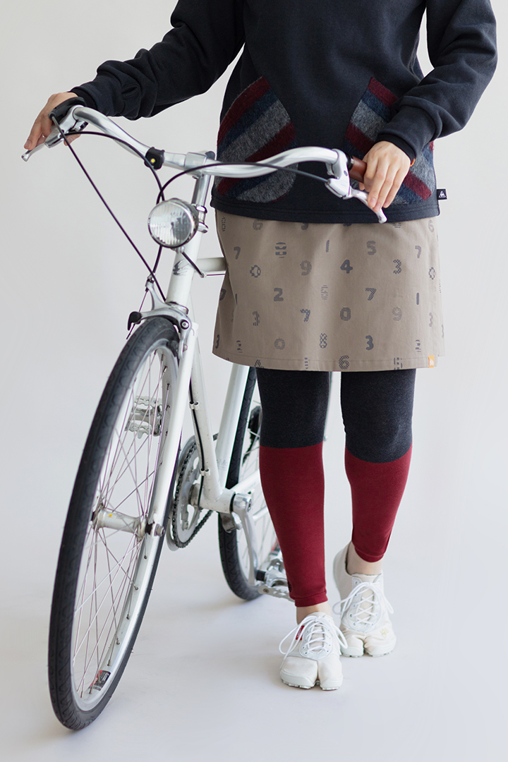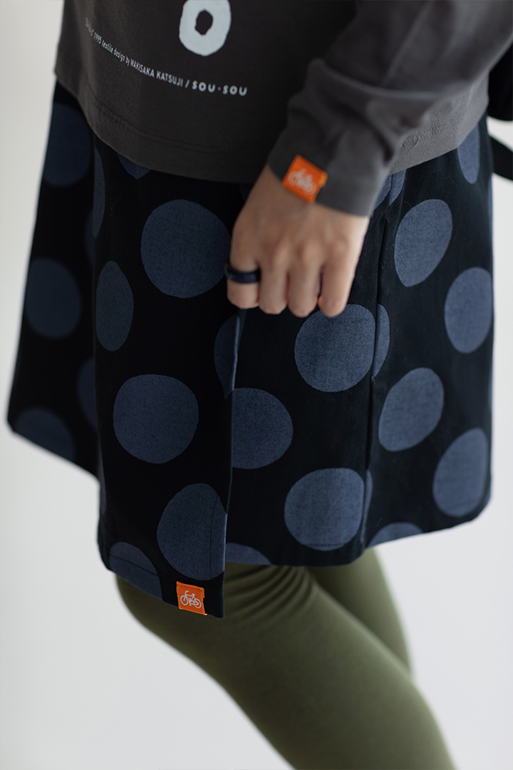 前から見るとスカート、後ろから見ると半ズボンのラップキュロットタイプ。綾織の綿100%素材にハンドラバープリント加工。