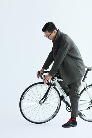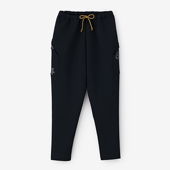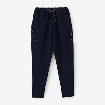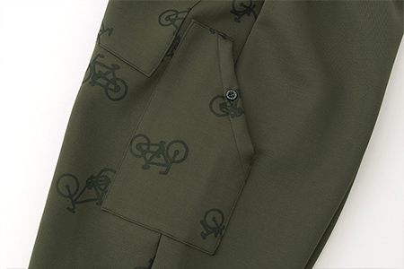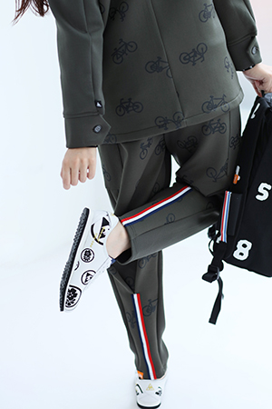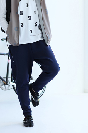 乗馬用に作られたジョッパーズパンツを自転車用にアレンジ。両裾部分にトリコロールデザインテープ付き。