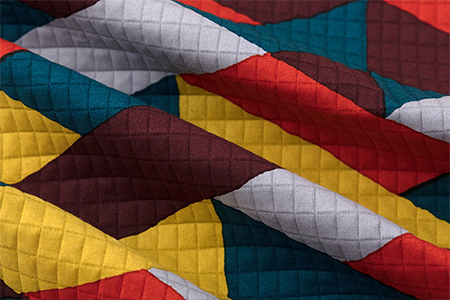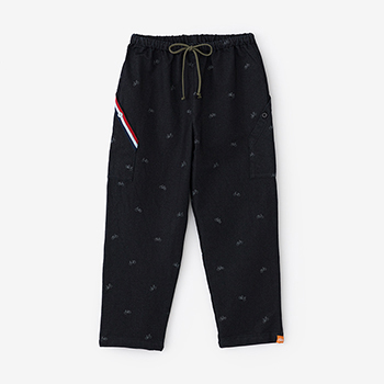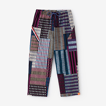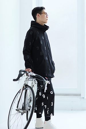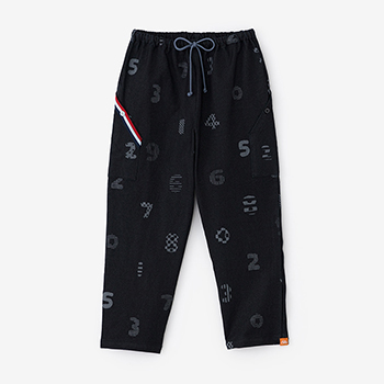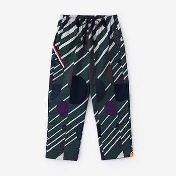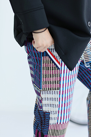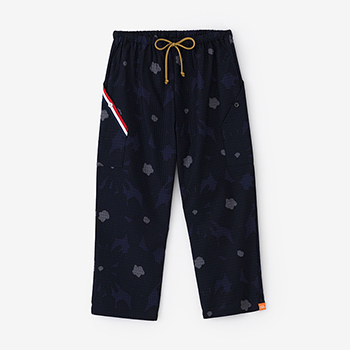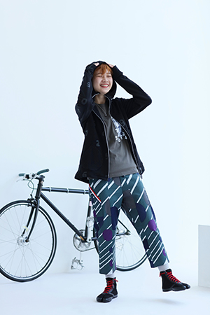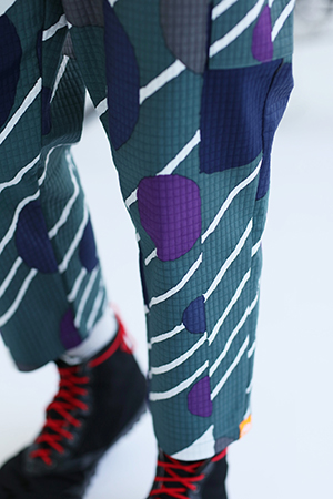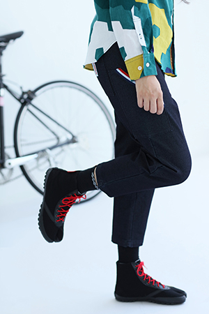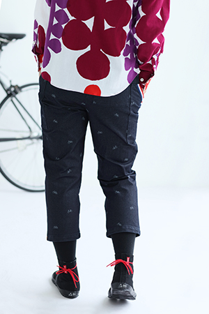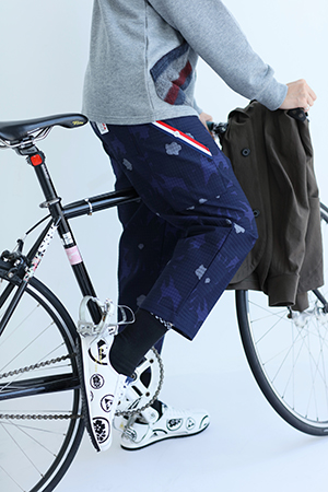 ストレッチ生地に京型友禅で染色。脇ポケットは自転車に乗りながら物が出し入れしやすいデザイン。