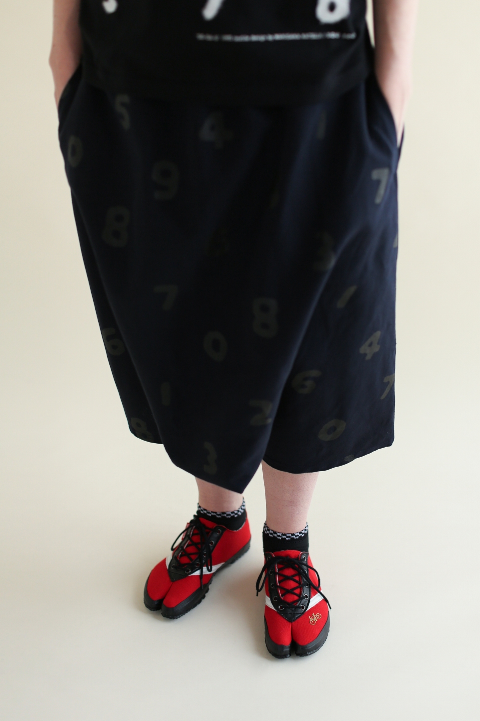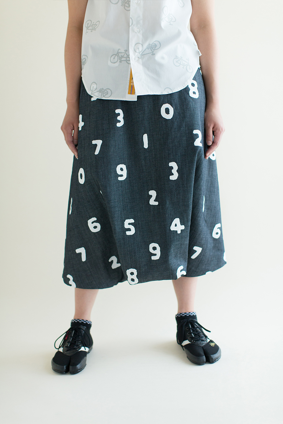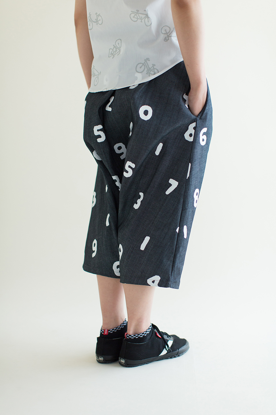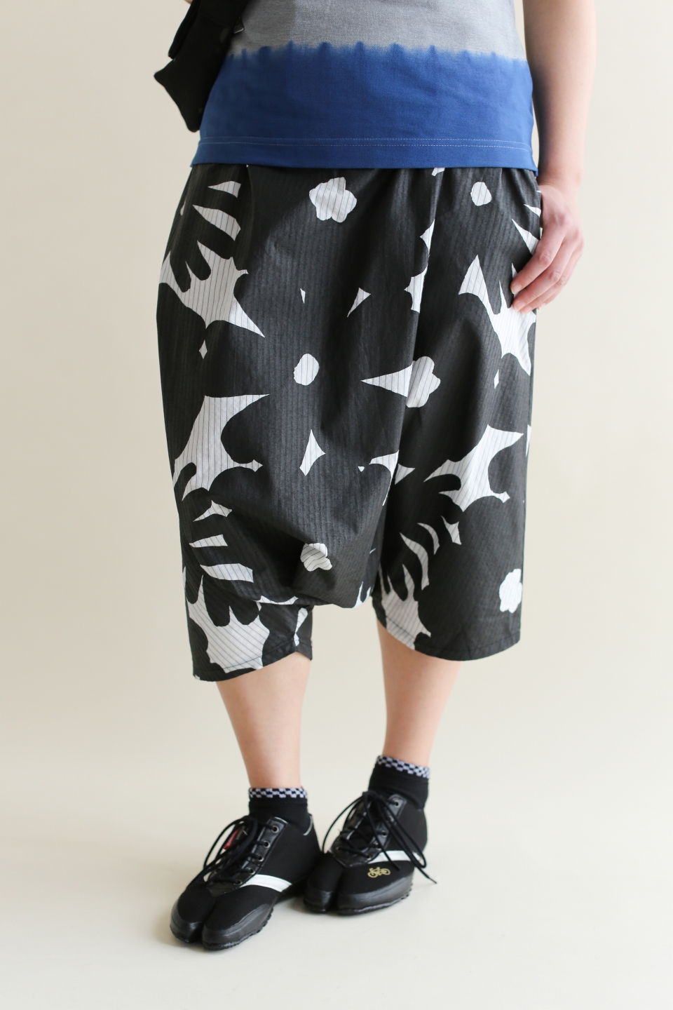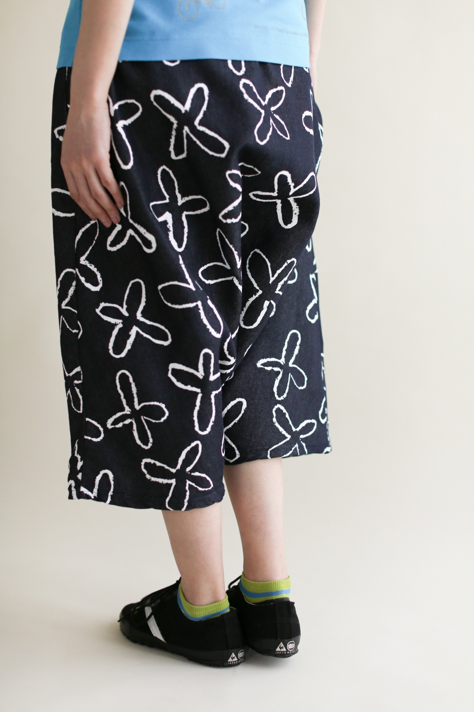 ラバープリント加工を施した膝丈のズボン。