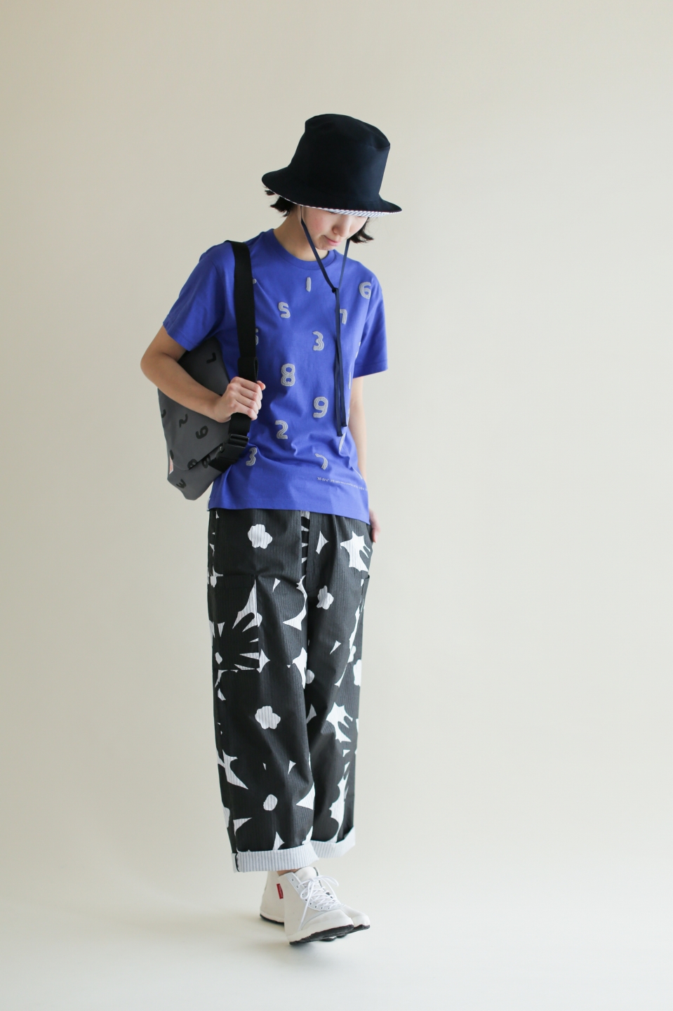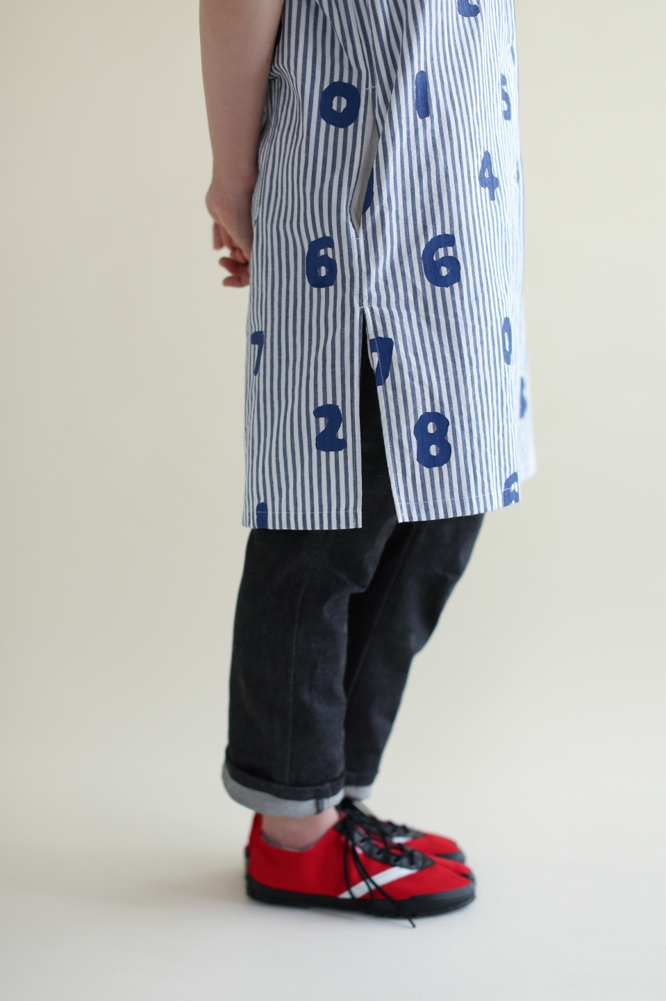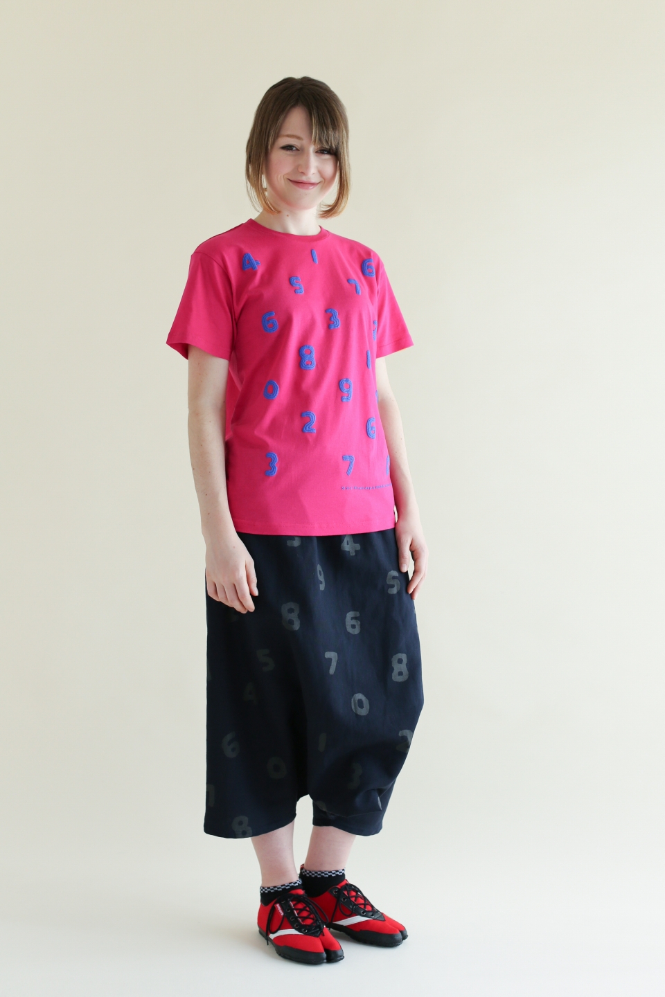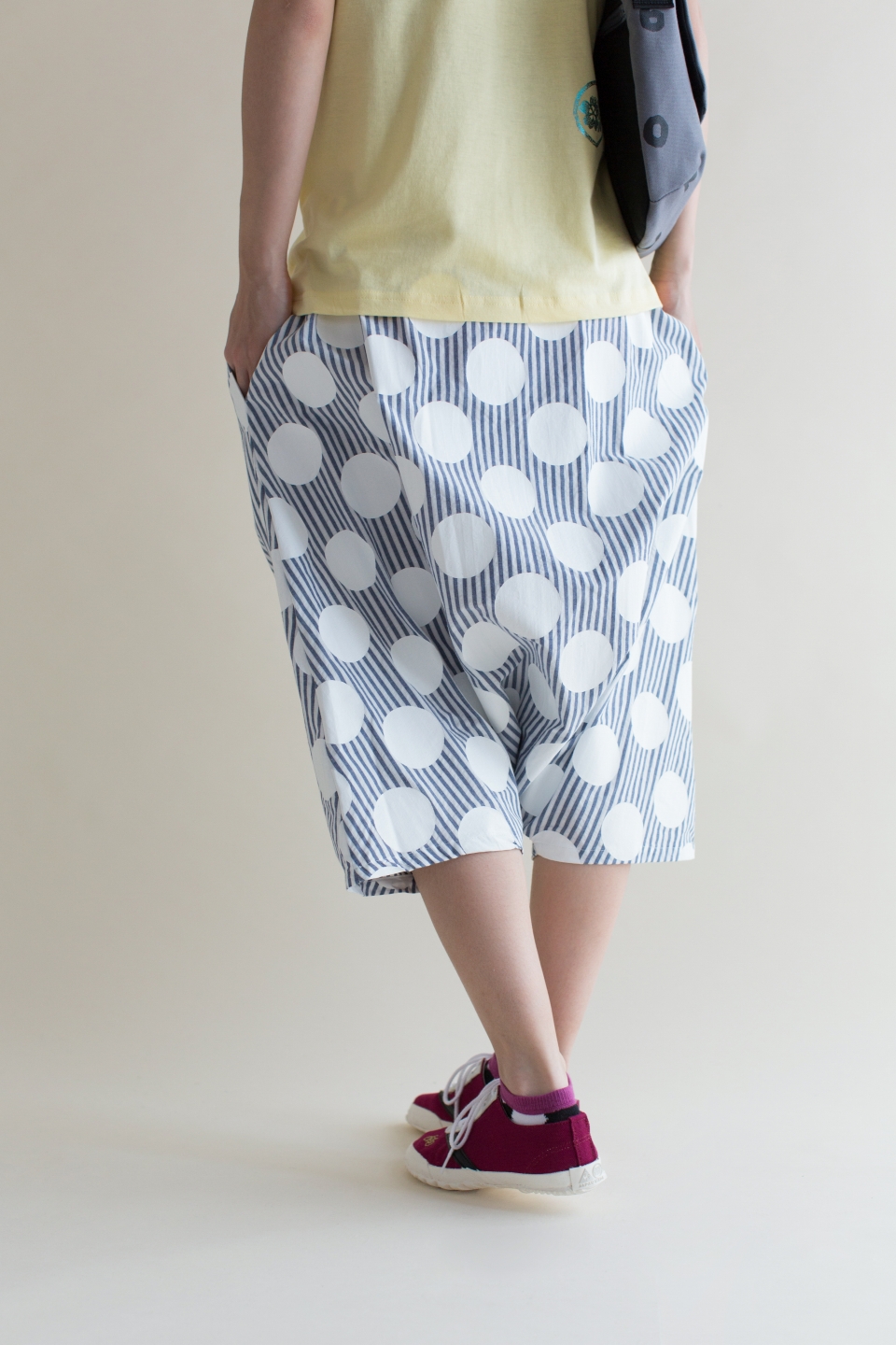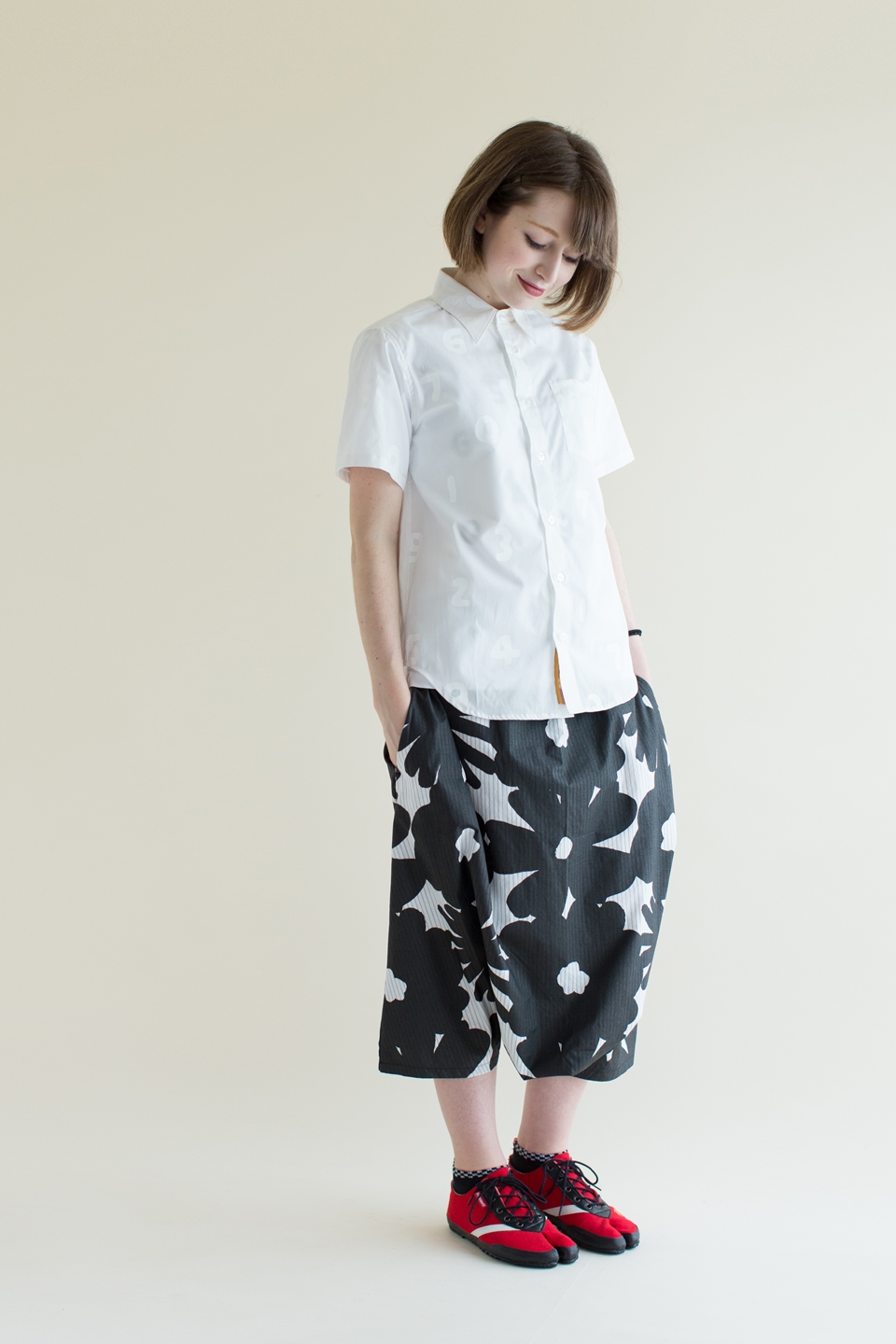 ラバープリント加工を施した膝丈のズボン。