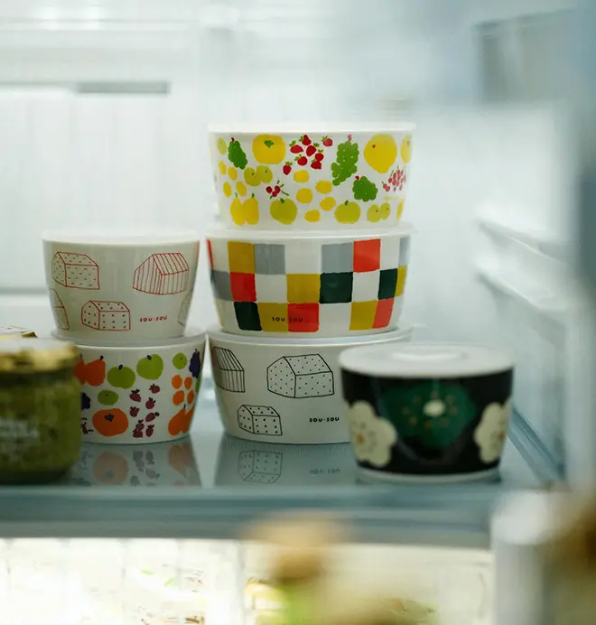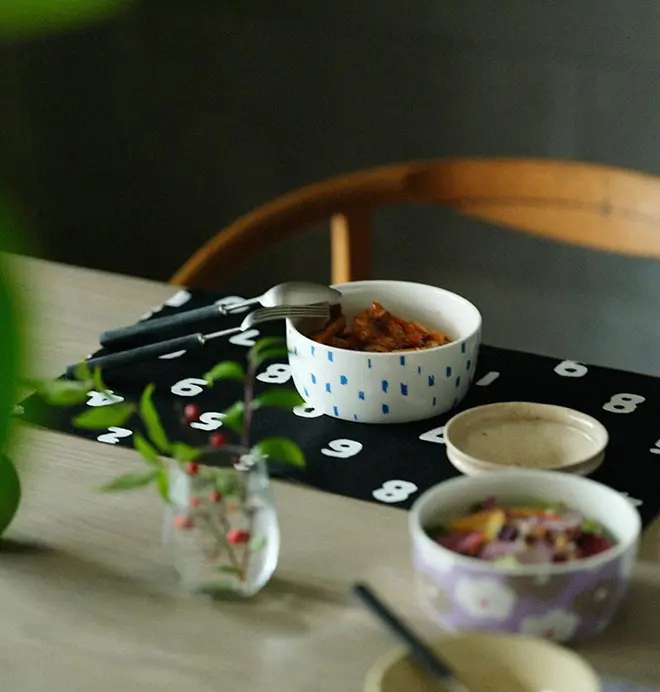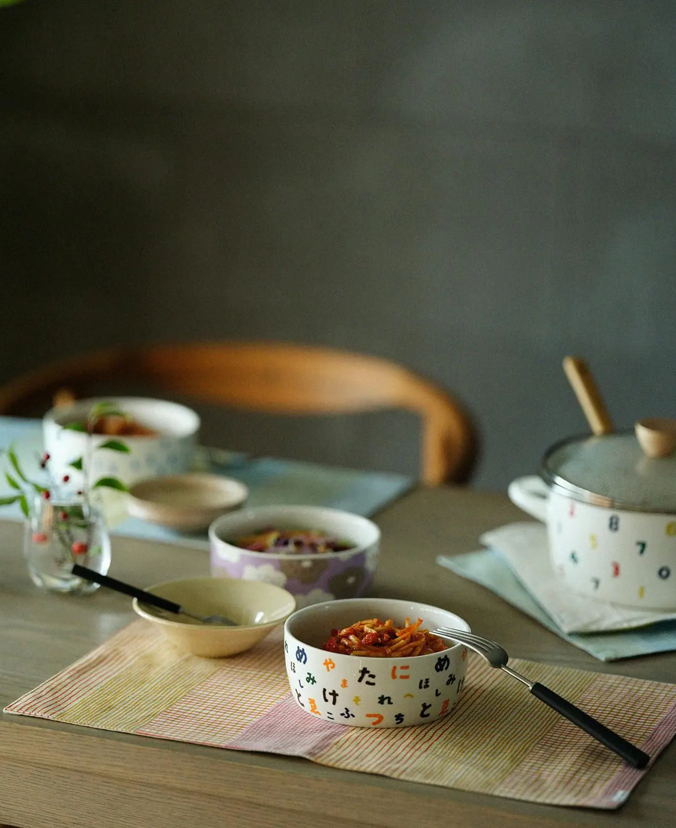 色とりどりの茶たくやランチョンマット、職人技が光る蓋物や大きめのお椀など。ポップなテキスタイルで楽しむSOU・SOUのテーブルウェア。
