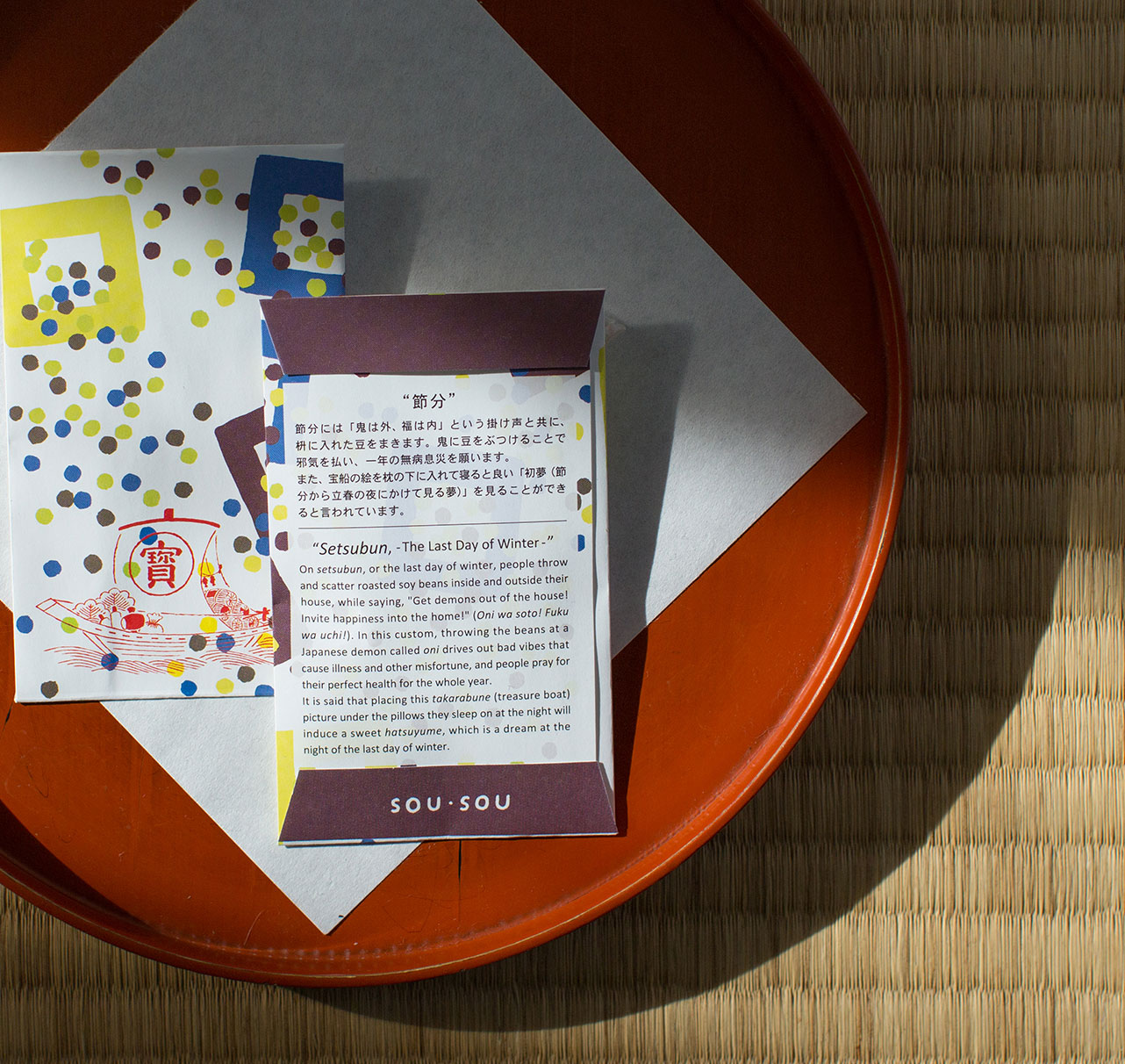 今年、SOU・SOU全店では良い初夢が見られるとされる「宝船」が入った“節分柄のぽち袋と福豆(国産)”のセットを商品お求めの方に、もれなくプレゼントいたします。