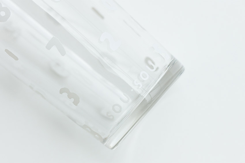 国産のグラスに、SO-SU-U柄の白プリントを施しております。