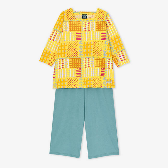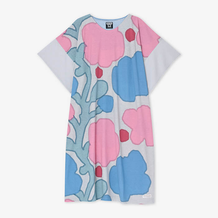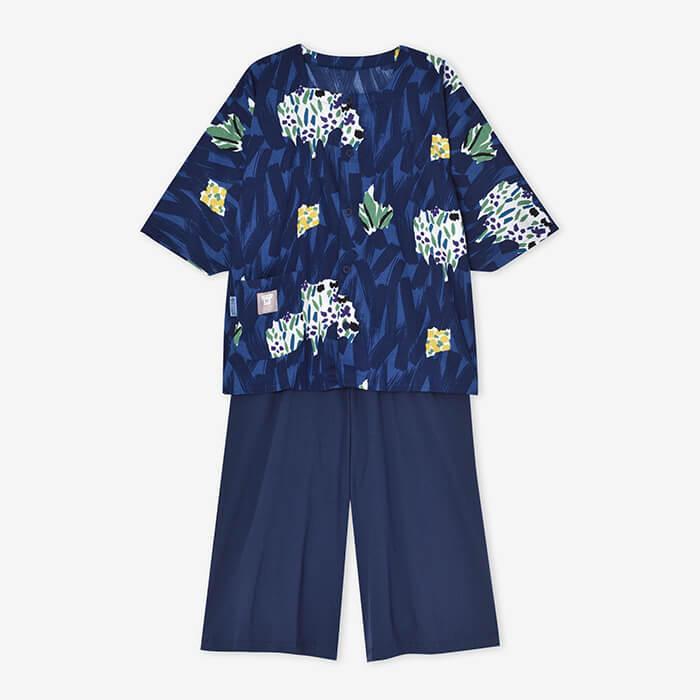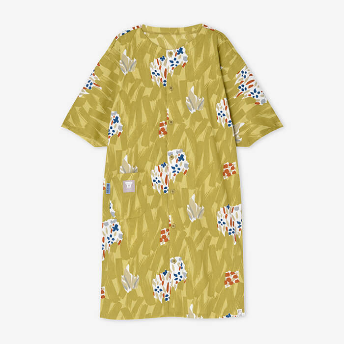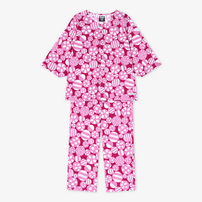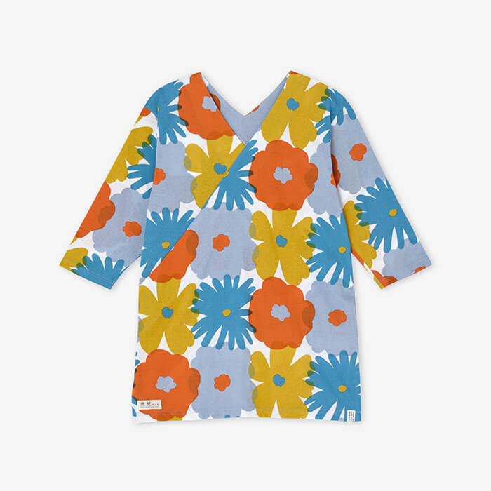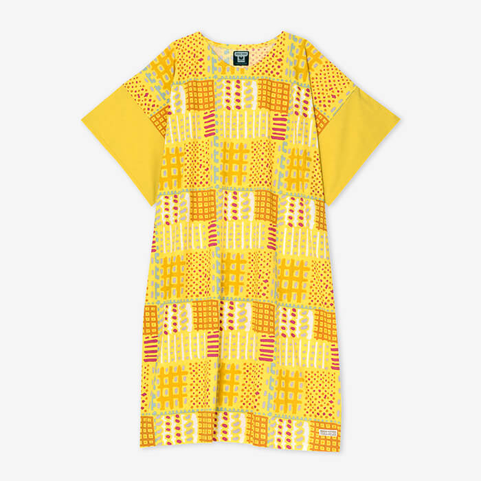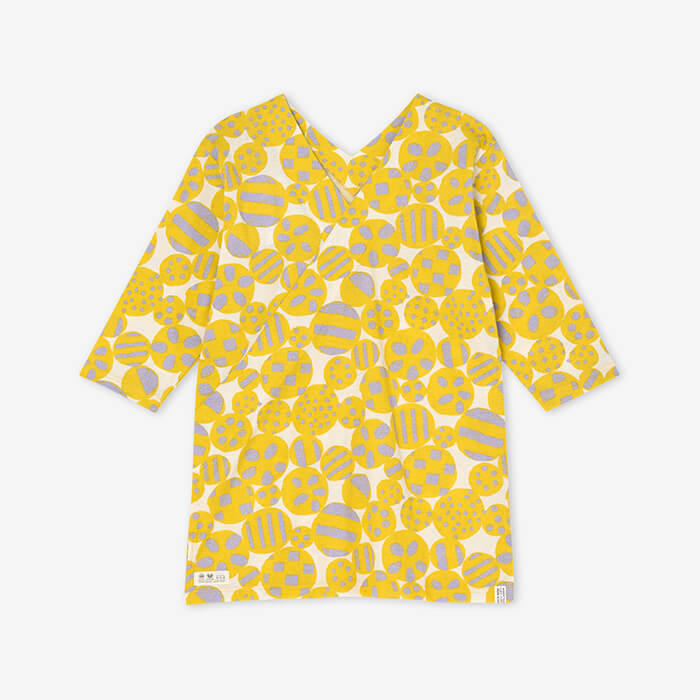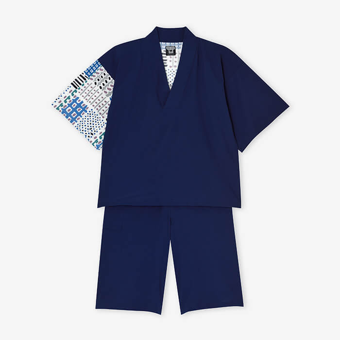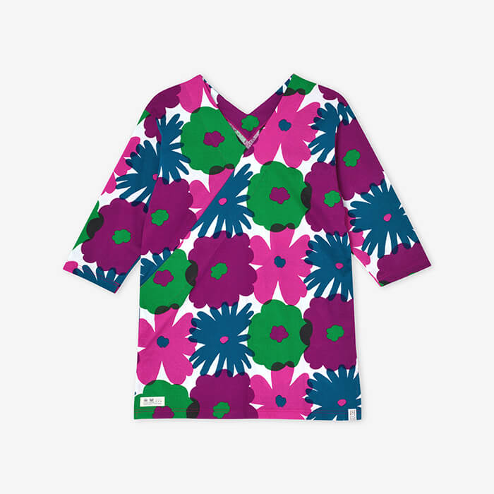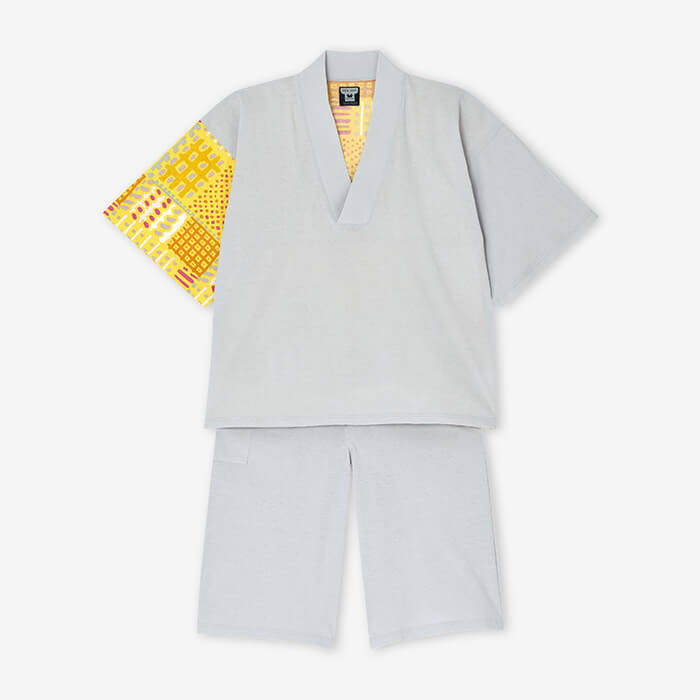 着物の衿袷わせや衿抜き、たっぷりとした袖が特徴の「筒袖」など、和服をイメージしたデザインを用いました。ポップなテキスタイルが日々の暮らしに彩りを添えてくれます。