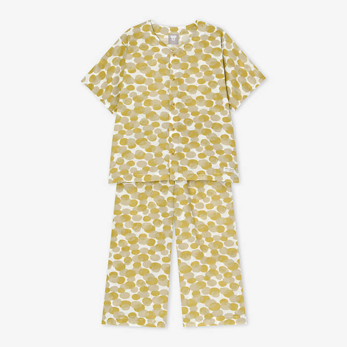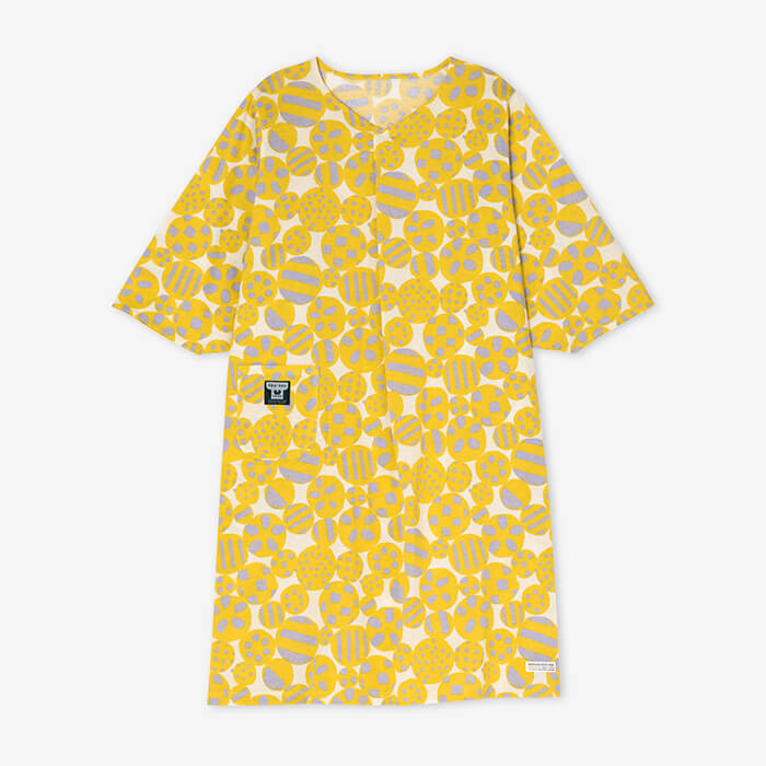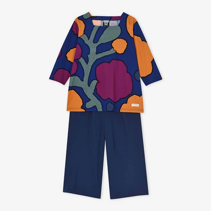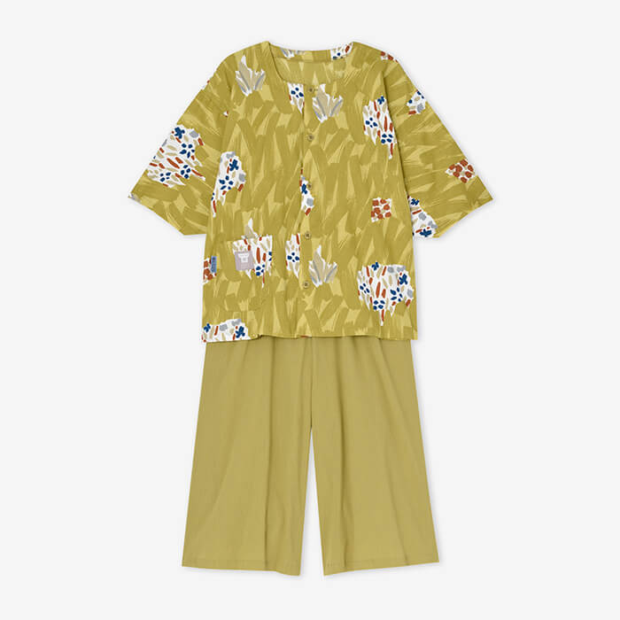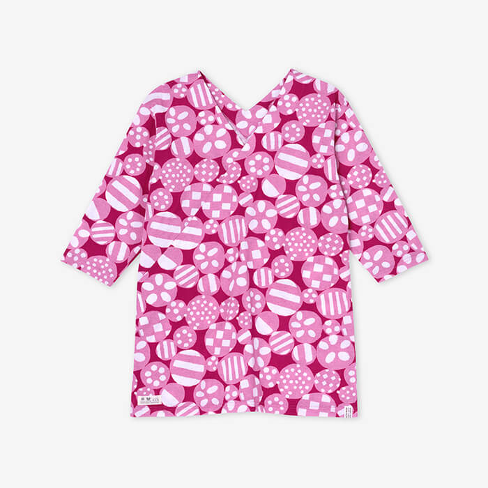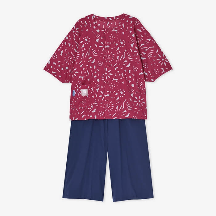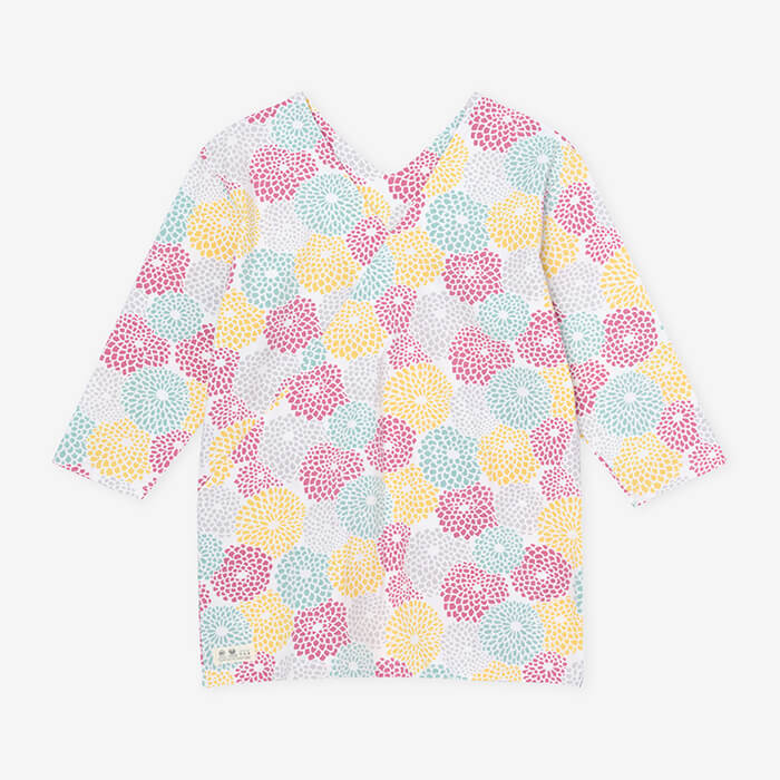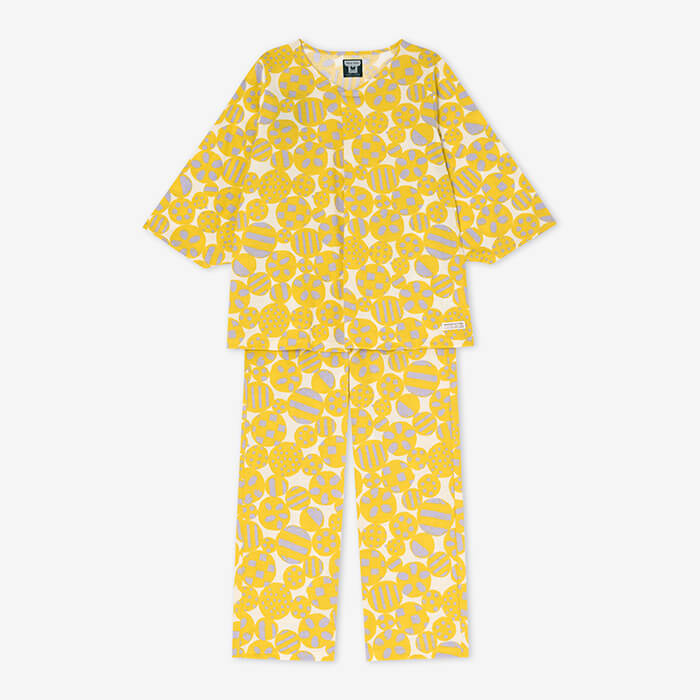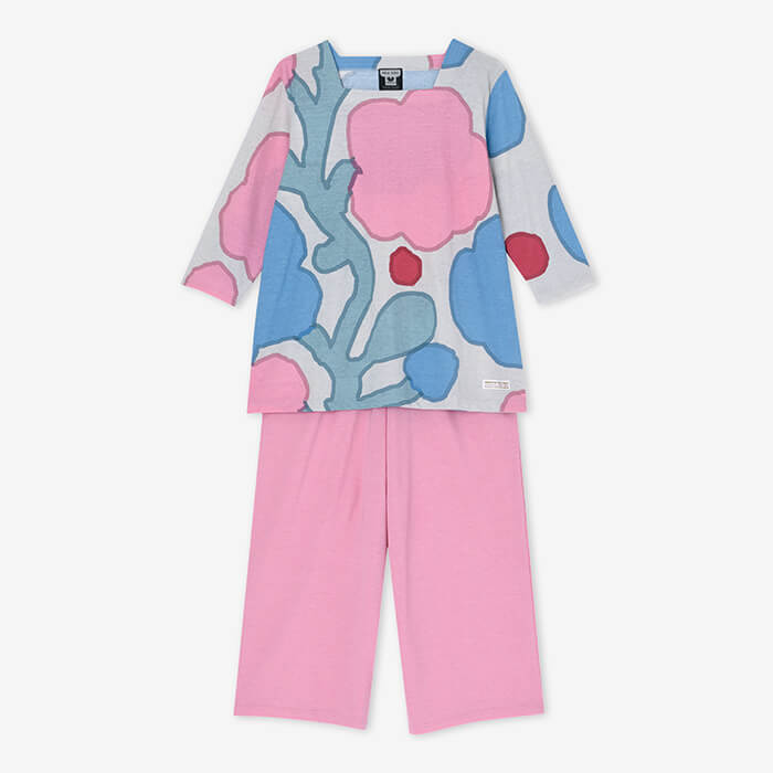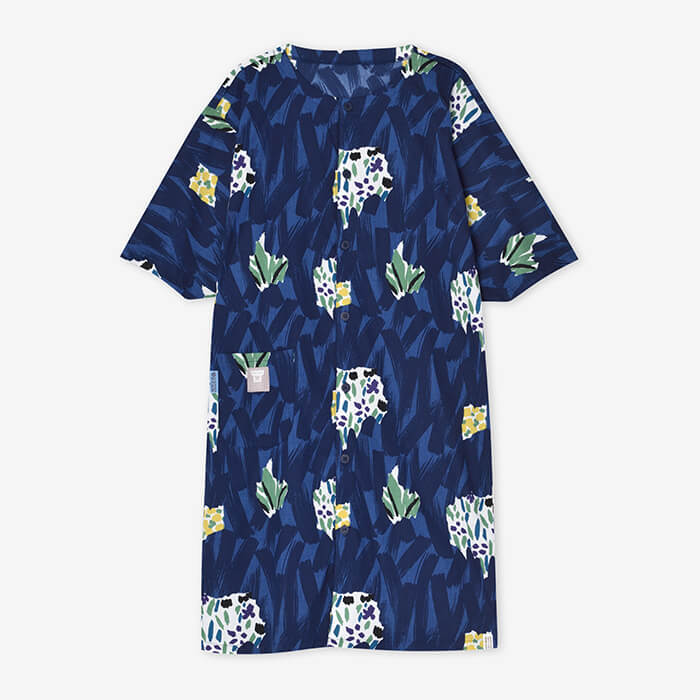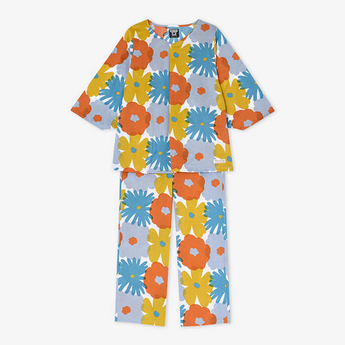 着物の衿袷わせや衿抜き、たっぷりとした袖が特徴の「筒袖」など、和服をイメージしたデザインを用いました。ポップなテキスタイルが日々の暮らしに彩りを添えてくれます。
