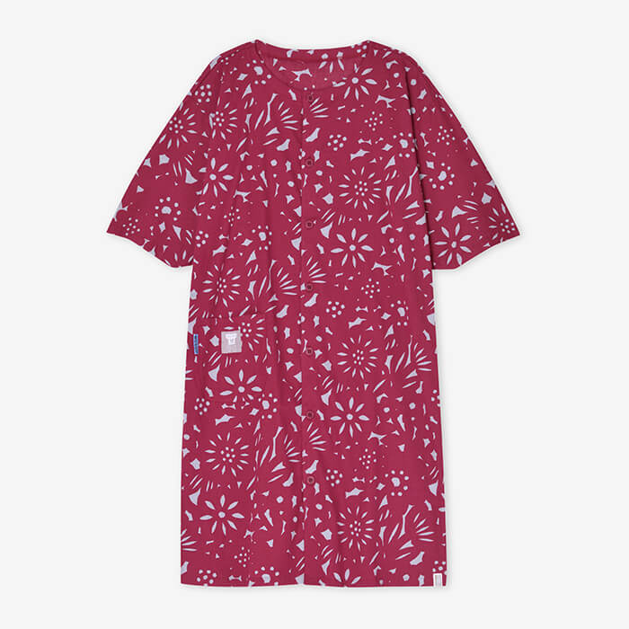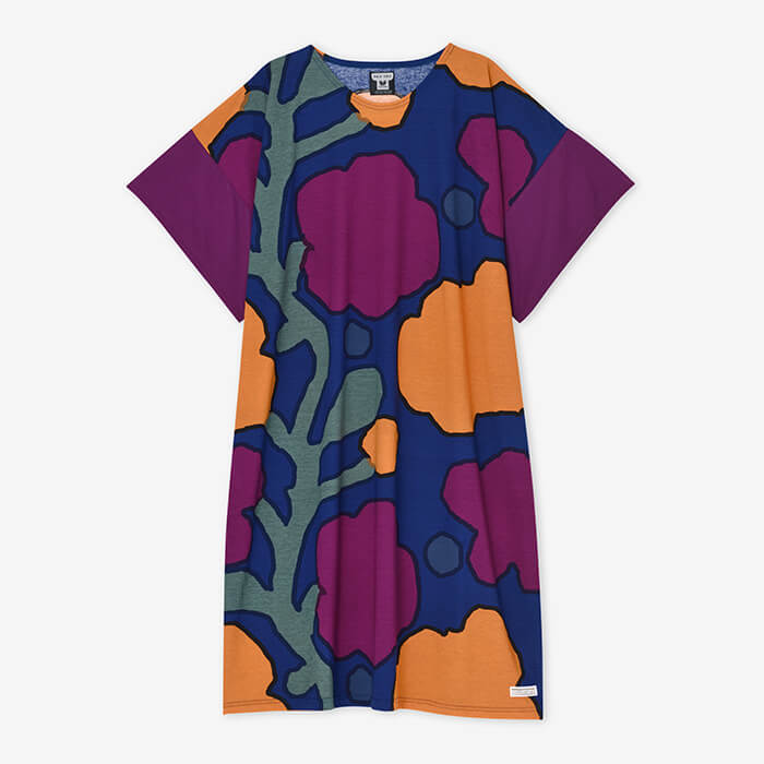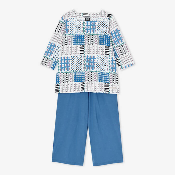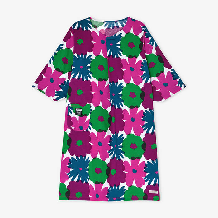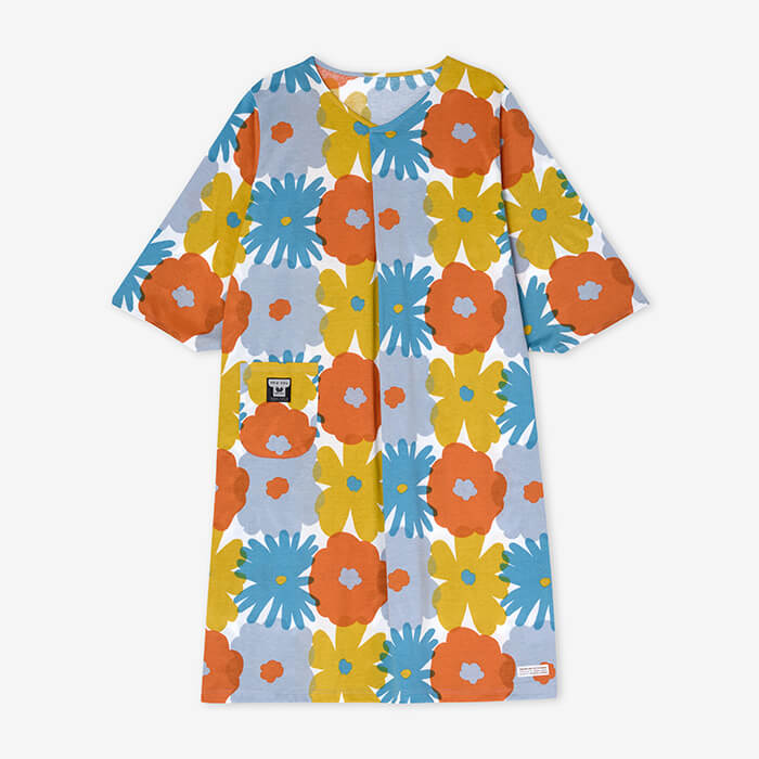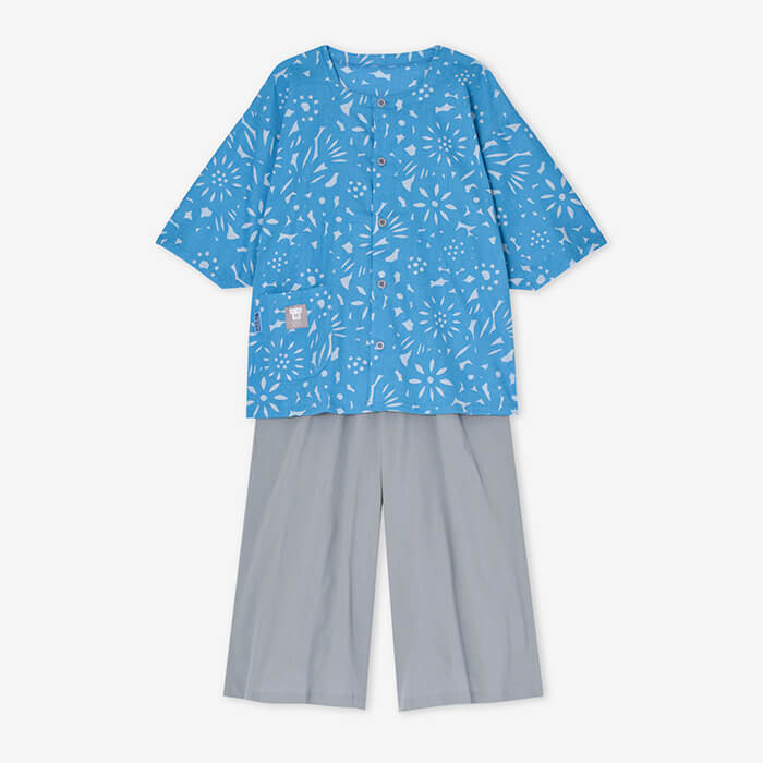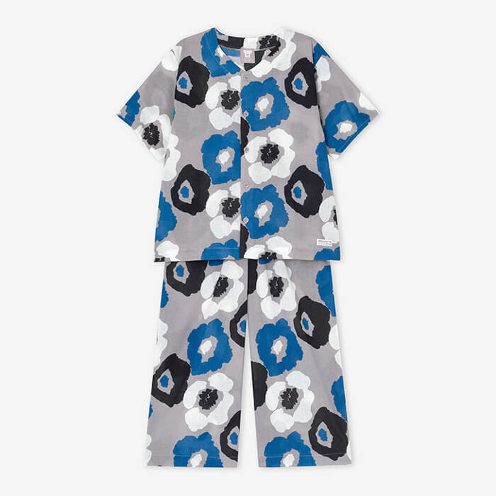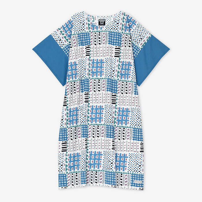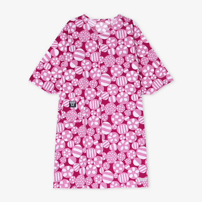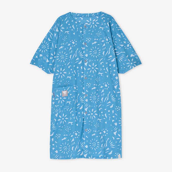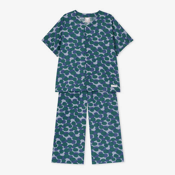 着物の衿袷わせや衿抜き、たっぷりとした袖が特徴の「筒袖」など、和服をイメージしたデザインを用いました。ポップなテキスタイルが日々の暮らしに彩りを添えてくれます。
