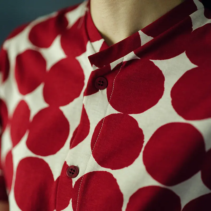 着物の衿袷わせや衿抜き、たっぷりとした袖周りなど、和服をイメージしたデザインを用いました。ポップなテキスタイルが日々の暮らしに彩りを添えてくれます。