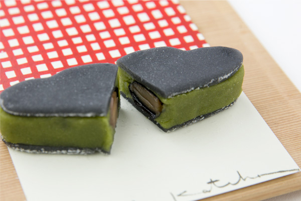 図案をかたどった黒い皮は、竹炭入りの求肥。抹茶をたっぷり混ぜ込んだ餡の中には丹波産の黒豆が3粒入っていて、味と食感のアクセントになっています。