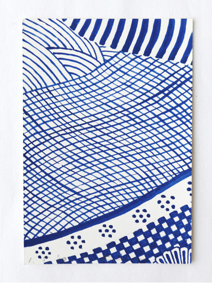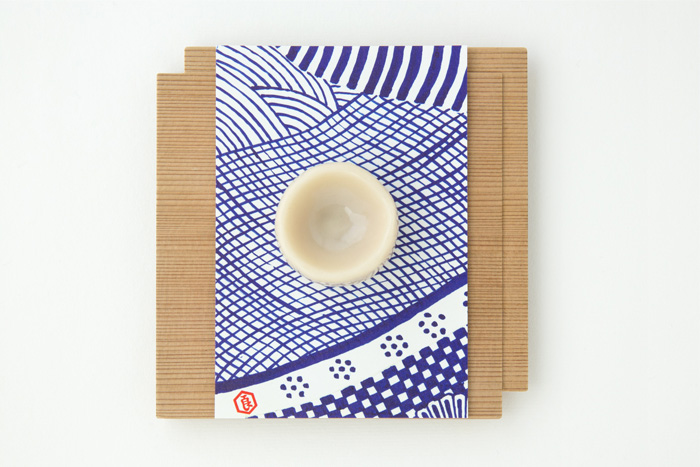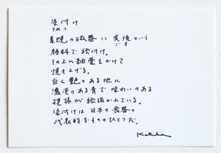 陶磁器に描かれた濃淡のある青い模様をモチーフにしています。ポストカードの模様が、お菓子の白い器に映りこんで染付けされるイメージでつくりました。