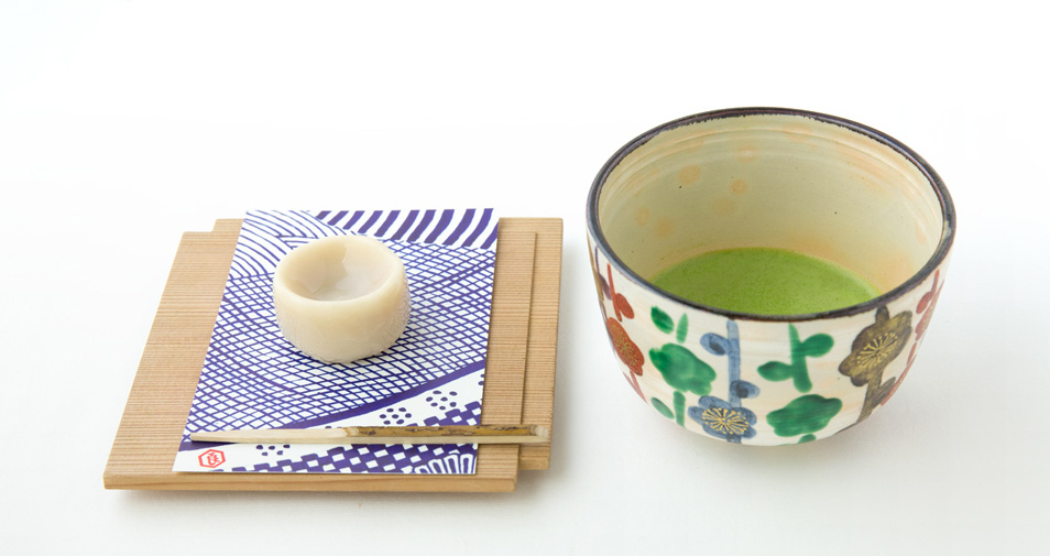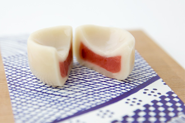 白い器は、つくねいもと白餡と求肥を混ぜた練り切りで出来ています。器に模様を映りこませる為に、表面に寒天をかけてあります。中に入っている梅餡には、梅のピューレと蜜漬けにした果肉を刻んだものが混ぜ込まれていて、隠し味に梅酒が使われています。