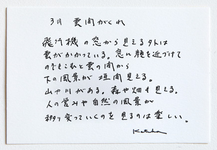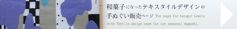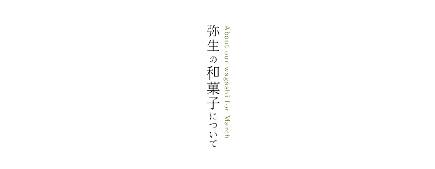 弥生のテキスタイルデザインは「雲間がくれ」。雲の間から見える地上の風景をテキスタイルにしたものです。餡を外郎で巻いた主菓子の断面は雲をイメージしています。