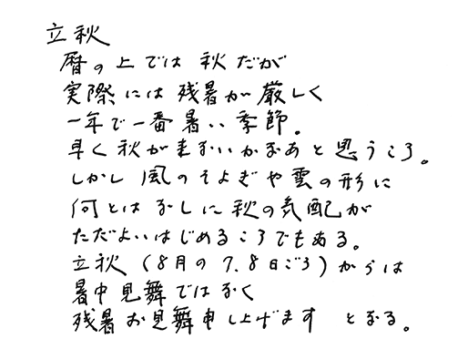 Late summer greeting starts from risshu, the first day of autumn (7th or 8th August) instead of just summer greetings.