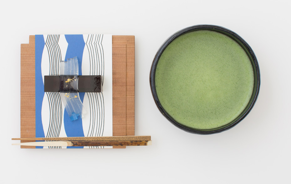 At Zaifu, we serve a cup of green matcha tea (or choice of coffee) and our wagashi based on our textile design.