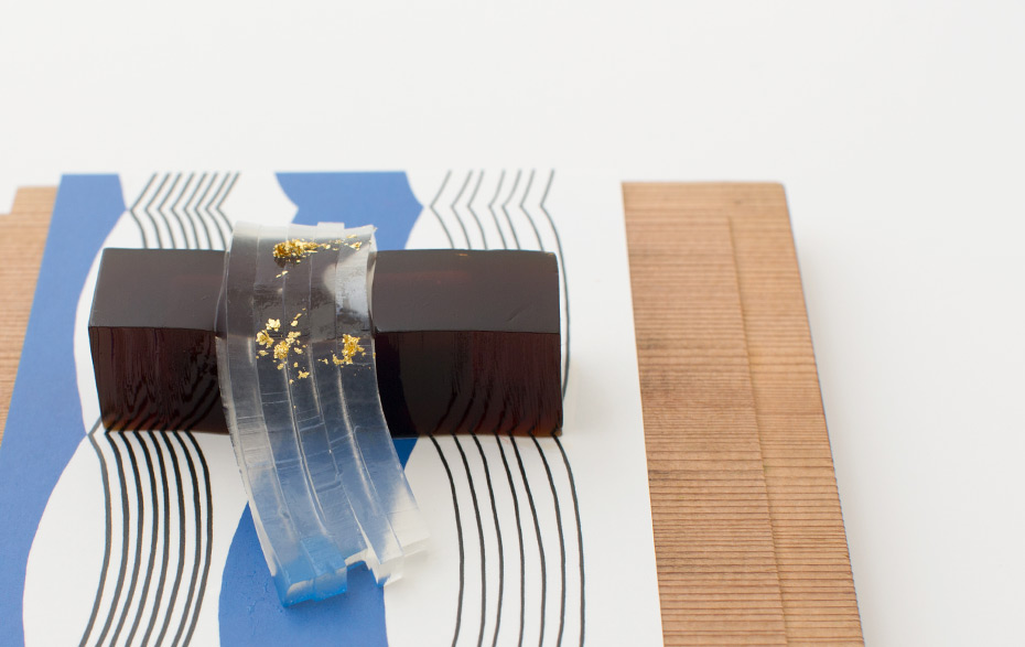 Mousse like sweetened bean paste mixed with kanten, agar-agar, is in kingyoku, made of agar-agar and brown sugar. The kuzukiri topped on it, which is also made of agar-agar mixed with kuzu from Yoshino, at Nara prefecture, and “Jurakudai” pure rice premium brew sake of Sasaki brewery.