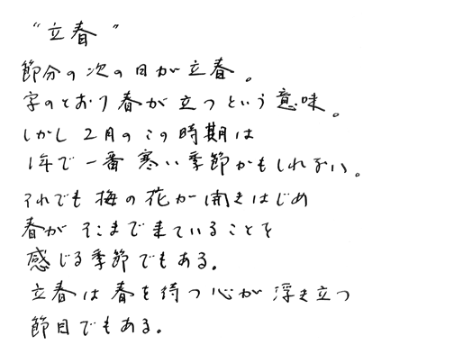 Risshun, the fist day of spring, is the day after Setsubun(3rd February). Risshun, written with two characters, means "stand" and "spring". It literally expresses "Spring Stands", however, it is probably the coldest period in the year.