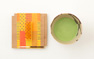At Zaifu, we serve a cup of green matcha tea (or choice of coffee) and our wagashi based on our textile design.
