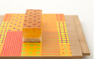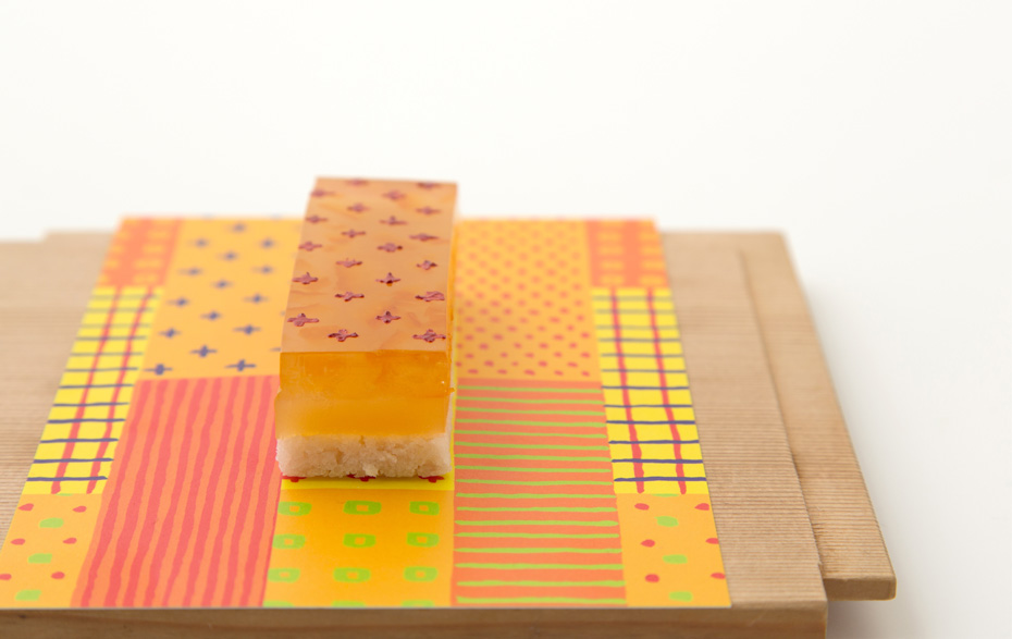 It has three layers; kingyokukan, made of agar with sugar and syrup, mixed with citrus peer, shiro-youkan, white sweetened bean jelly paste, added a lot of the citrus juice, and murasame which is made of white sweetened bean paste mixed with rice flour and sault. The pattern “+” is drawn by hand made of red yeast rice and powder of dried gardenia.