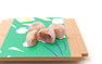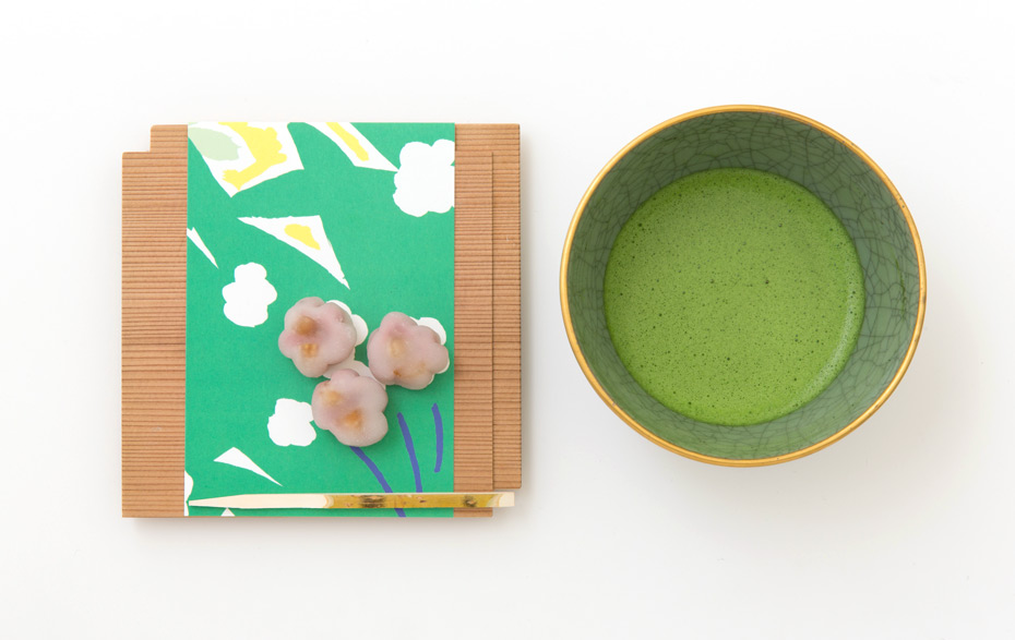 At Zaifu, we serve a cup of green matcha tea (or choice of coffee) and our wagashi based on our textile design.