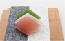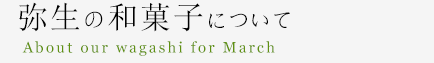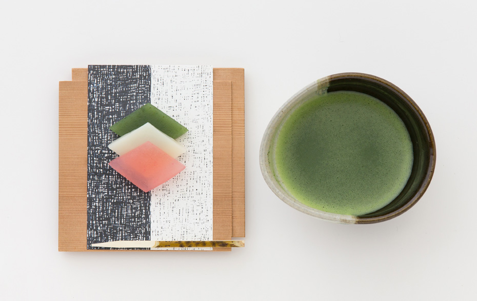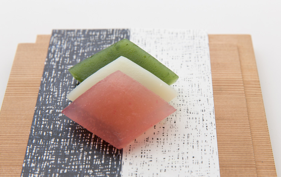 March's wagashi is inspired by Hishimochi, used for decoration at the Girl's Festival.We prepared three types of wagashi with different colors and flavor. They are mainly made of Kingyoku, which containing Kanten (agar) heated with sugar and starch syrup. Pink one has fruity flavor with flesh peach and the puree, white one has milk, condensed milk, and apricot-flavored liqueur to make it rich apricot taste. A white sweetened bean paste and Yomogi, a kind of fragrant herbs, are added to the green one to make it like a sweet bean jelly.Normally Hishimochi is piled up in layers. However, we serve them slanted down to enjoy tasting three different colors and flavor separately.