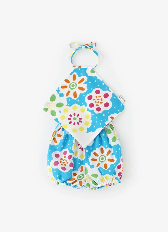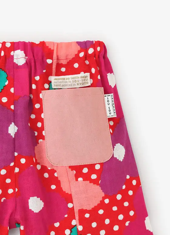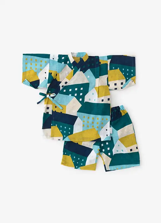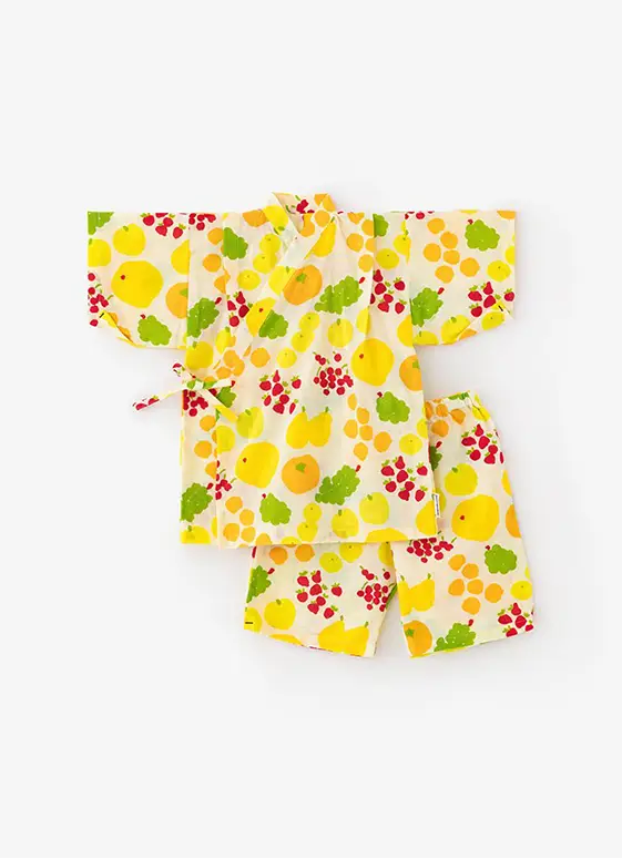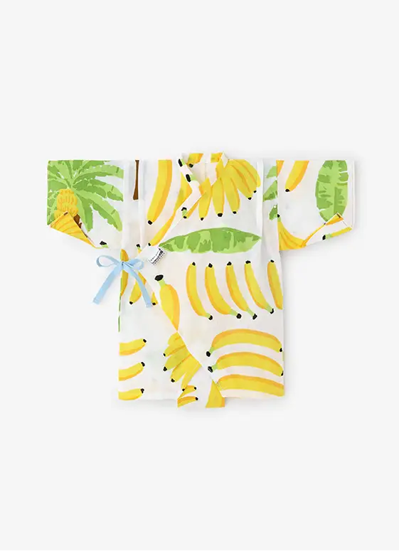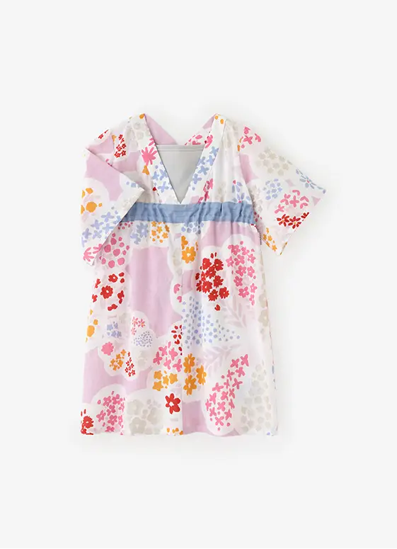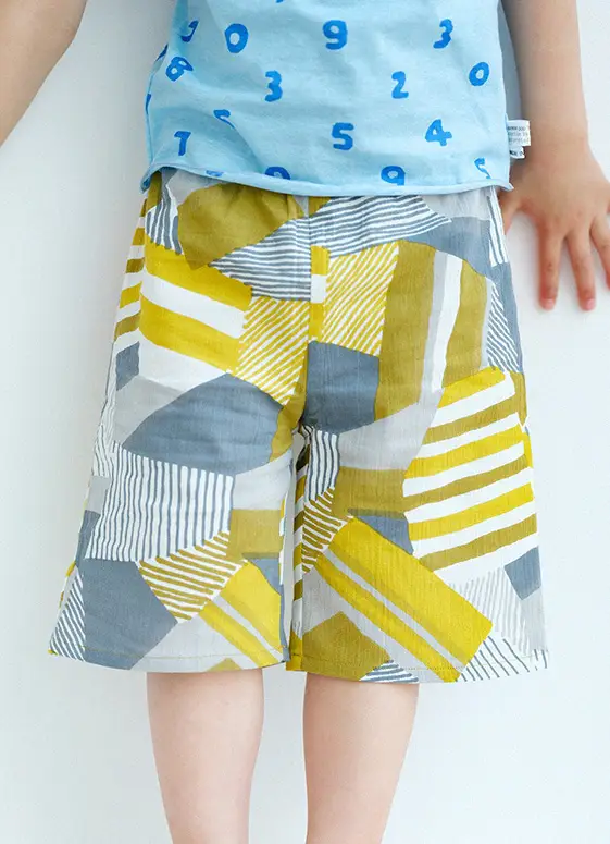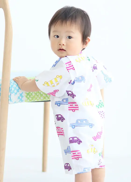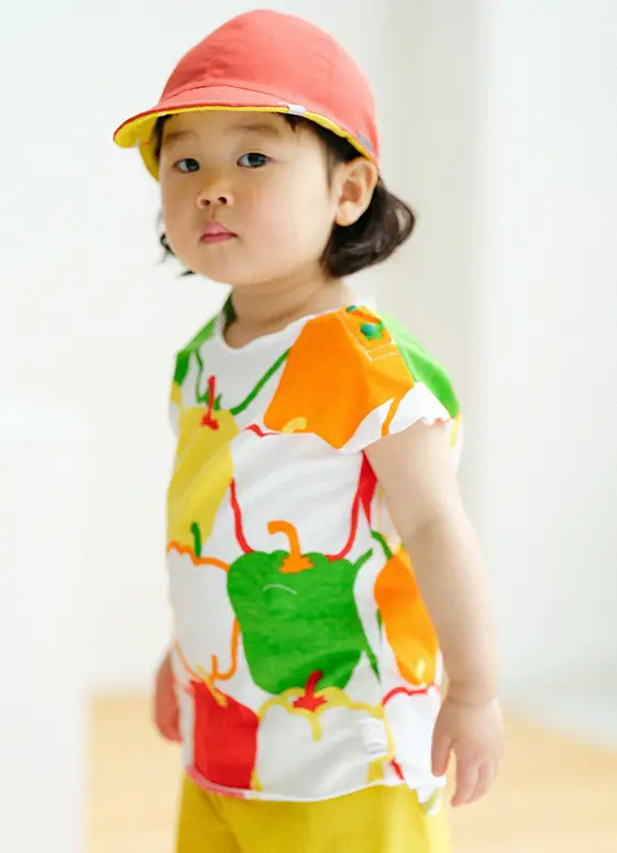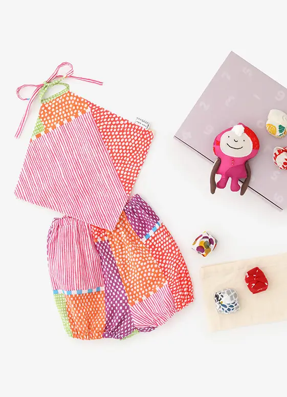 子ども服らしいポップで明るいテキスタイルデザインでアクセントに。また、吸水性と速乾性にも優れており、汗をかいたお子さまの肌もさらりと快適にやさしく包み込んでくれます。手ぬぐいの巾をそのまま活かして縫製した衣類もこども服ならではです。