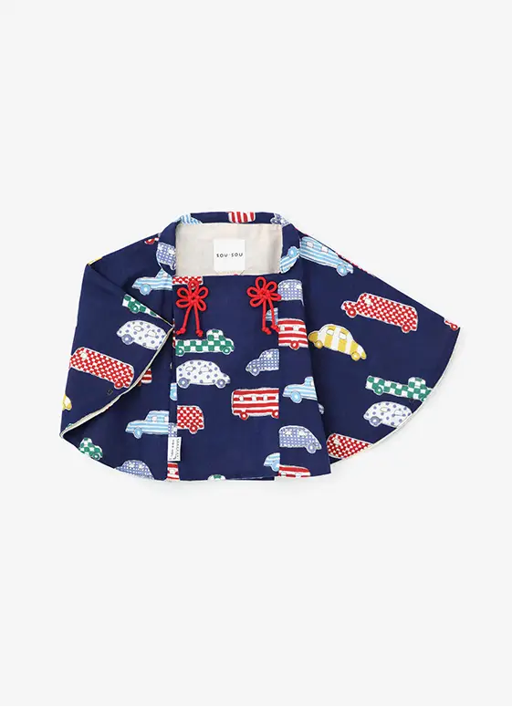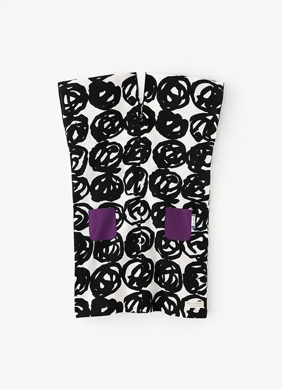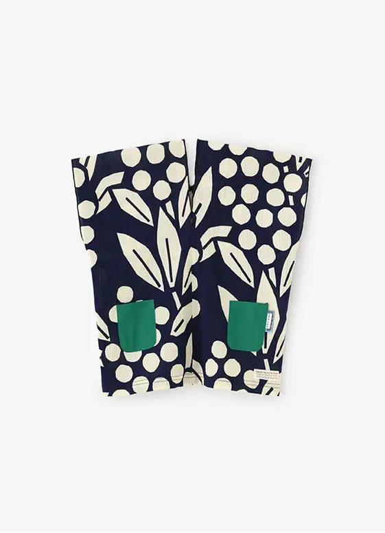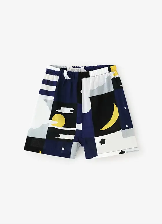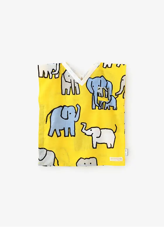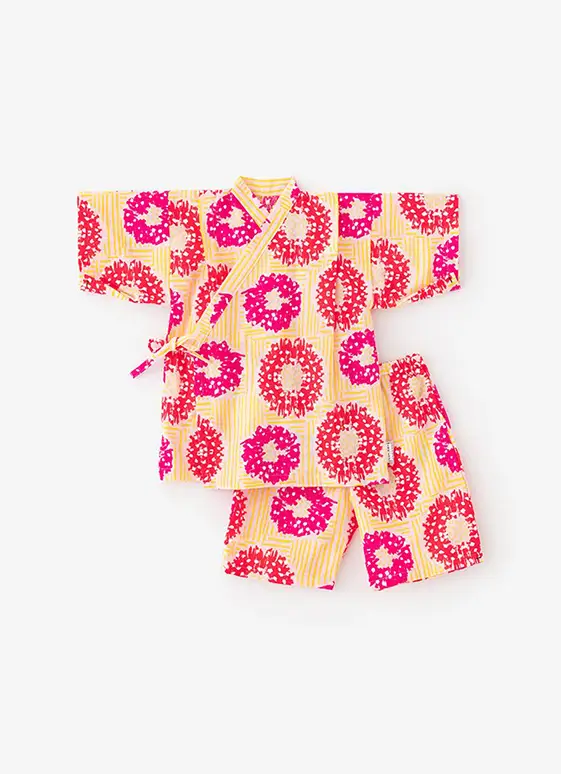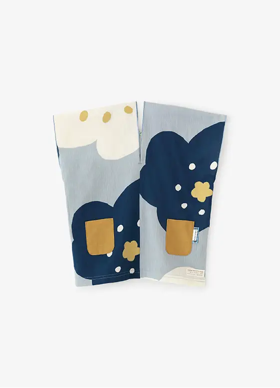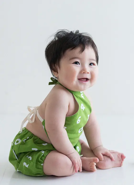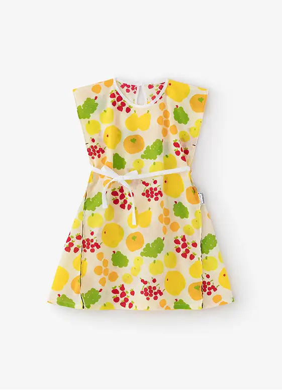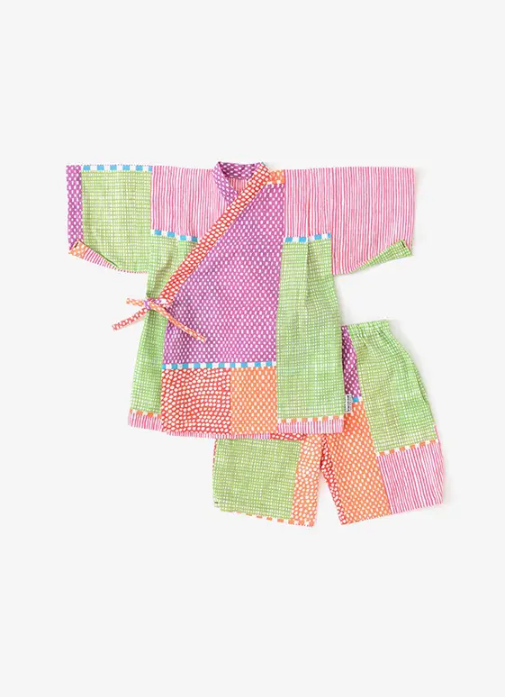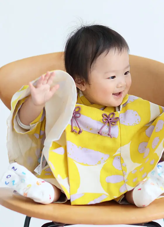 子ども服らしいポップで明るいテキスタイルデザインでアクセントに。また、吸水性と速乾性にも優れており、汗をかいたお子さまの肌もさらりと快適にやさしく包み込んでくれます。手ぬぐいの巾をそのまま活かして縫製した衣類もこども服ならではです。