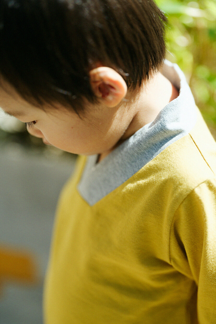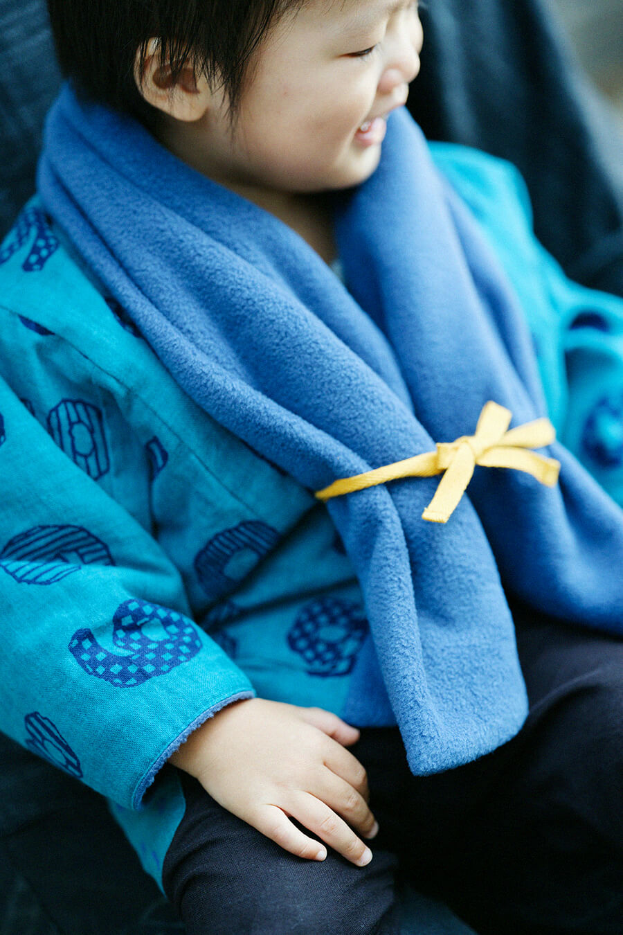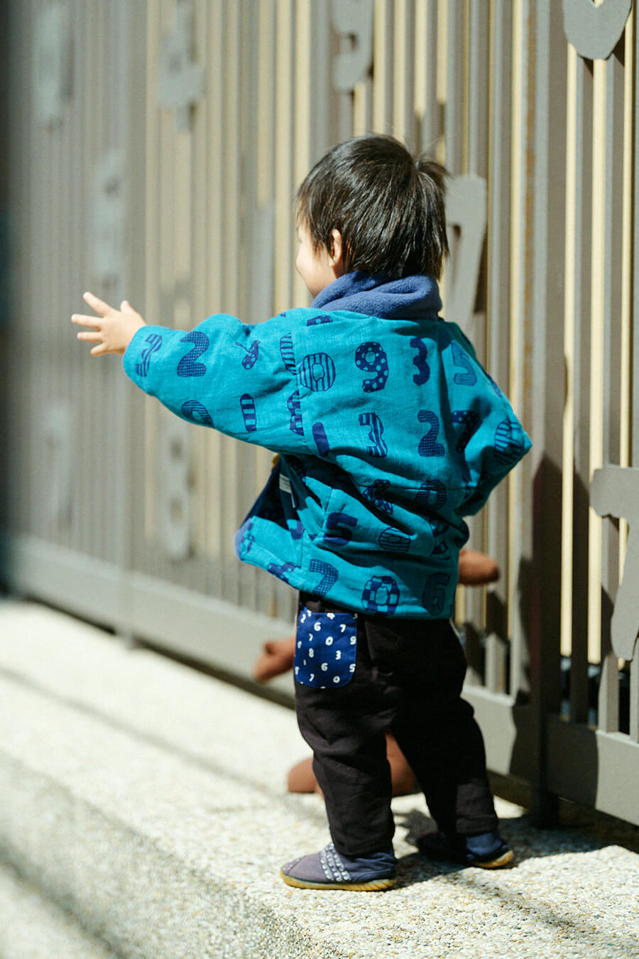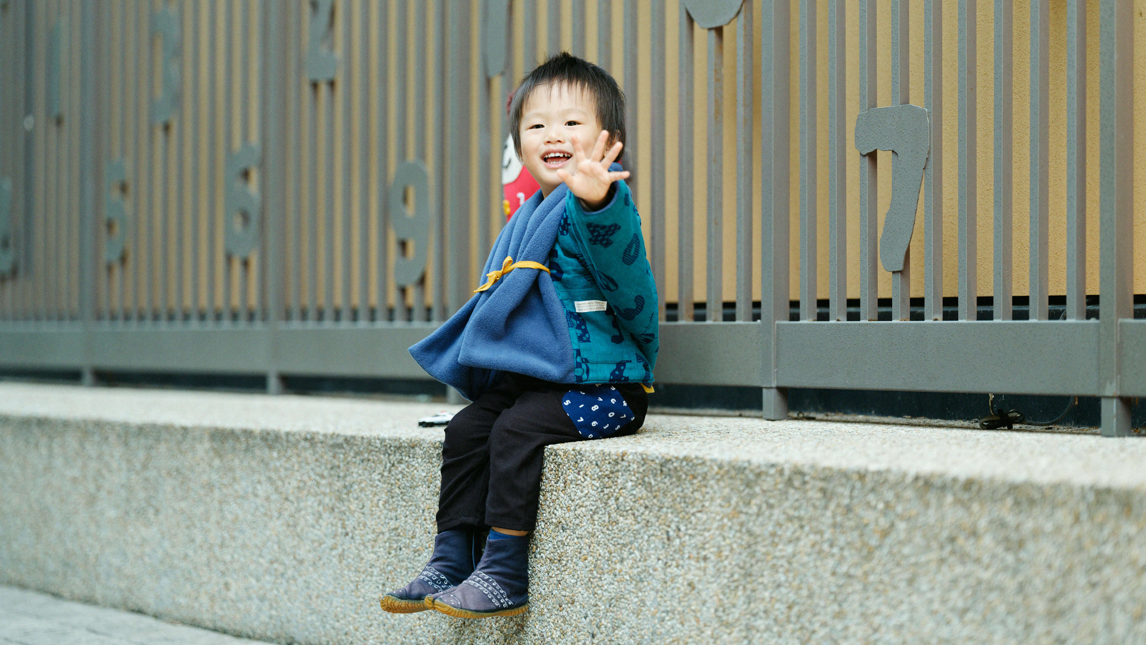 3歳でも着られる羽織「こどもじりそで」は初めての七五三にぴったり。ちらっと見えるインナーの黄色がポイントです。動きやすいもんぺと合わせて、小さくても一丁前に決めて!