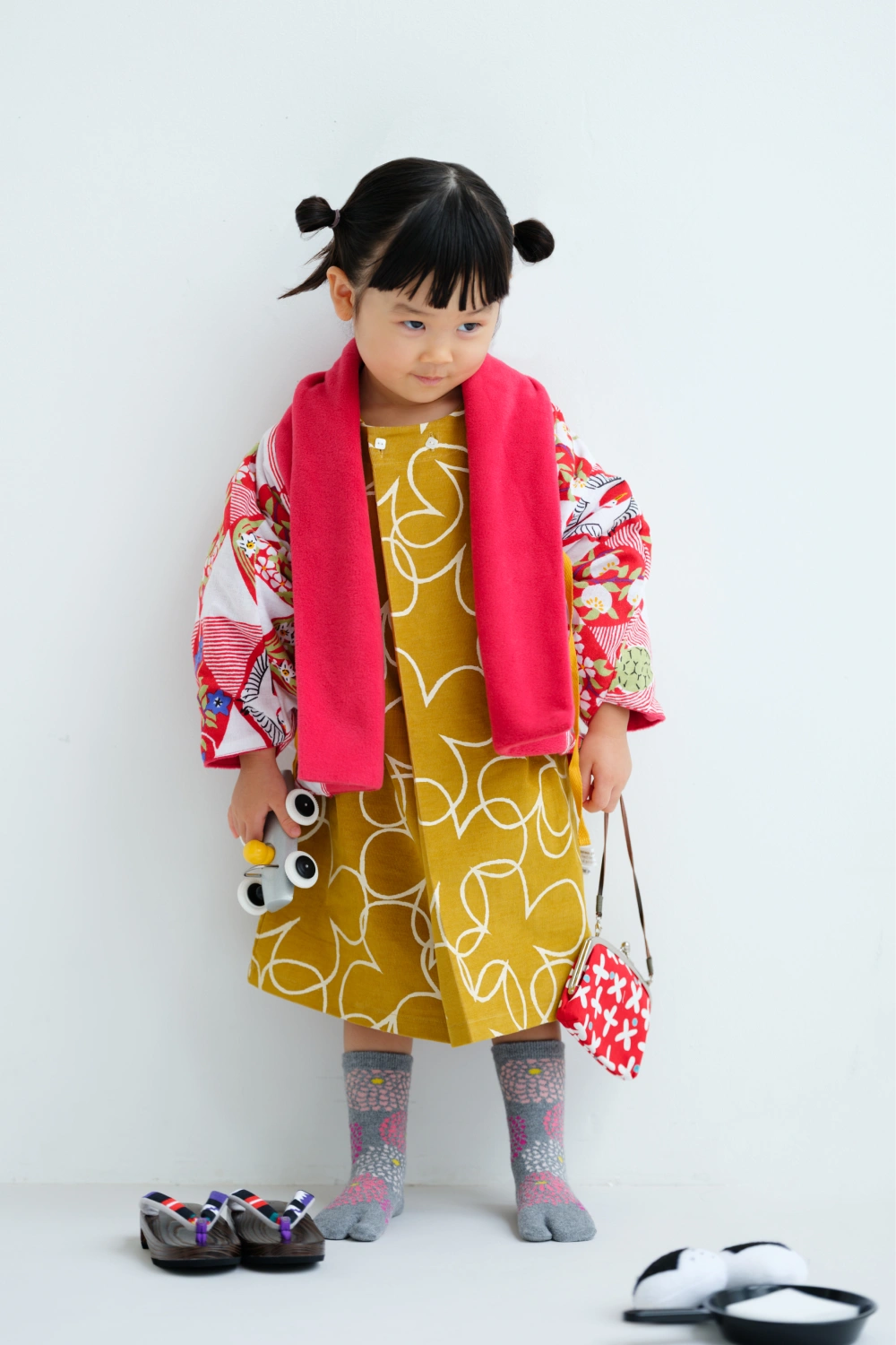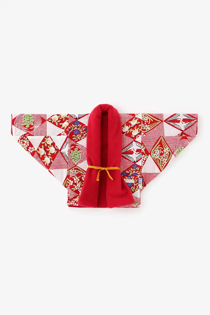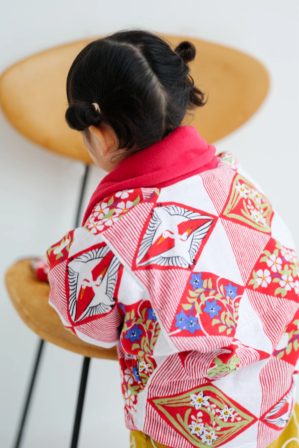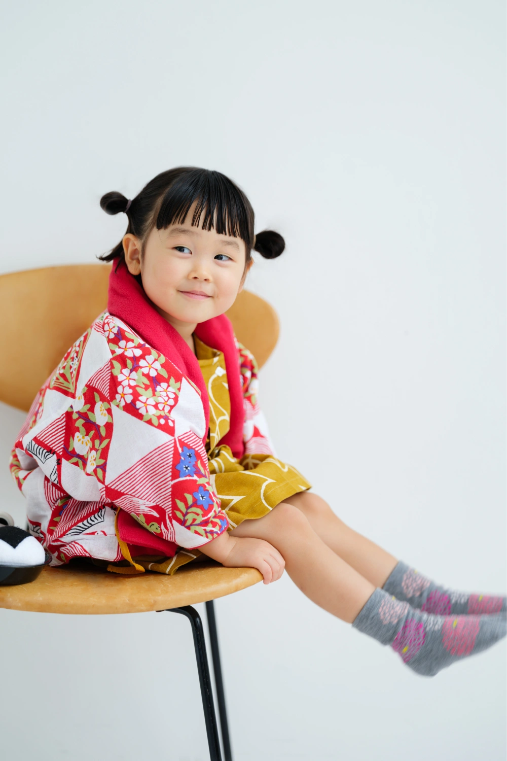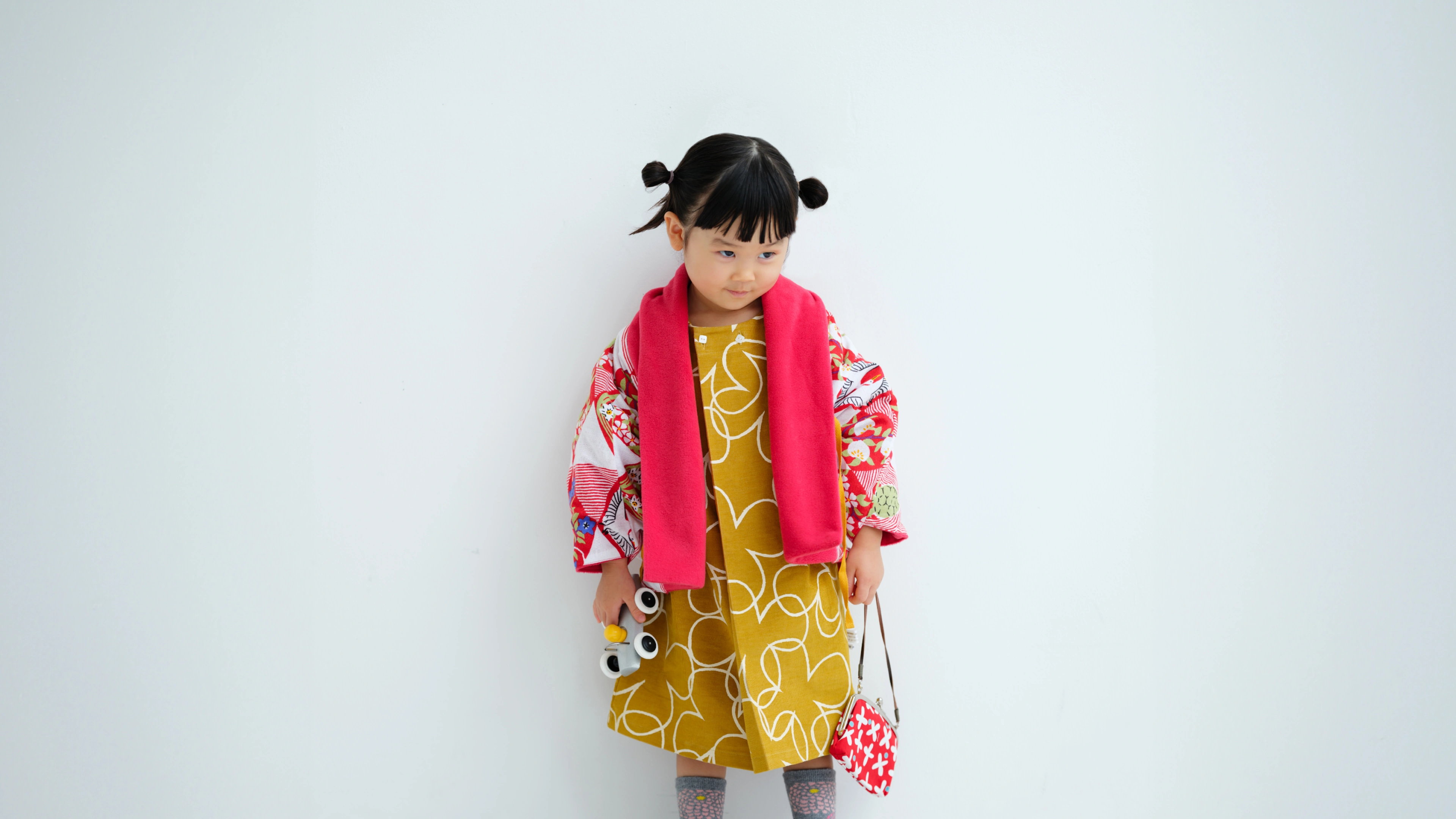 テキスタイルも紅白の色味もおめでたい、羽織が主役の七五三にピッタリコーデ。さっと羽織るだけで粋な装いのできあがり。