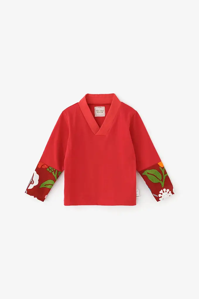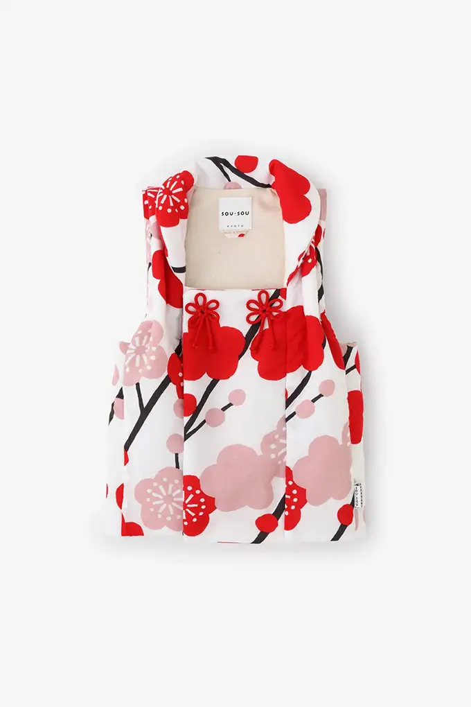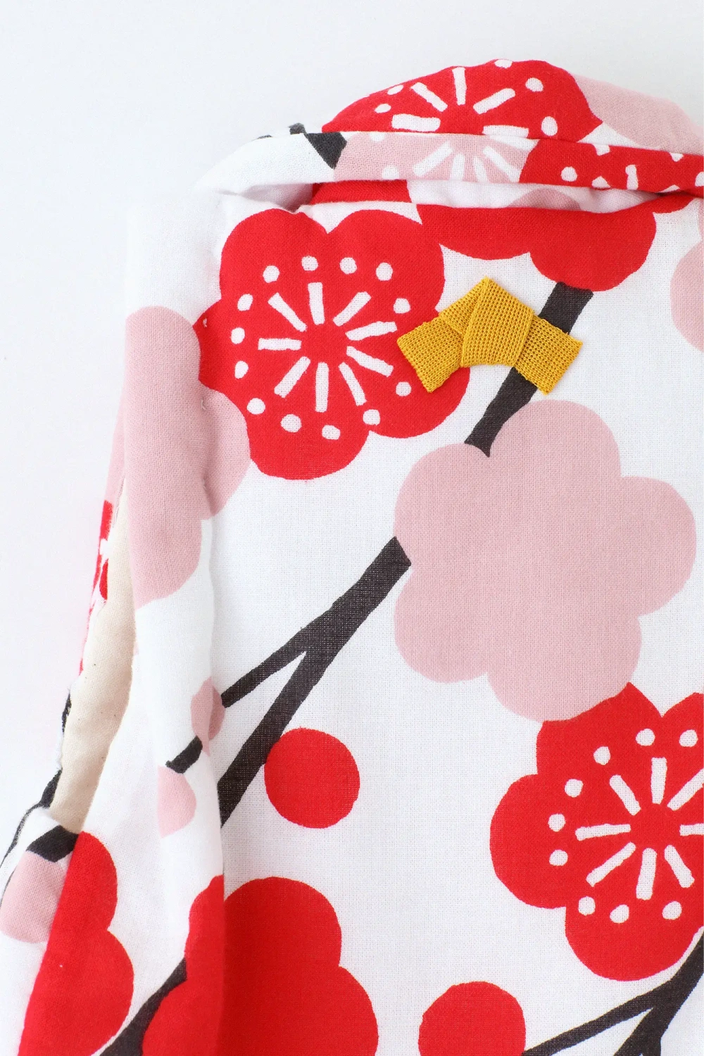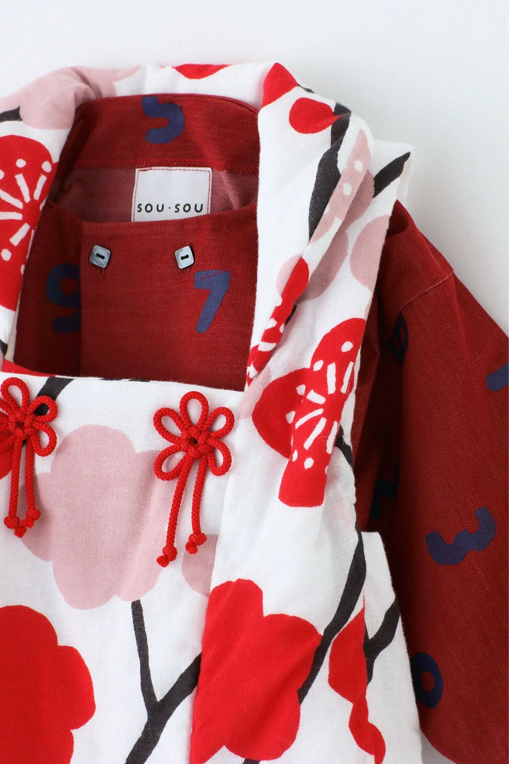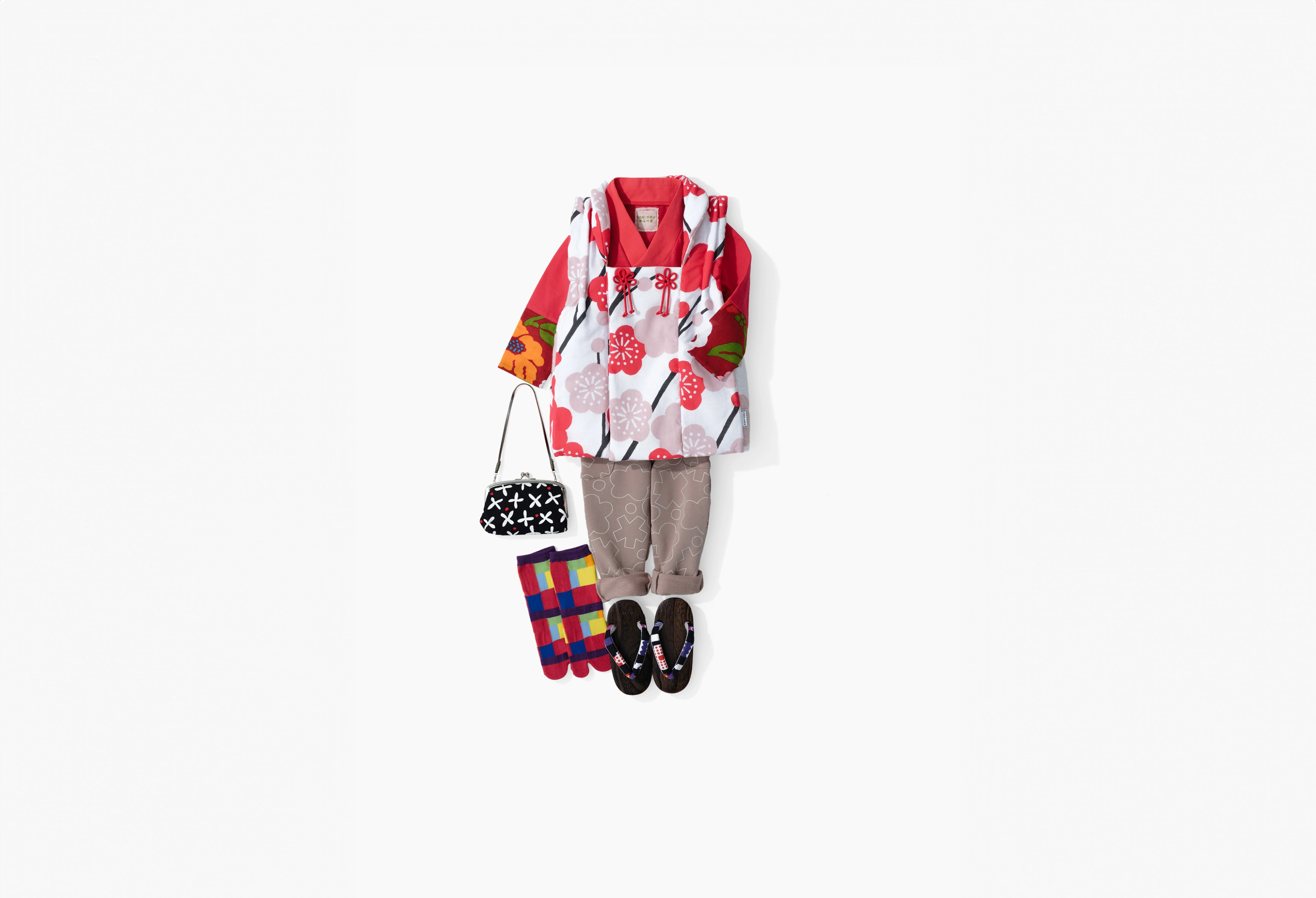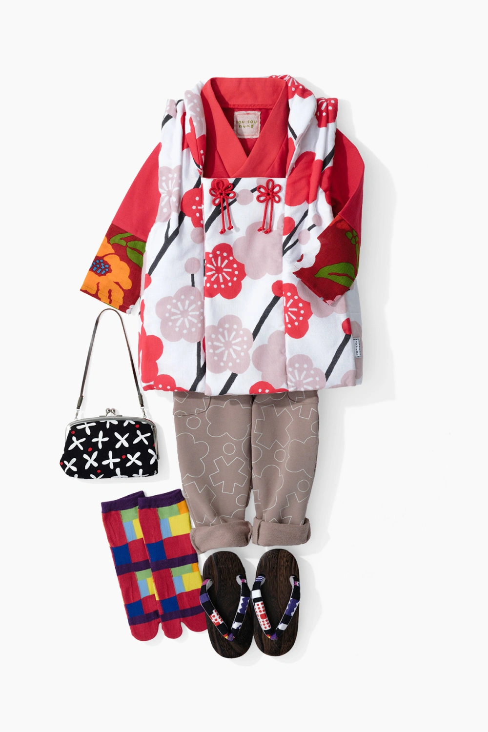 3歳の七五三ならではの「ひふ」。わらべぎらしいポップなテキスタイルデザインと、ふんわり柔らかな肌触りが特徴の紅白でおめでたいコーディネート!