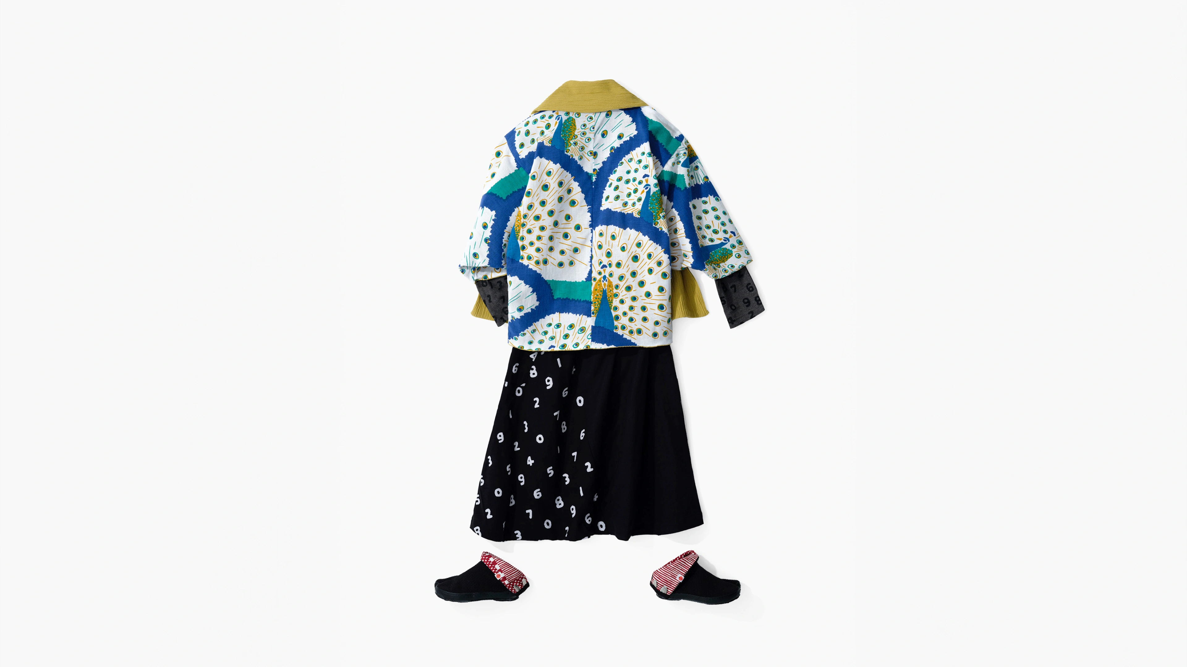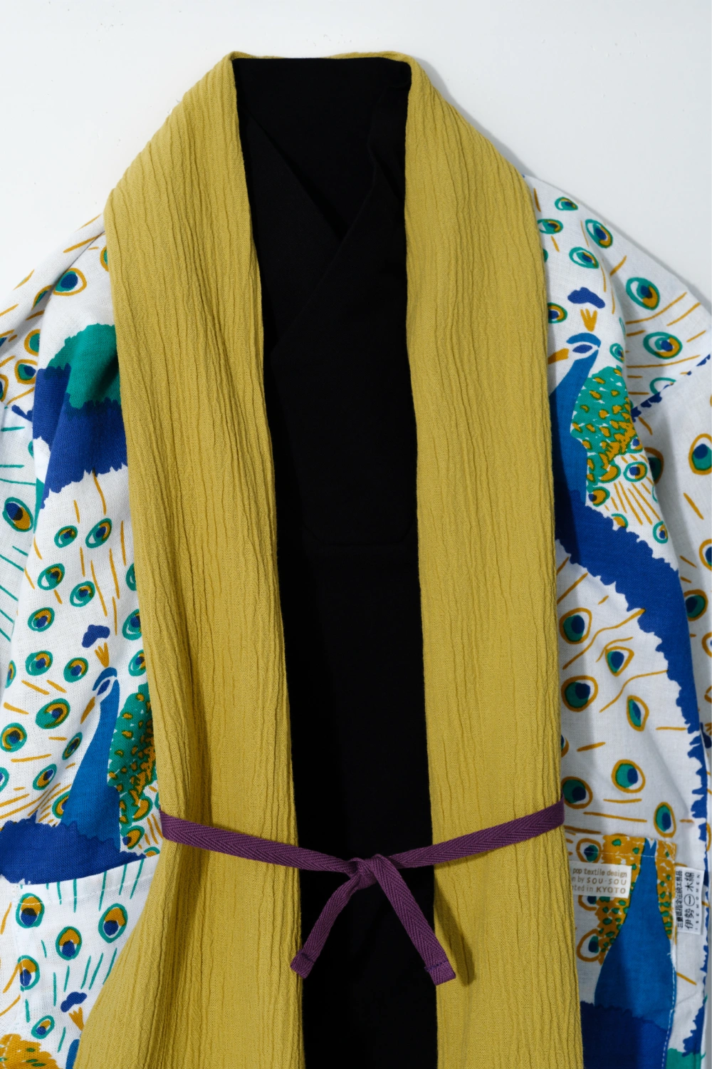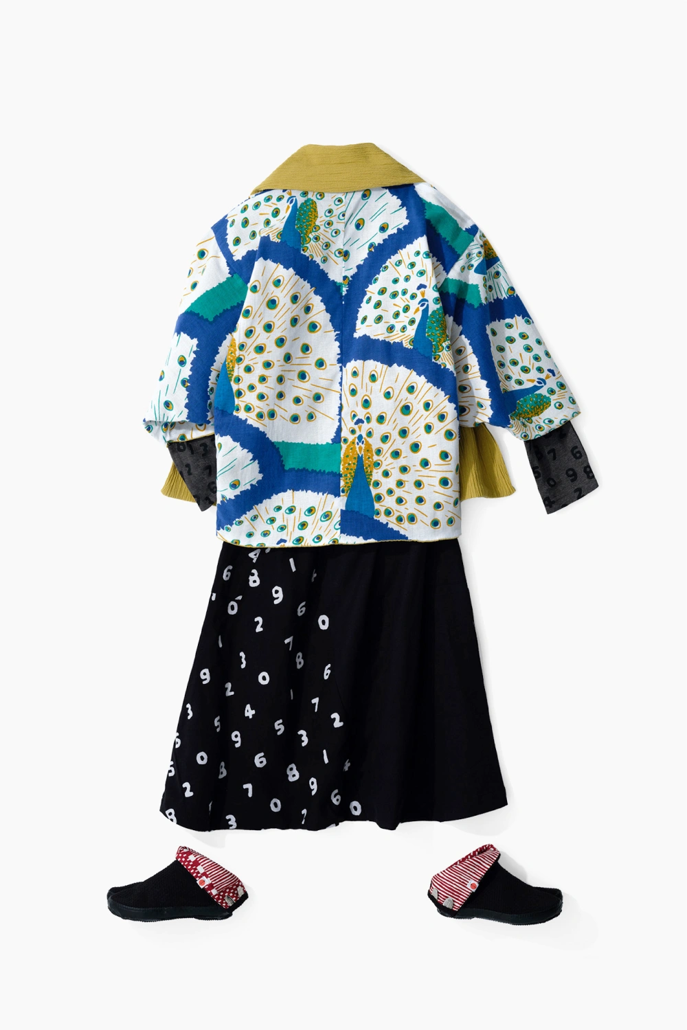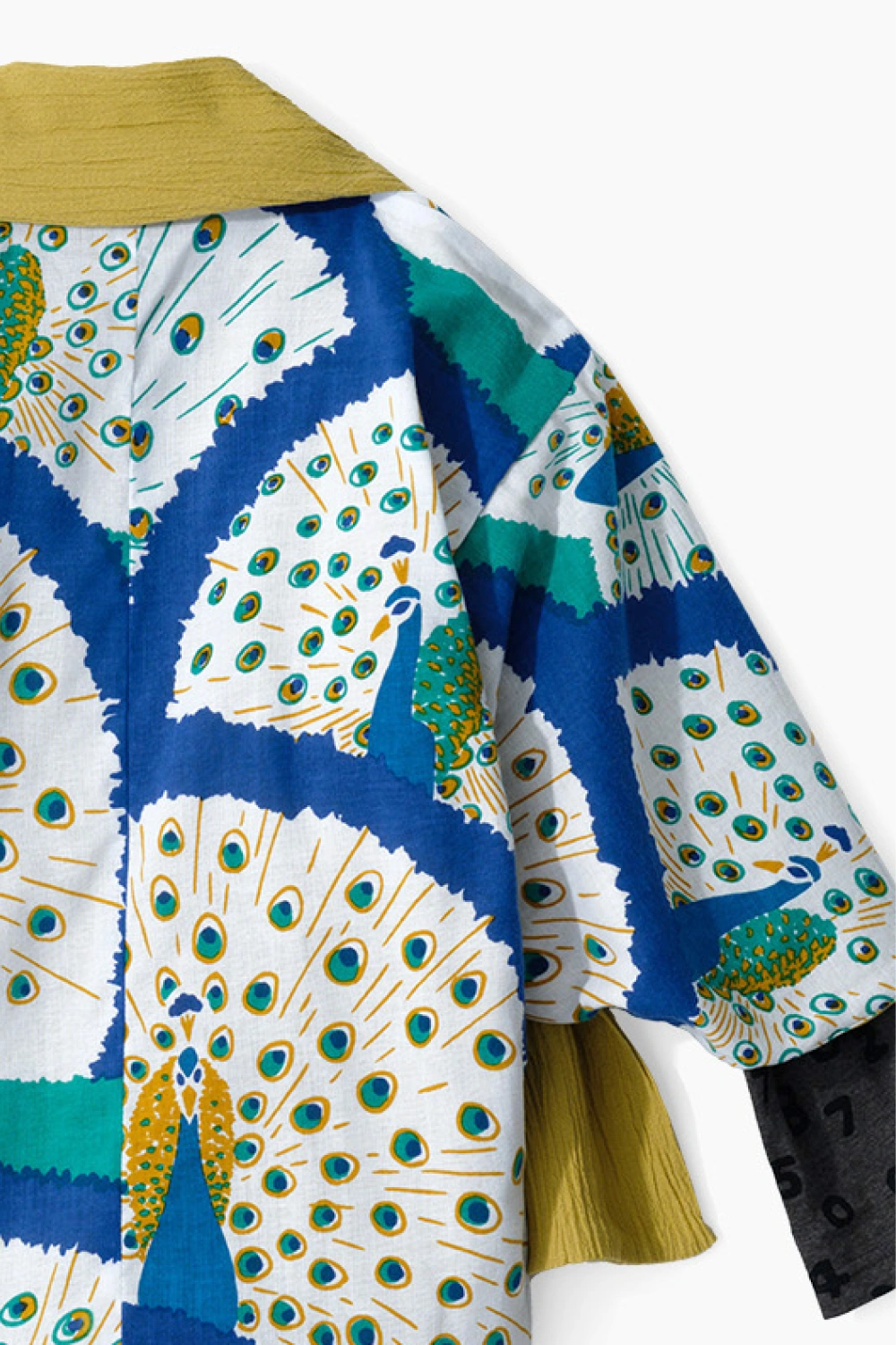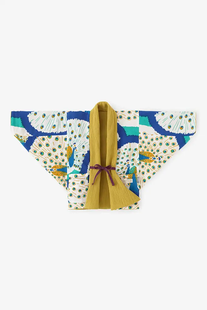 1枚羽織るだけで様になる「こどもじりそで」は、インパクト抜群「くじゃく」のテキスタイル。リバーシブルなのでシックなスタイルにも変更可能です。