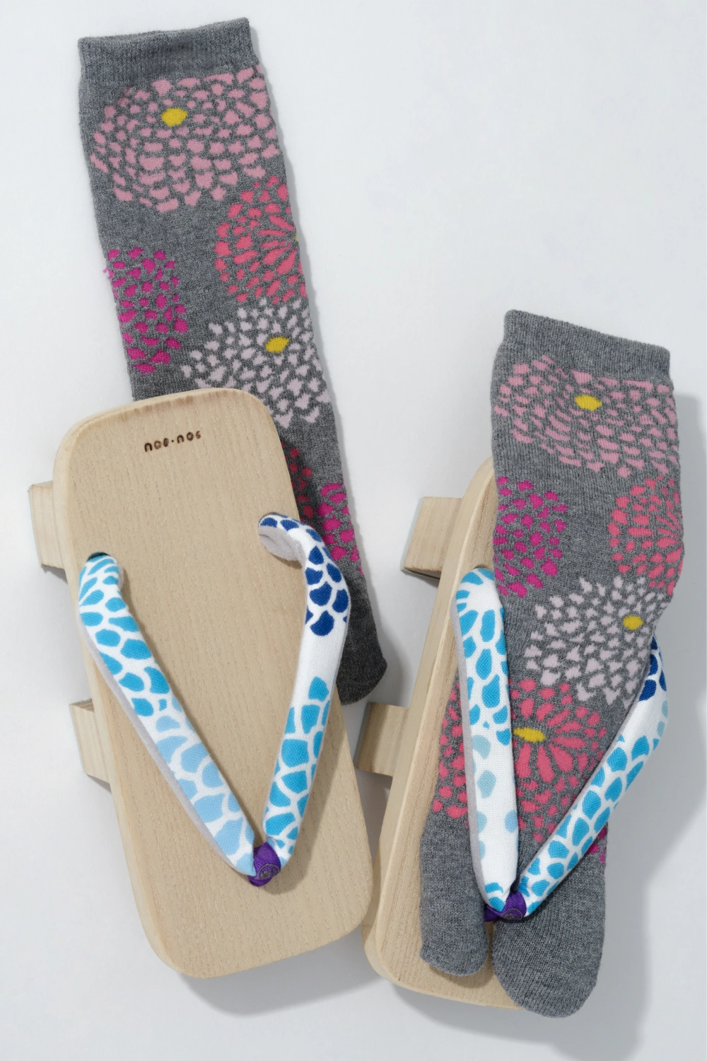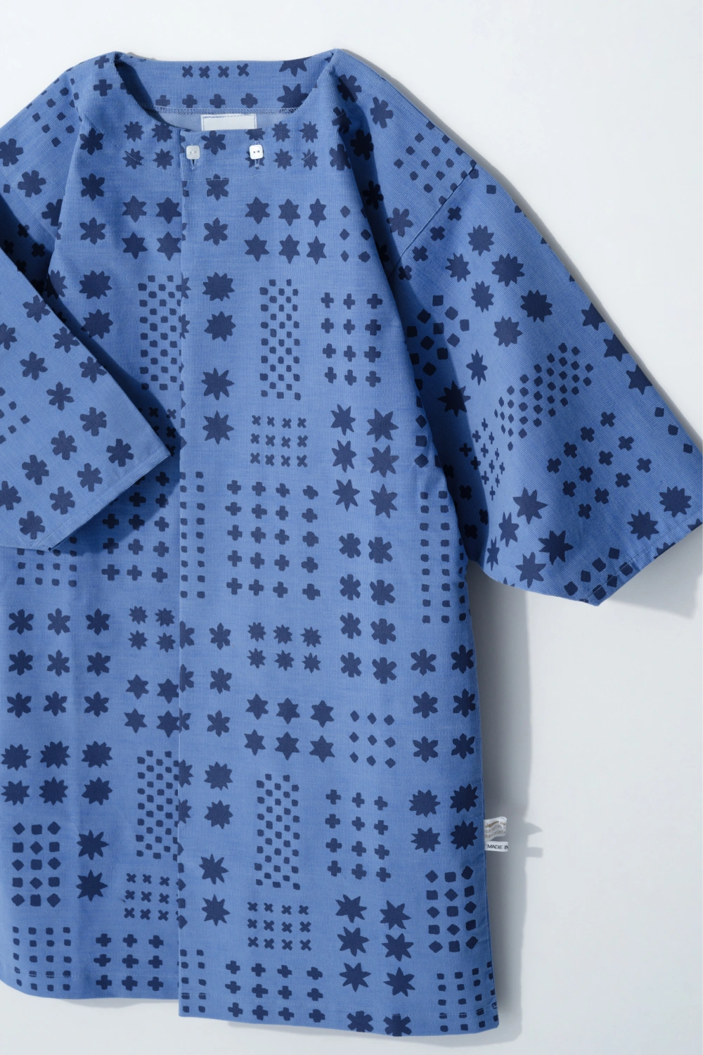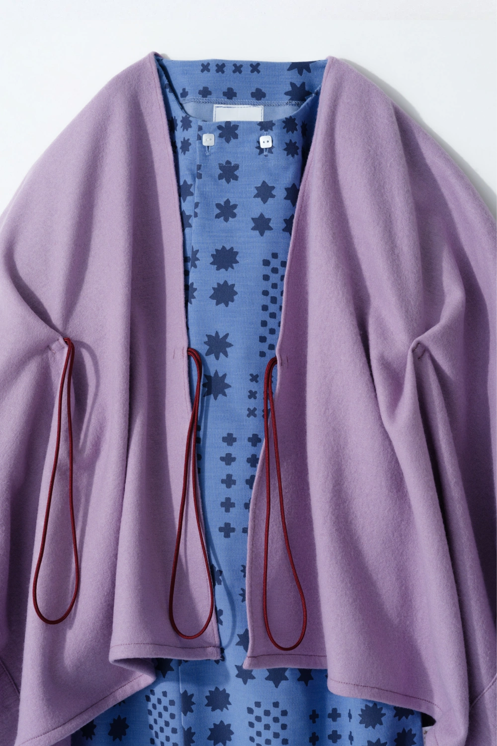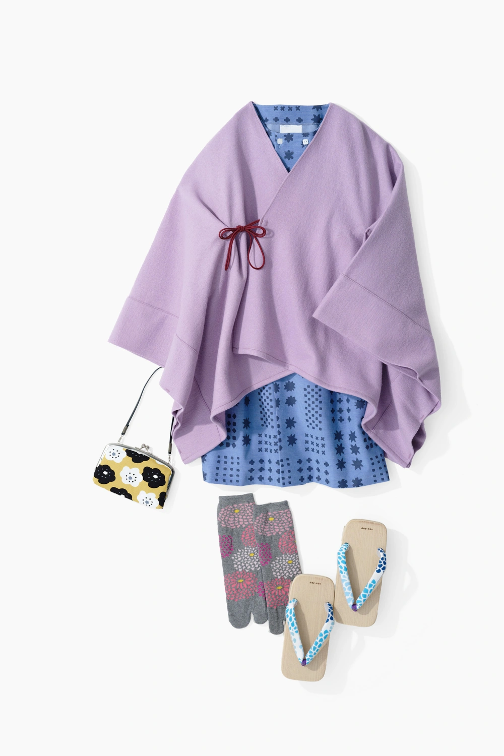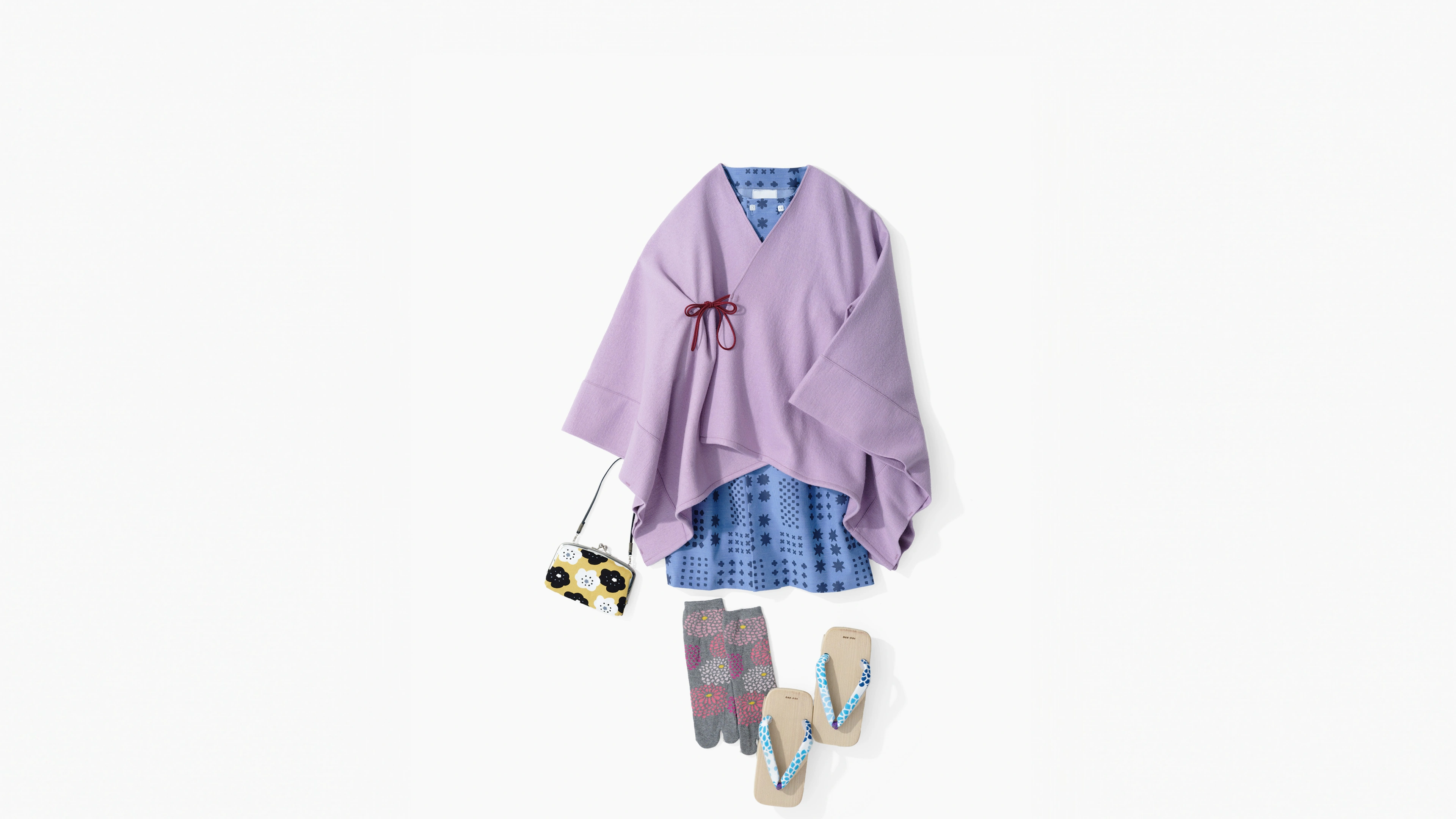 「きさらぎ」を羽織るだけで一気に和の印象に。羽織とワンピースの色味のコントラストが目をひく華やかなコーディネート。