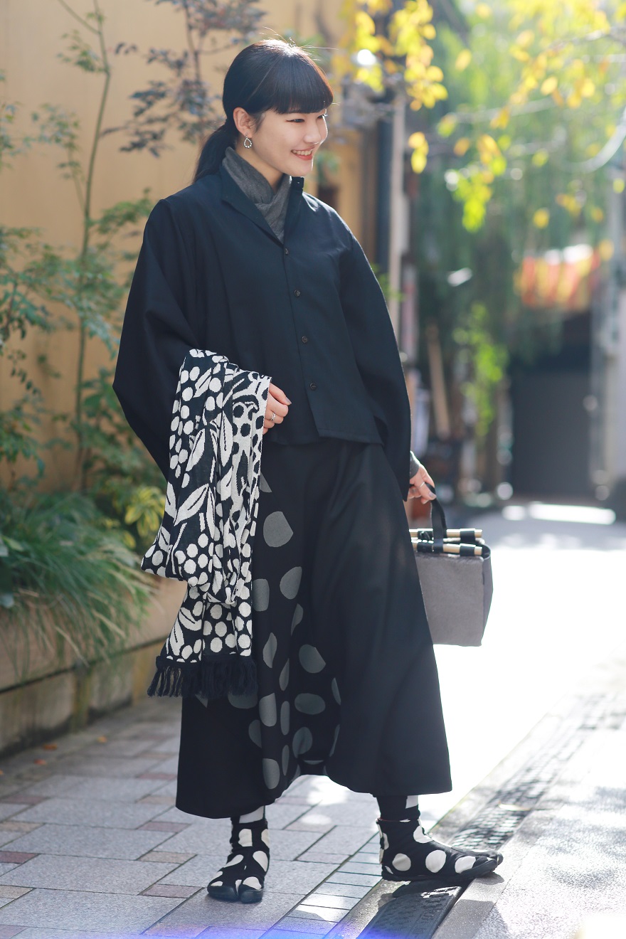 定番の黒を「とりあえず」で着ないという鳥飼。わきまえたポップな「すいぎょく」で楽しい足し算で気分転換。水玉を重ねて、黒でもカジュアルに傾けます。(しょうしょう)
